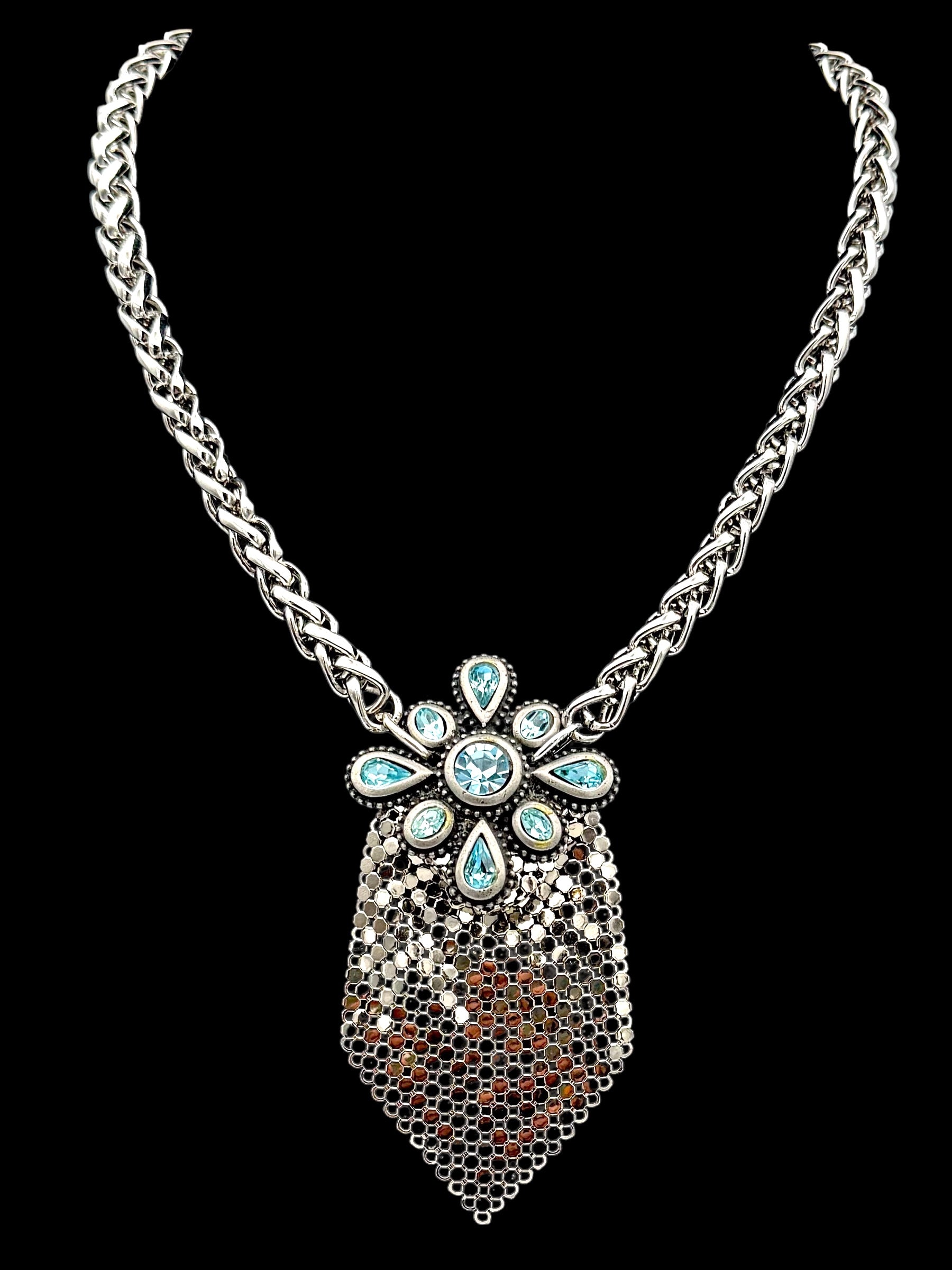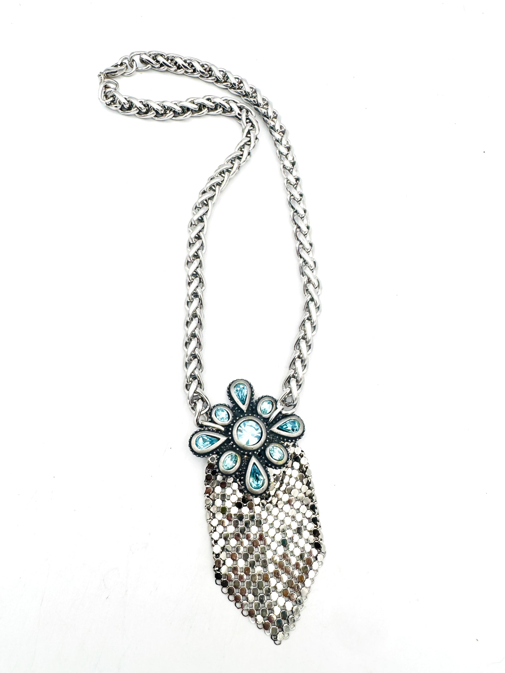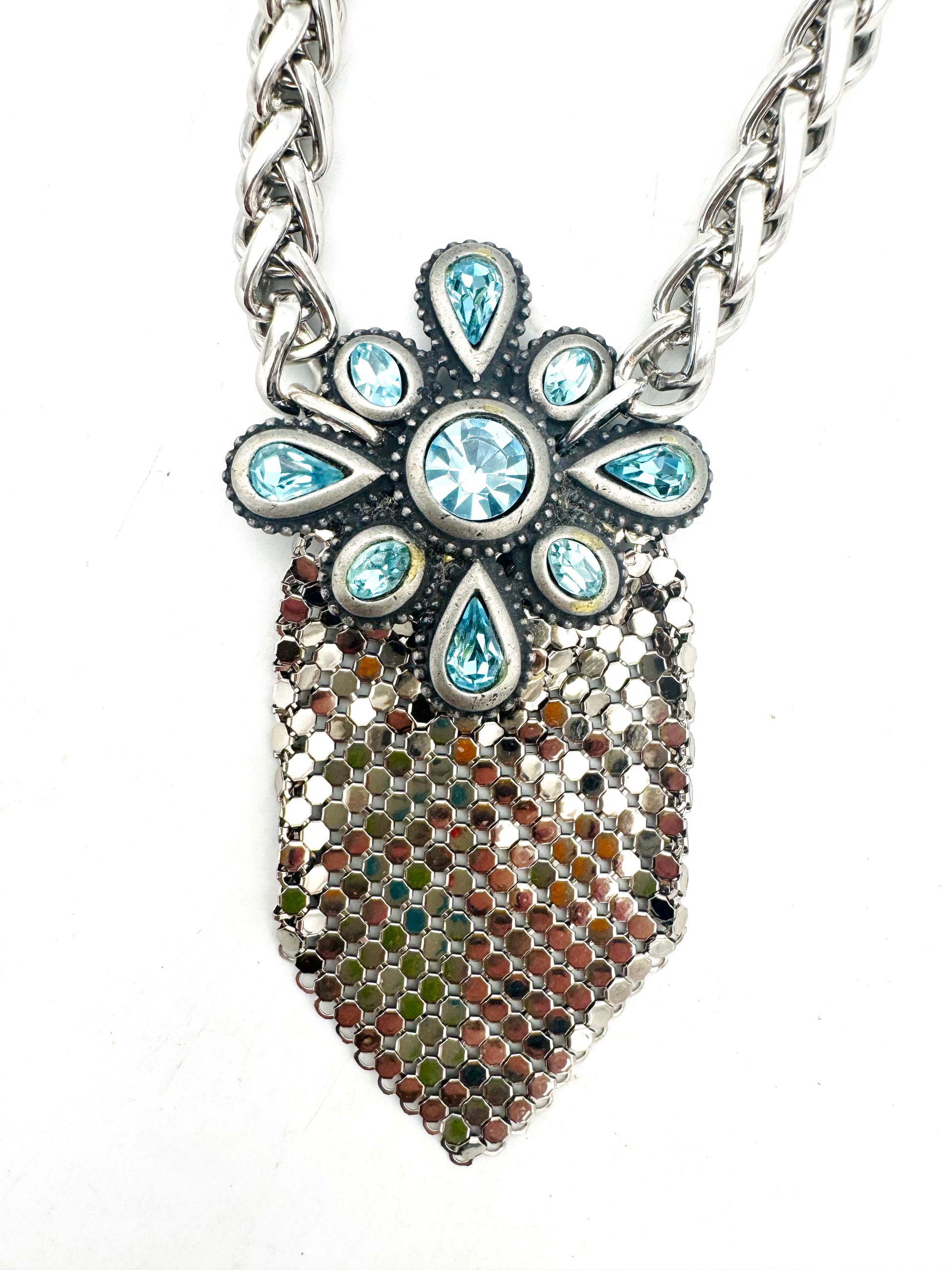 Unique mesh and glass brooch. The baby blue colored stones complement the shine of silver.