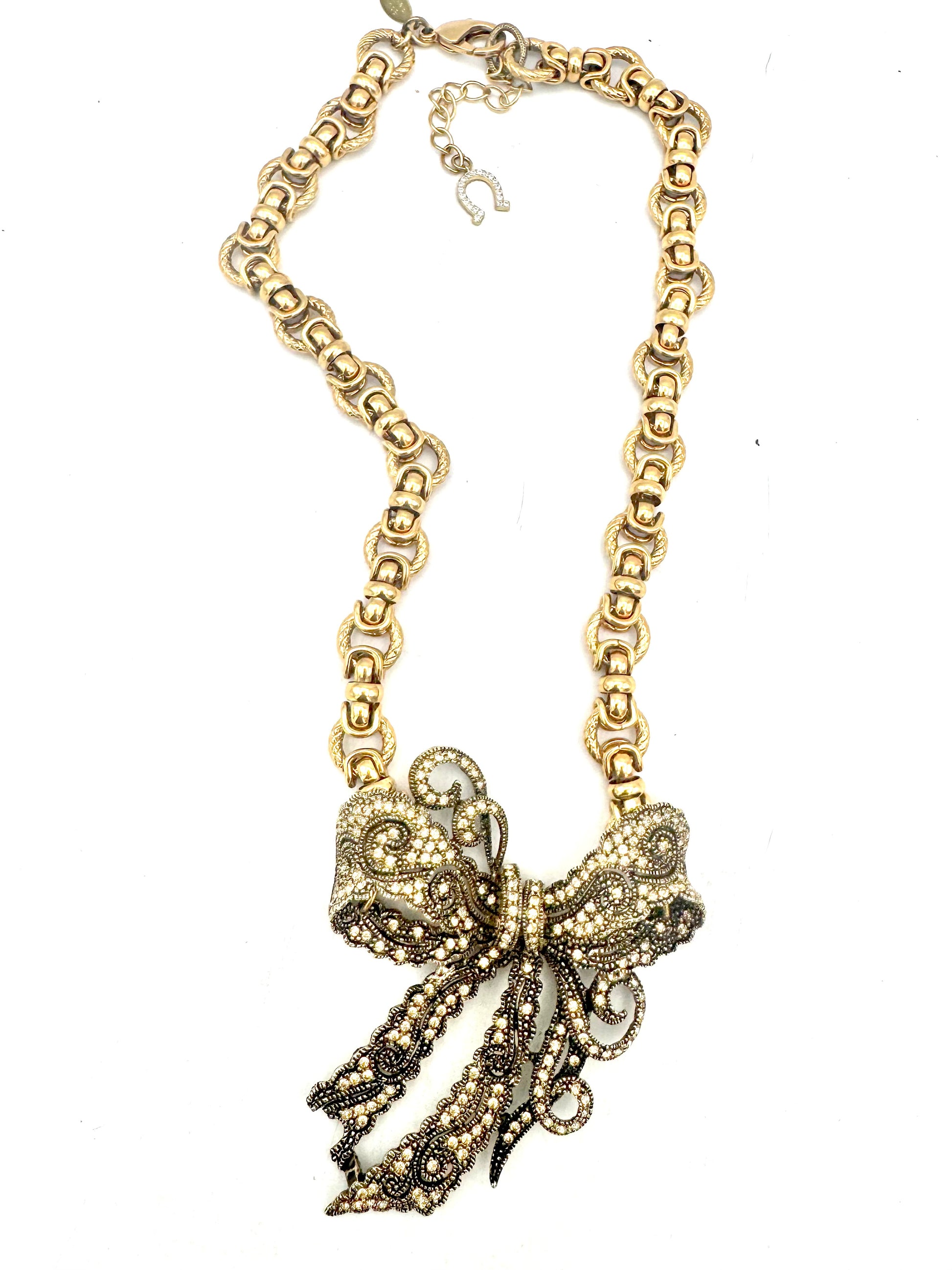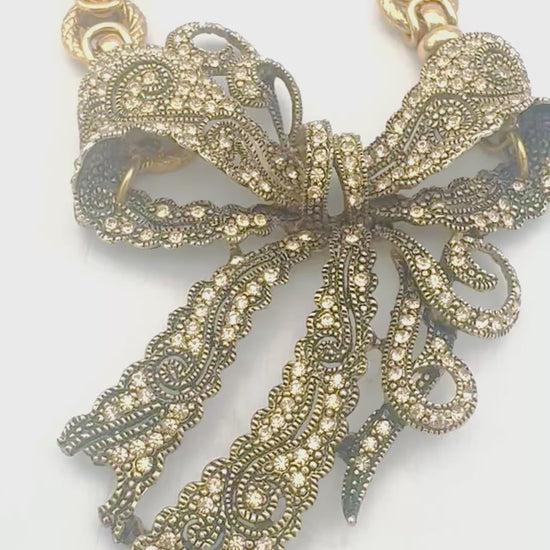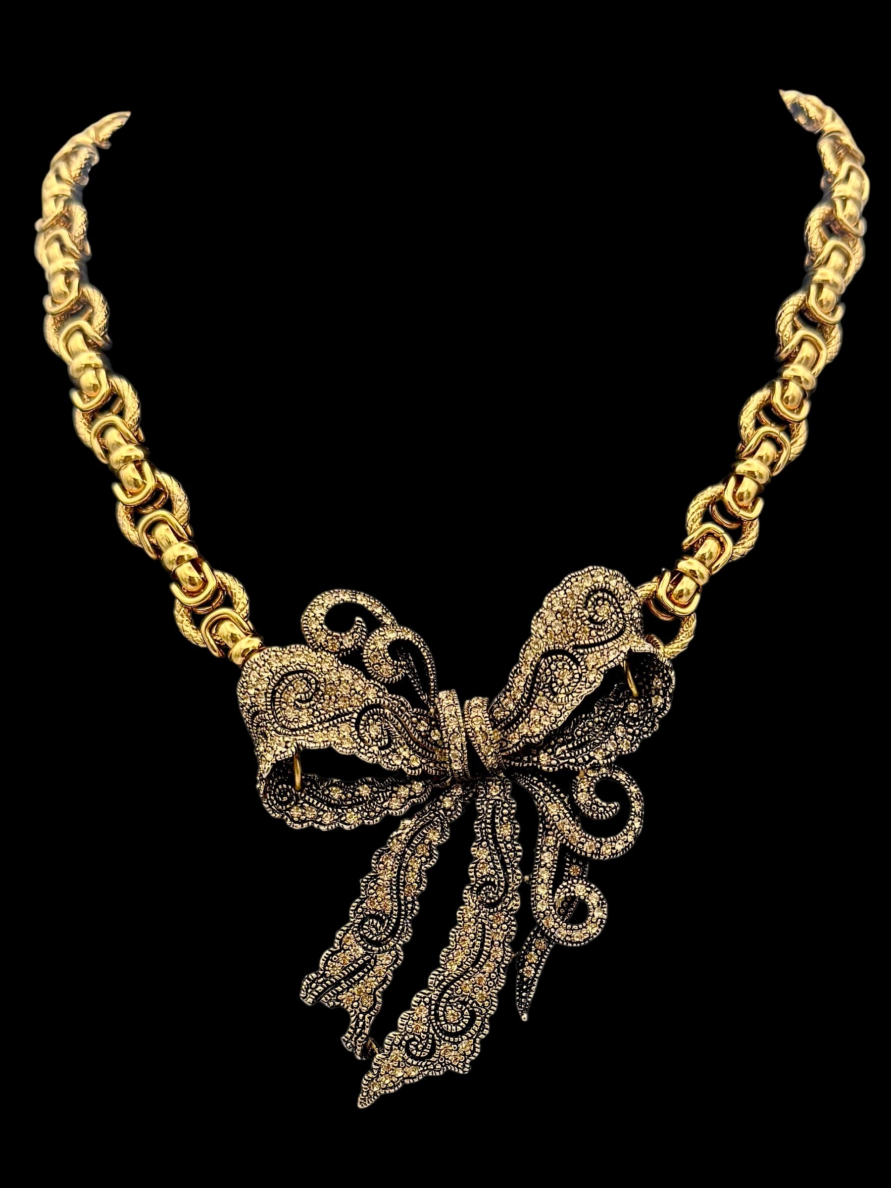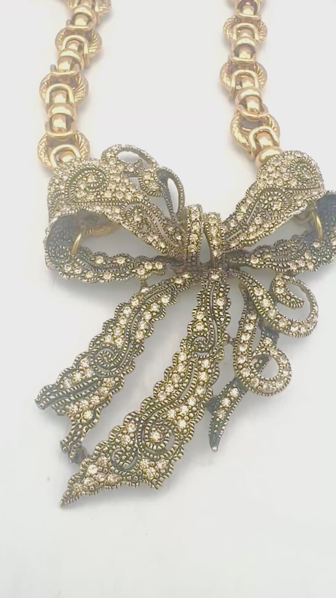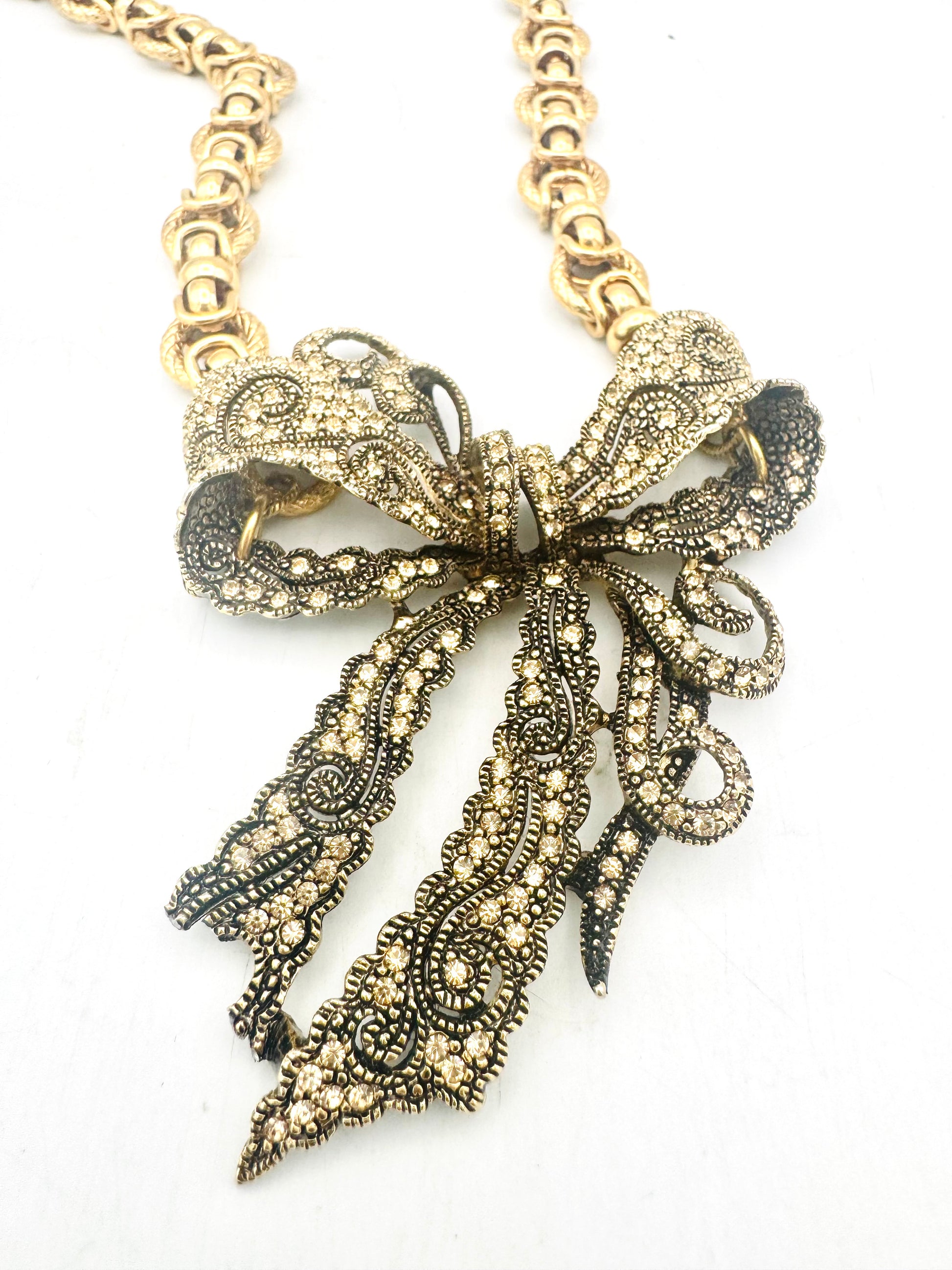 A newer jeweled bow brooch reimagined as a pendant, paired with a bold 1980s statement chain. The delicate lace-like detailing of the bow contrasts beautifully with the sculptural gold links, creating a one-of-a-kind necklace that blends vintage charm with dramatic glamour.