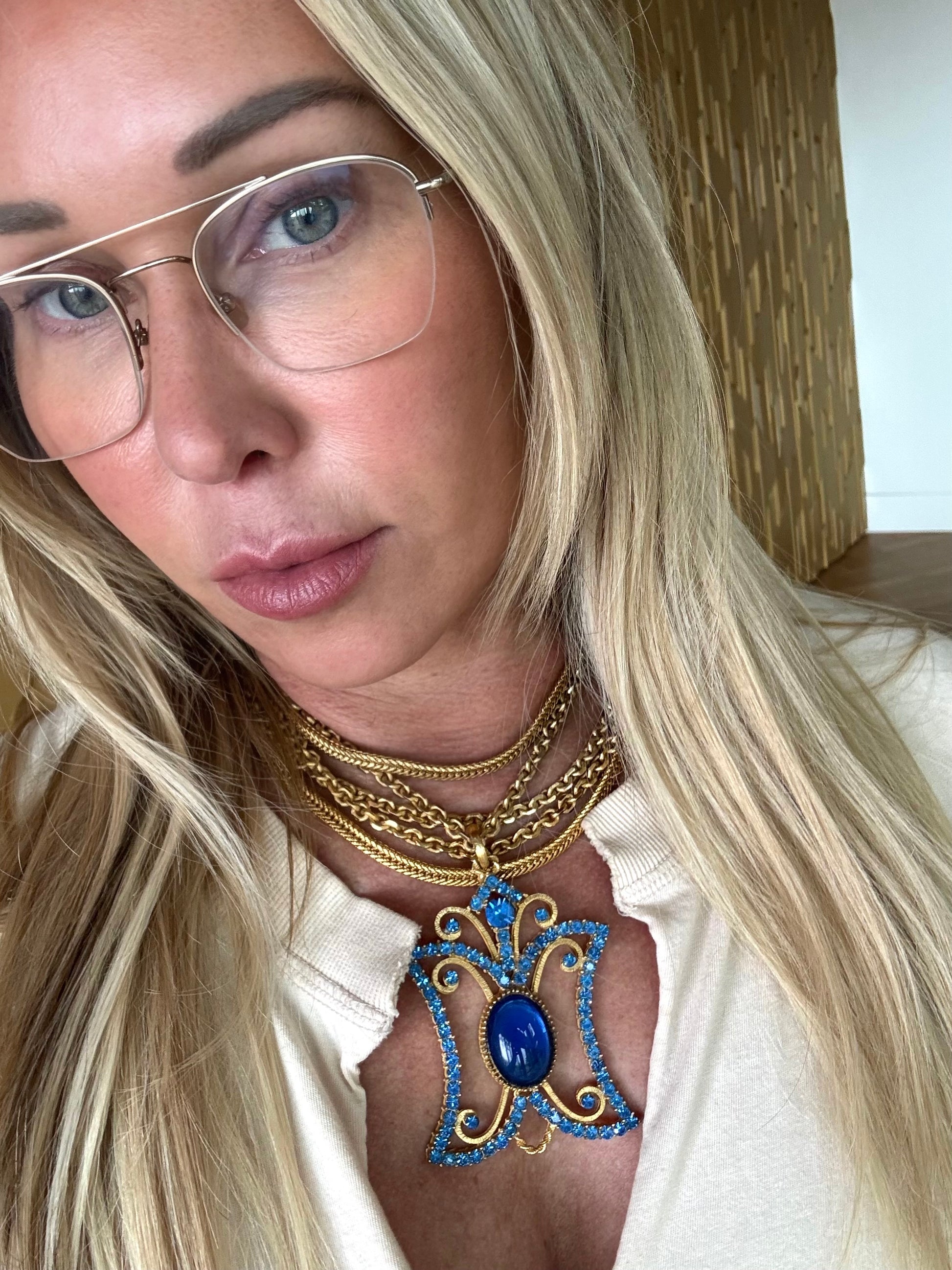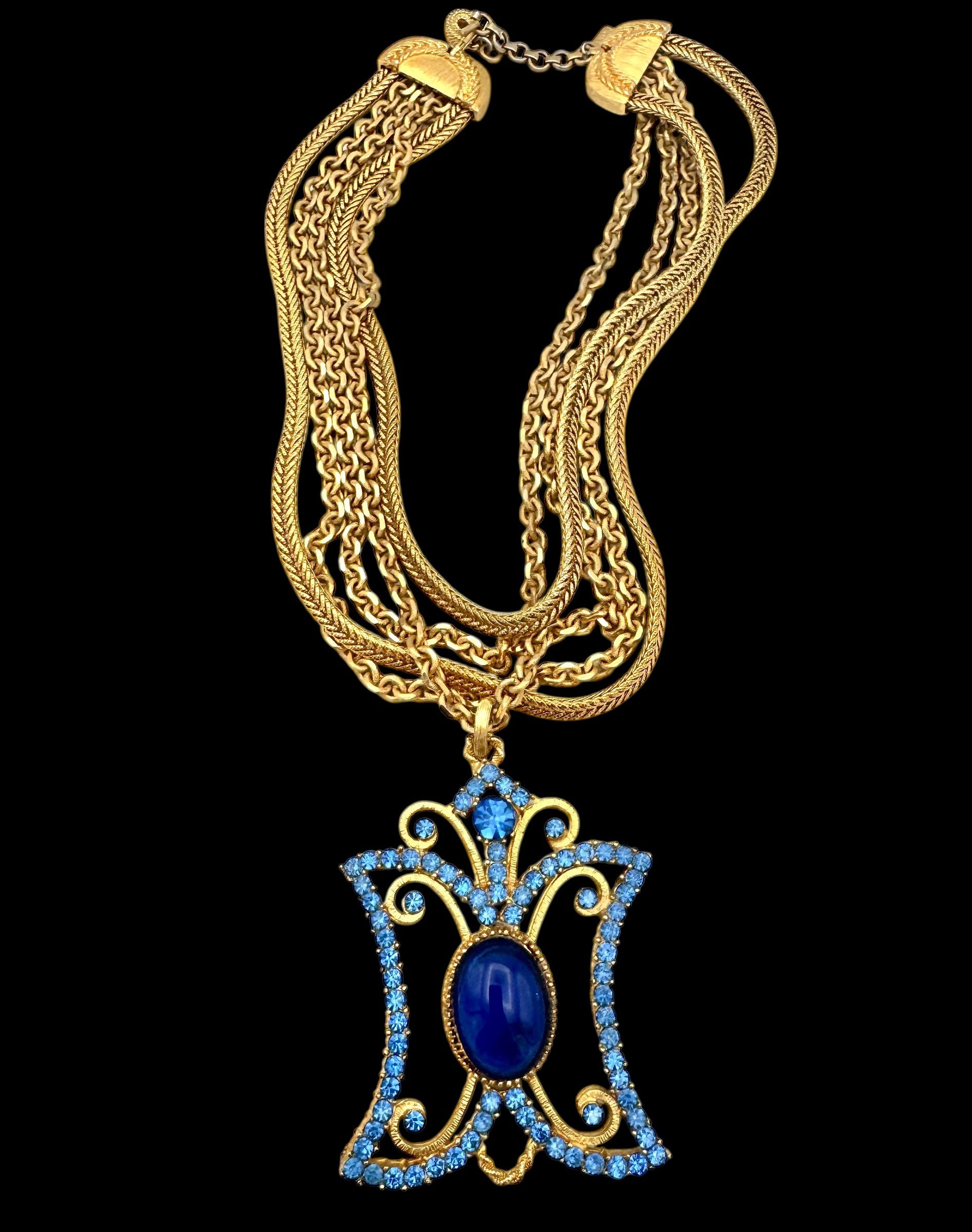 Regal layered gold chain necklace showcasing a dramatic pendant adorned with vibrant blue stones and intricate scrollwork. A bold, statement-making design that blends elegance with vintage glamour.