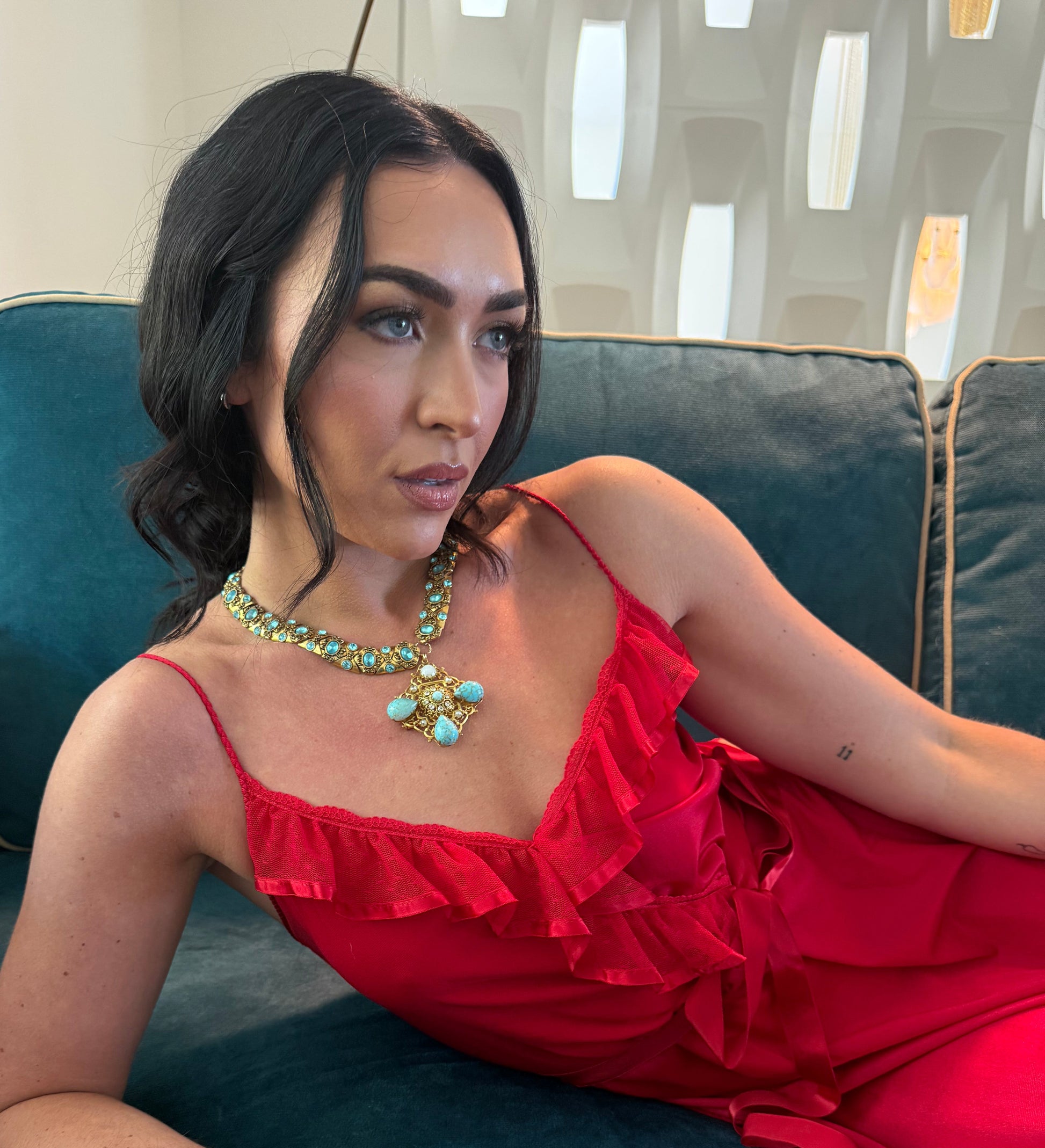 An ode to opulence. This Paris find captures the spirit of mid-century glamour with a 1950s Byzantine-inspired pendant — gilded in intricate gold and adorned with turquoise and aqua stones that shimmer like ancient treasure. Each marbled drop tells a story of artistry and power, reimagined for the modern muse who wears history with confidence.