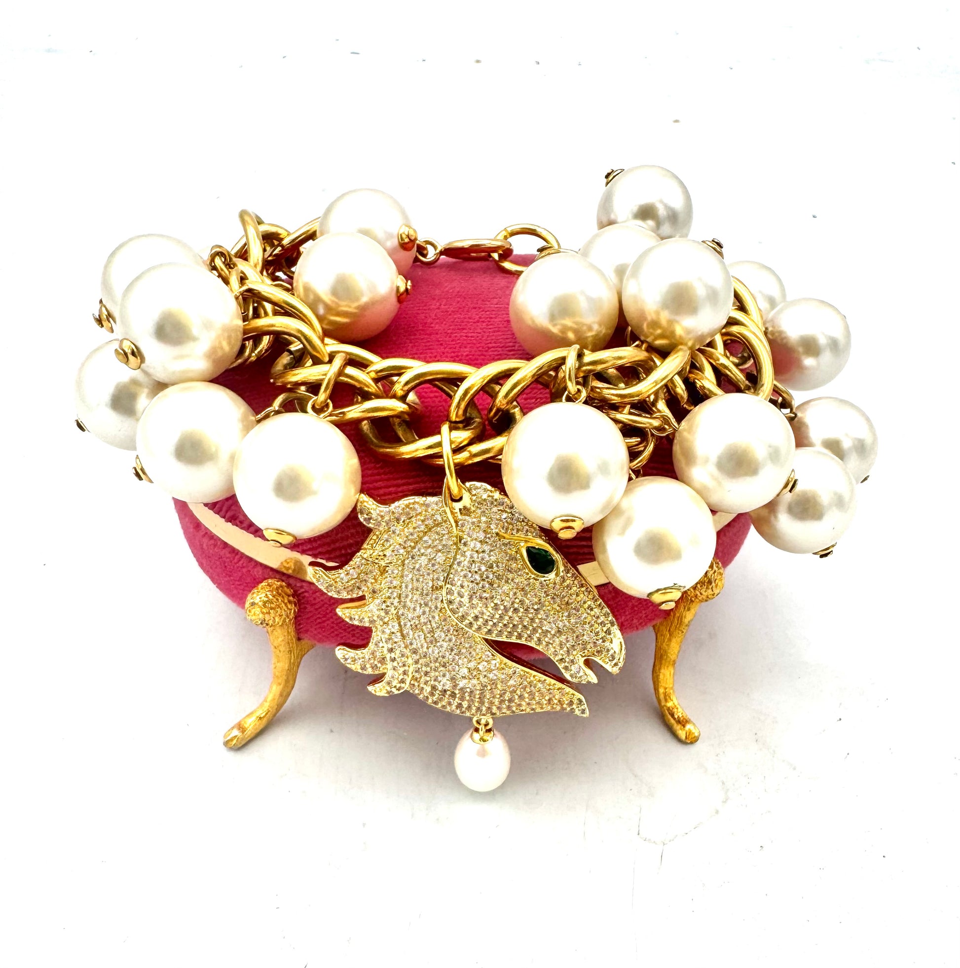 Vintage horse brooch with emerald eye and faux pearl drop gold filled. Paris France