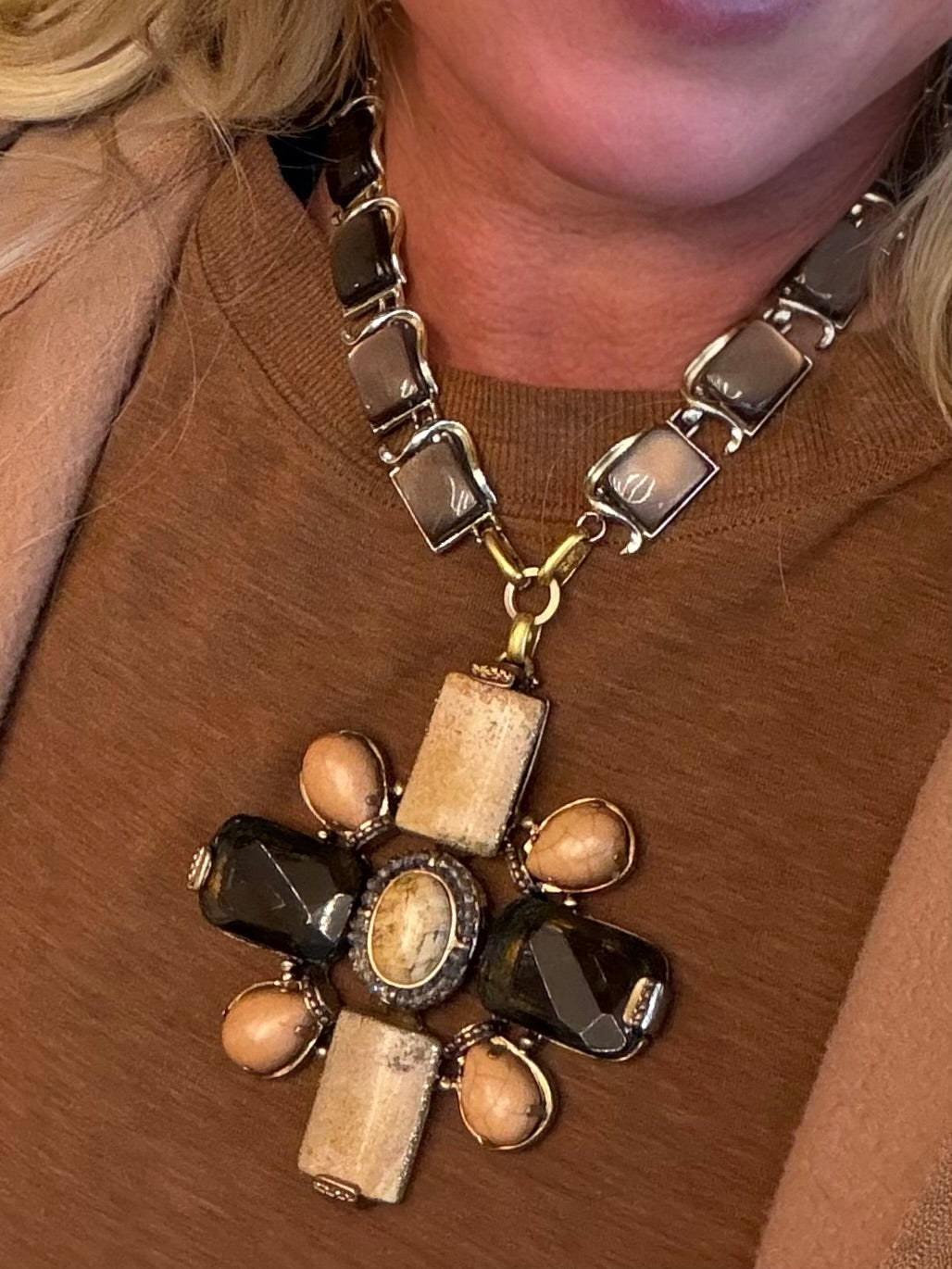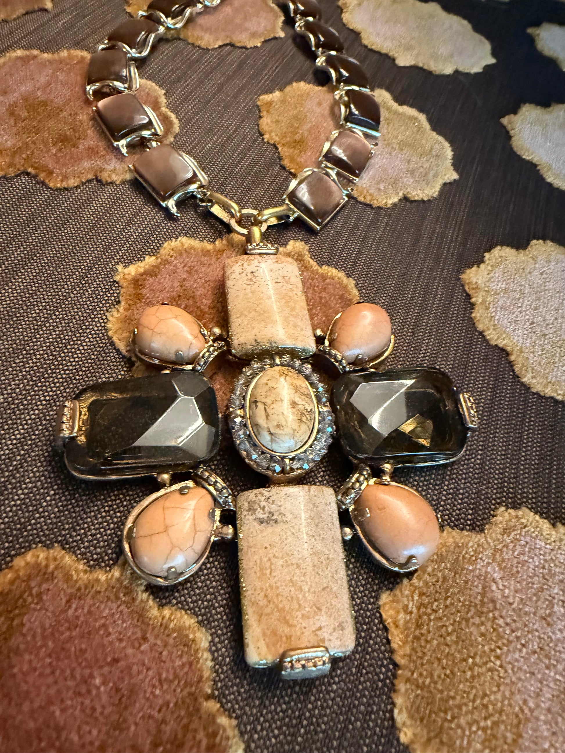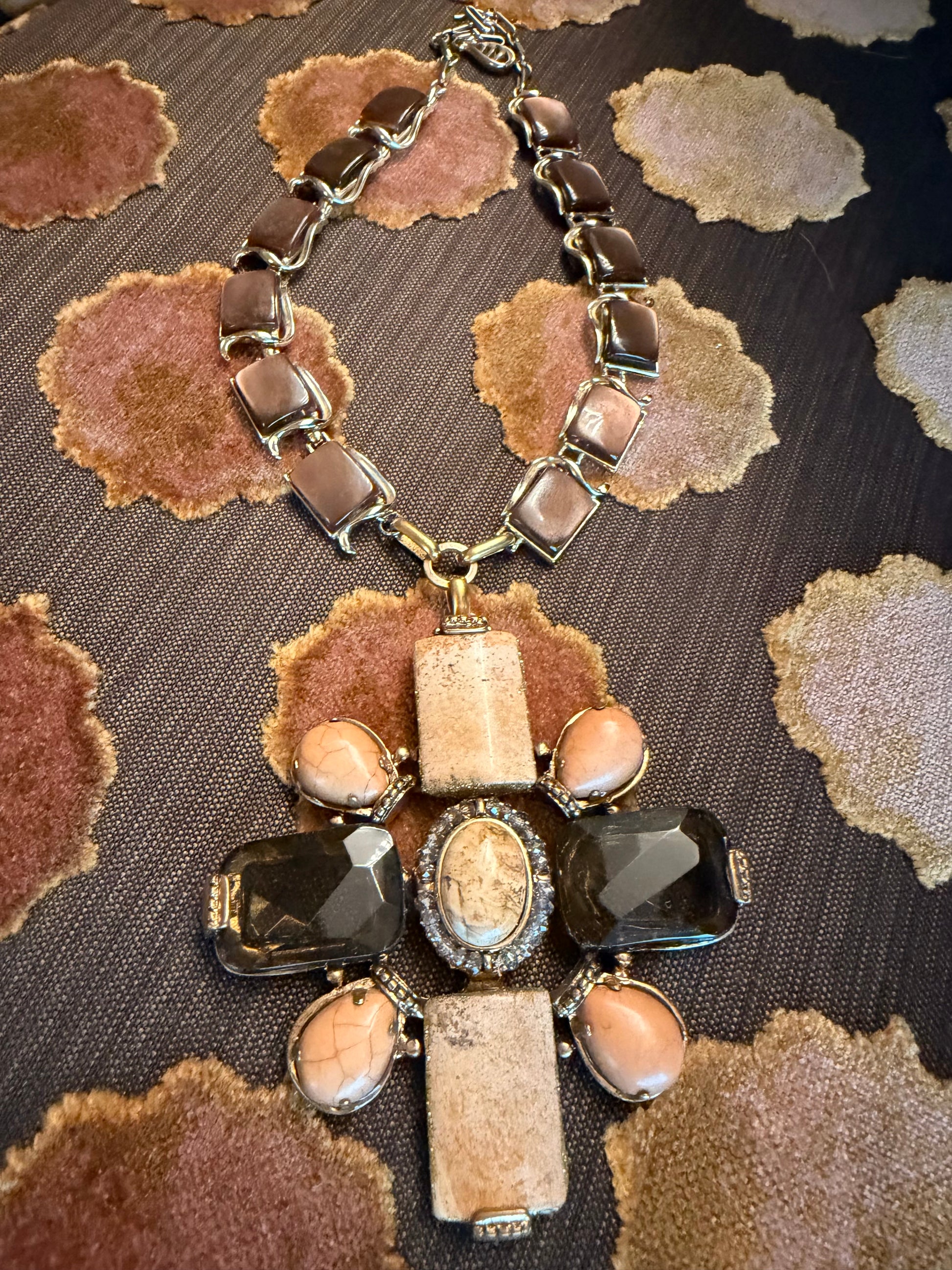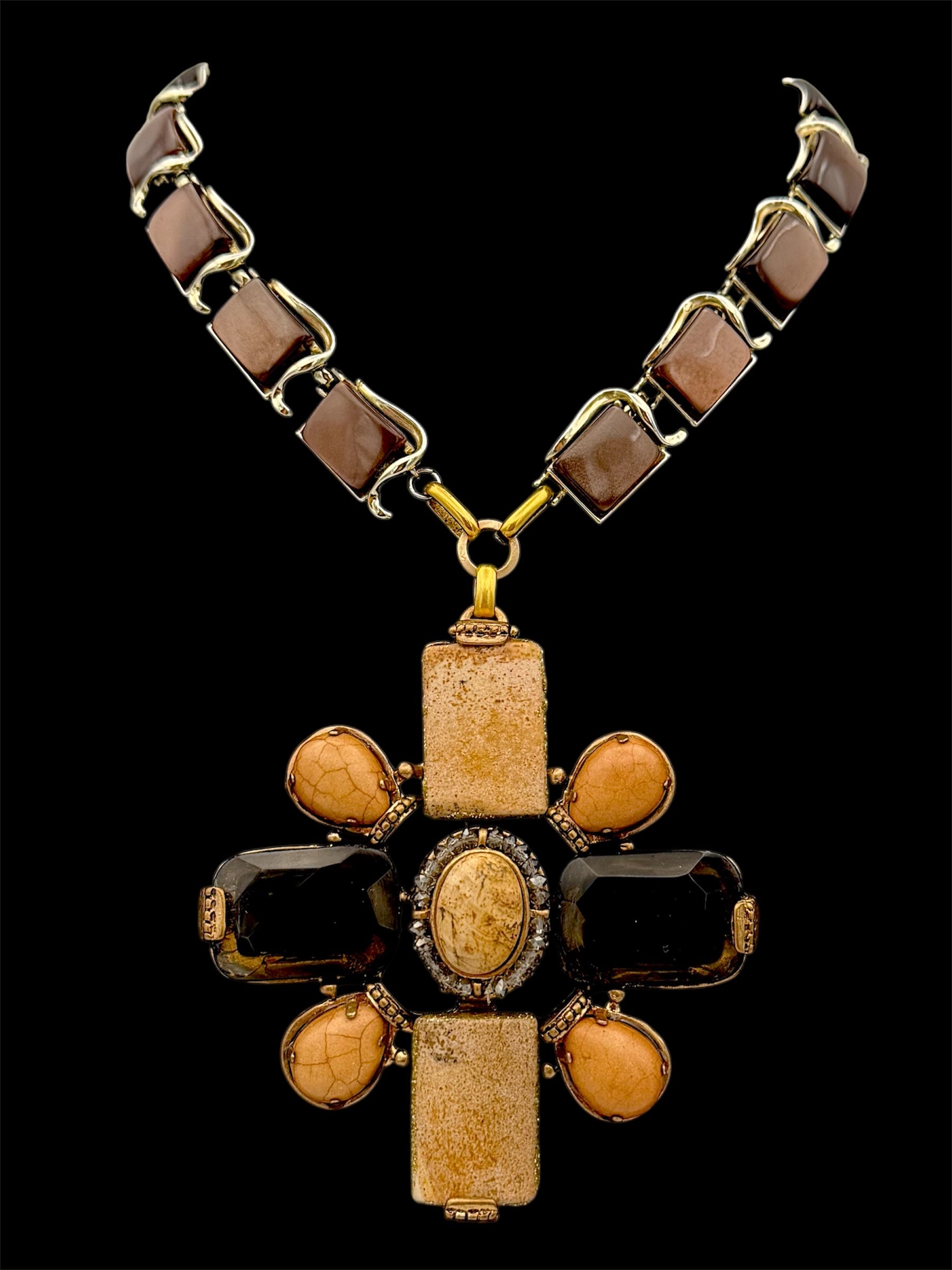 A 1950s chocolate Moon Glow thermoset collar paired with a 1990s pendant in warm earth tones, amber hues, and subtle rhinestone sparkle.