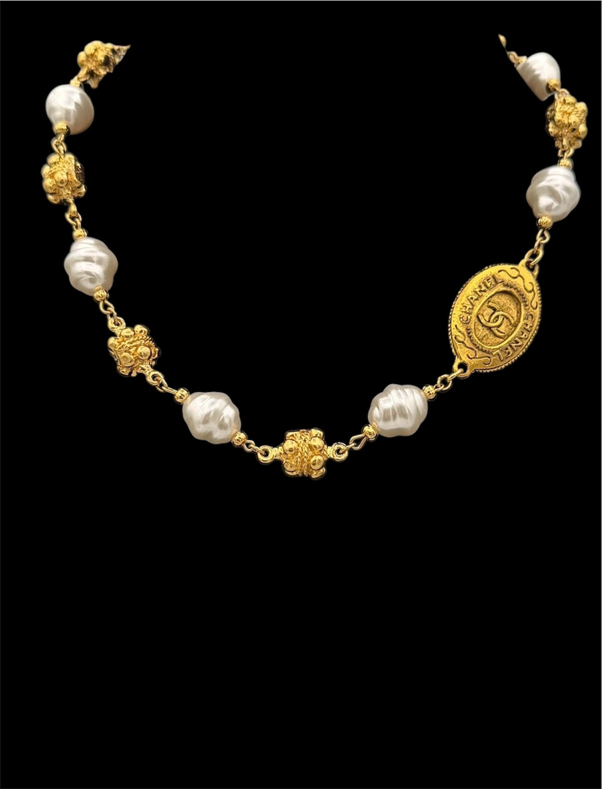 A collection-worthy design created with repurposed vintage designer components, blending one iconic chain with connector elements from another luxury collection. Finished with luminous baroque-style pearls and rich gold detailing, this piece delivers effortless “old money” glamour with a one-of-a-kind Soul Revival edge.