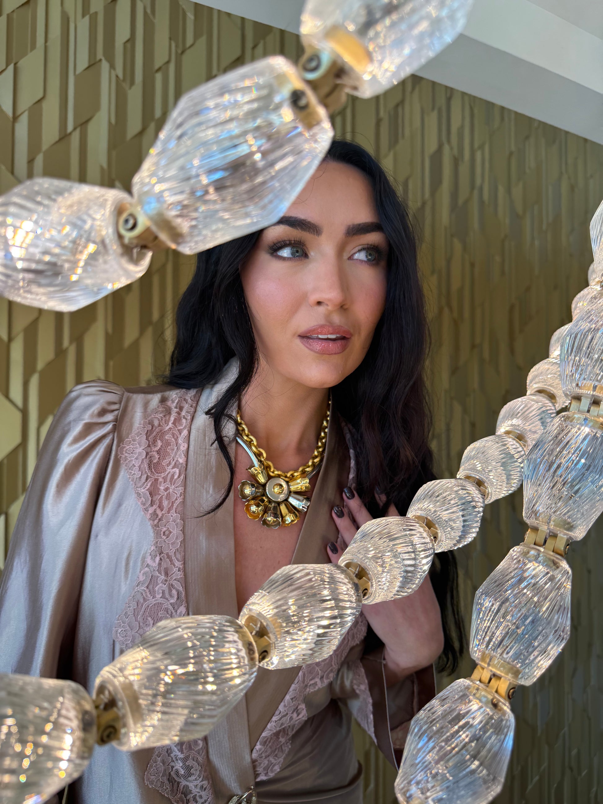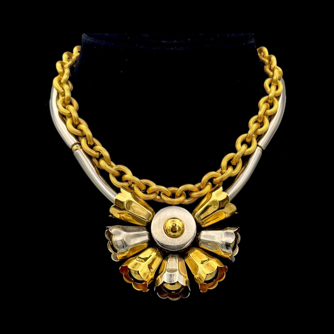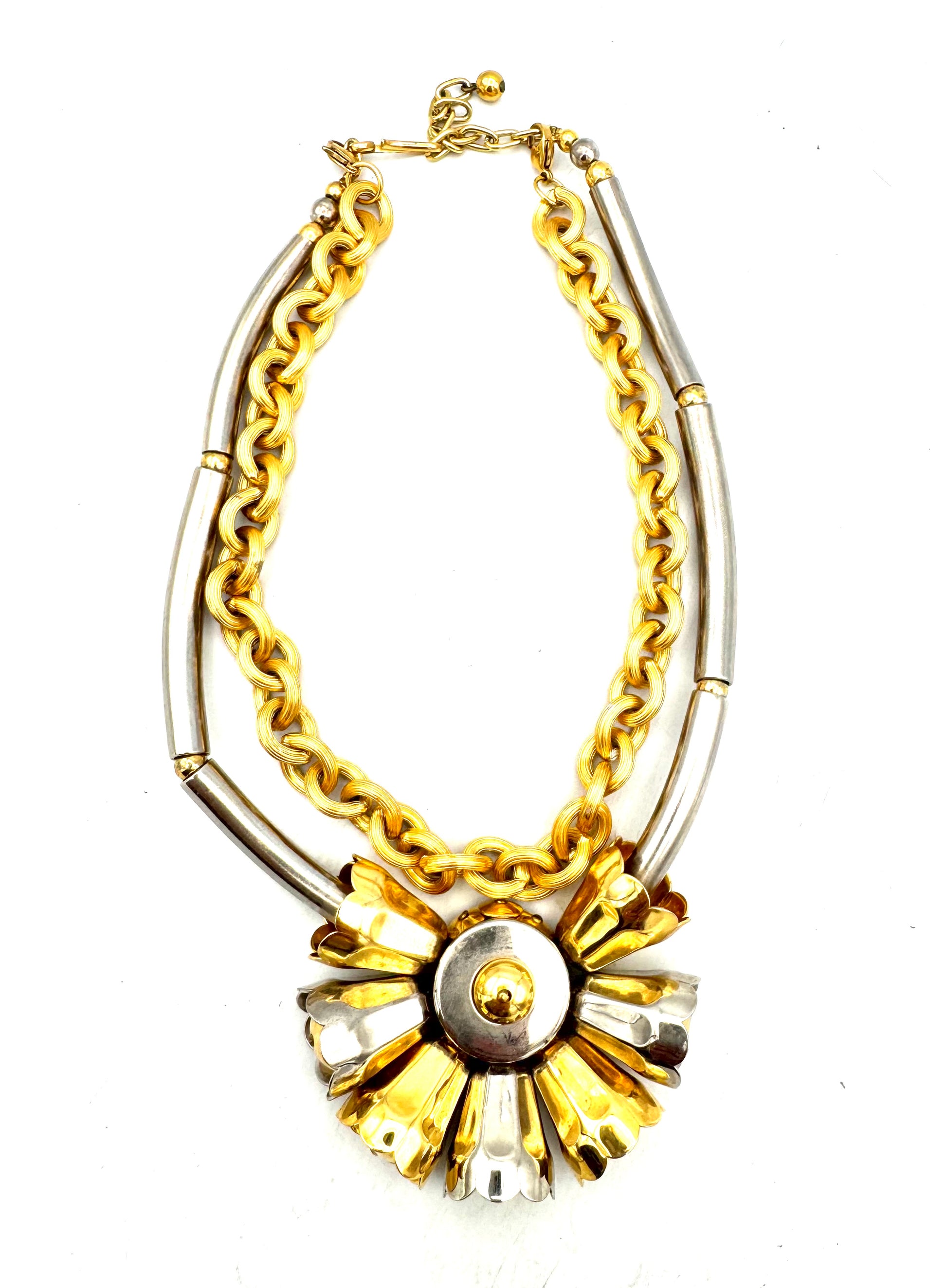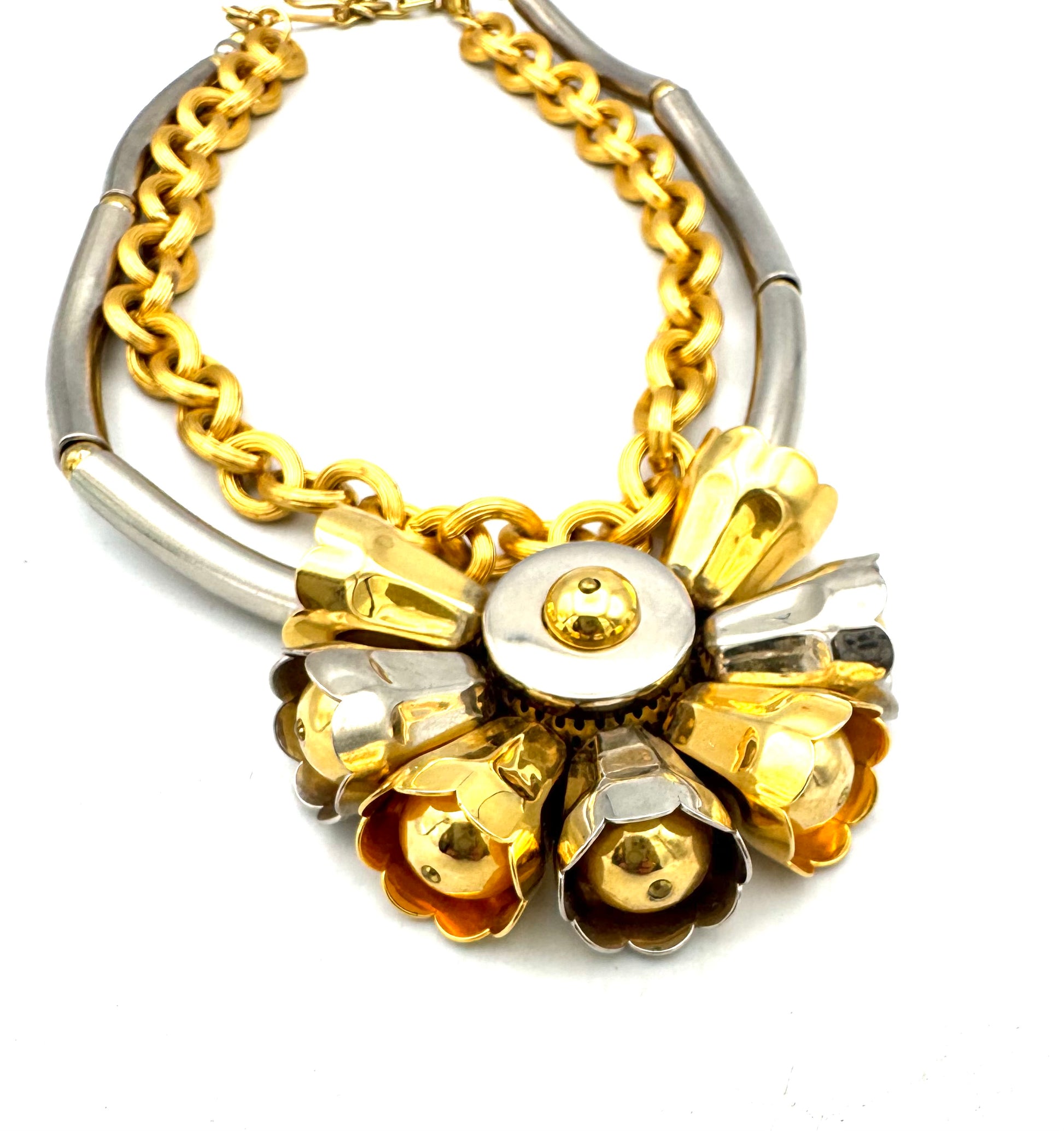 Architectural yet feminine, this Paris find features a sculptural floral centerpiece in mixed metals — gold and silver tones that catch the light with every angle. The design includes a removable gold chain, allowing it to be styled as a bold statement or a sleek collar. A modern interpretation of vintage craftsmanship with undeniable edge.