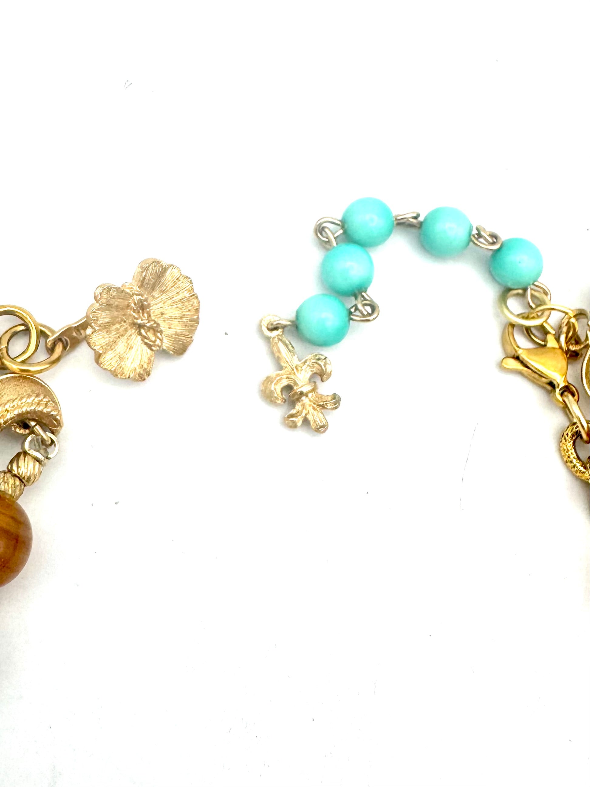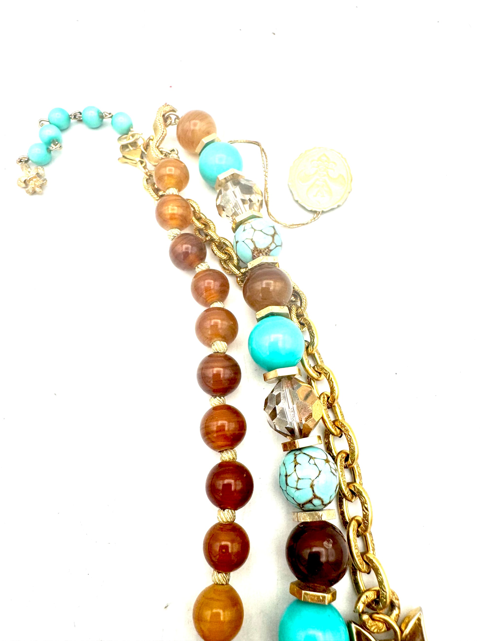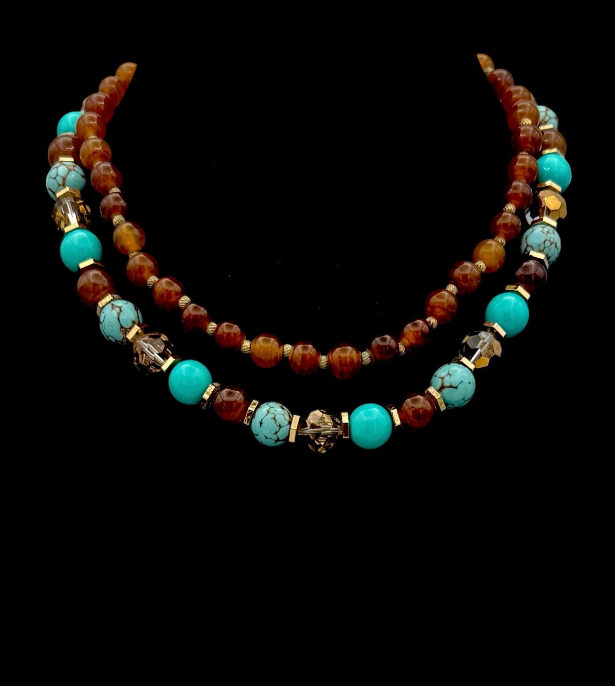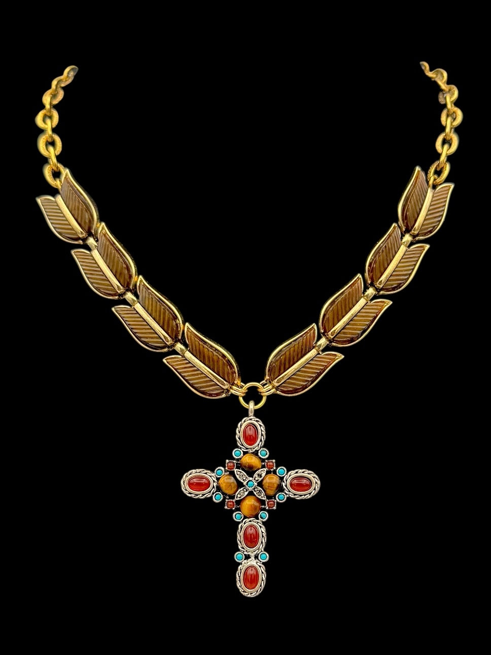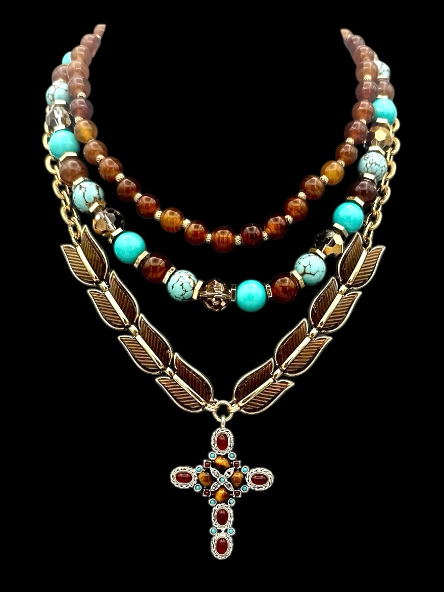 A new-with-tags Vendome carnelian and turquoise beaded collar paired with a reworked vintage thermoset necklace featuring a 1970s cross. The thermoset strand is removable and can be worn on its own or layered with the collar.