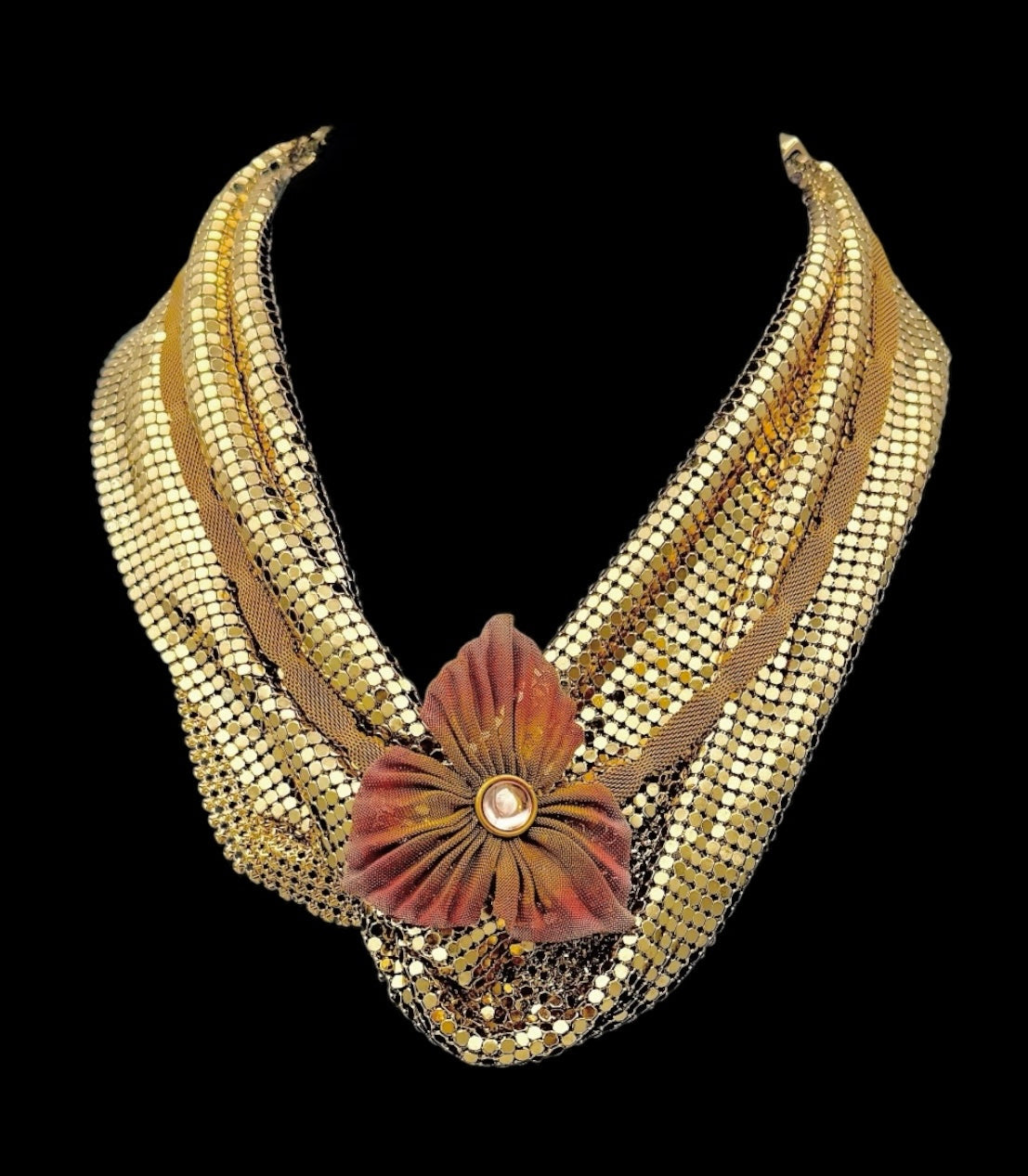 Vintage mesh from two eras—disco-era draped mesh and a 1940s collar—knotted together into a sculptural statement. The removable painted mesh flower lets you style it your way.