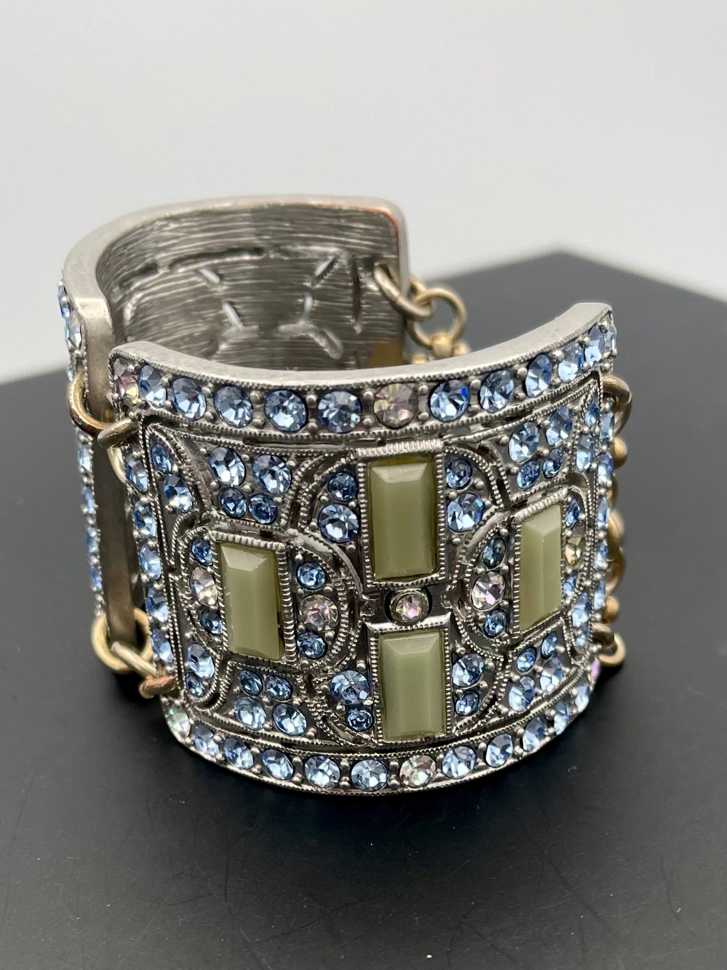 This adjustable length cuff bracelet features vintage components connected by chain links.