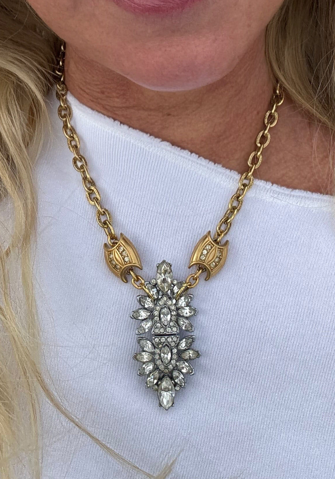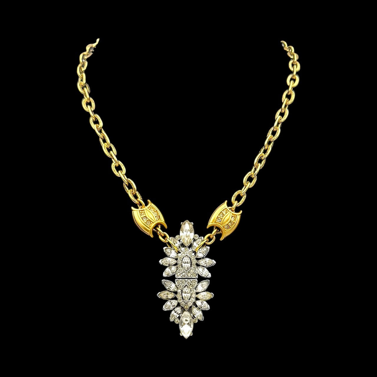 A rare vintage duette reimagined — two identical dress clips joined as one dazzling pendant. Set on a bold gold chain with crystal accents, this piece delivers vintage brilliance with modern edge.