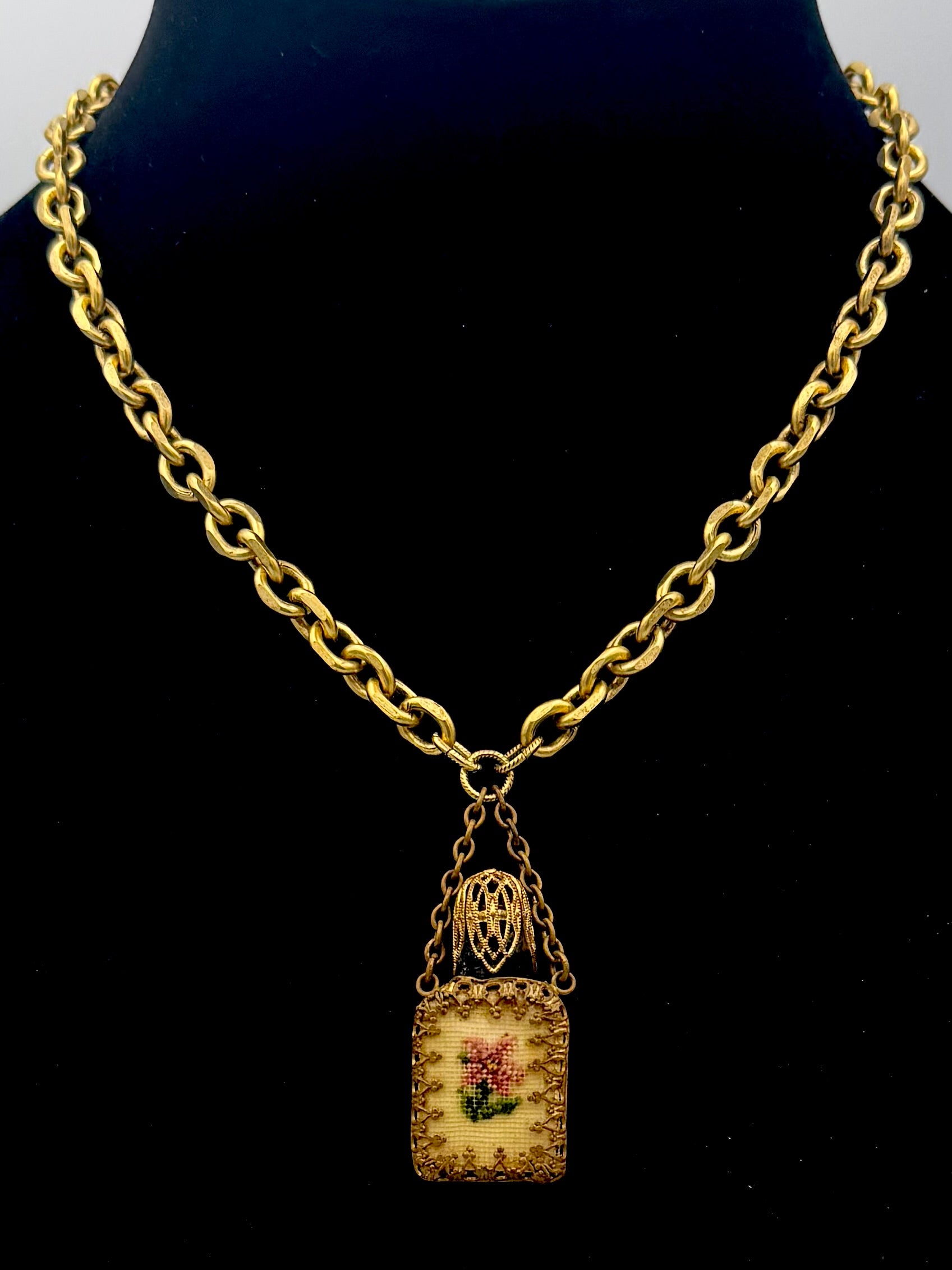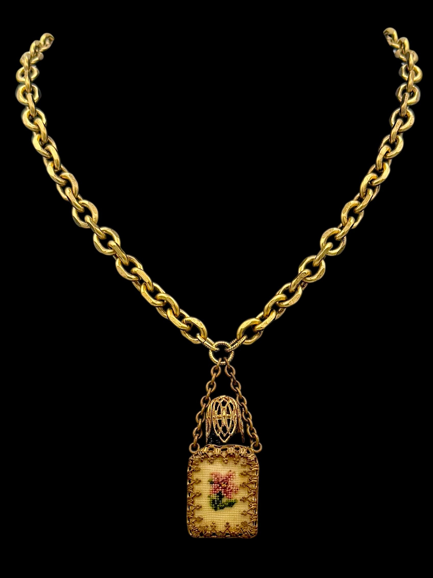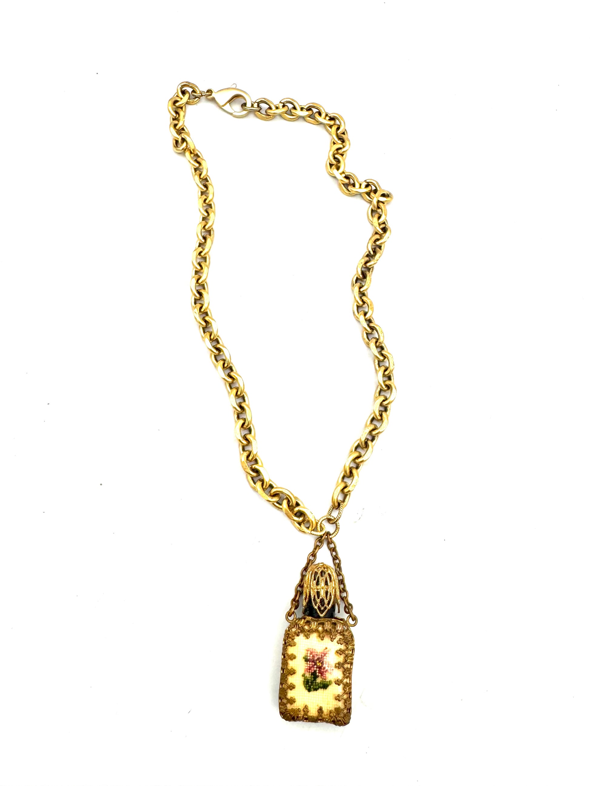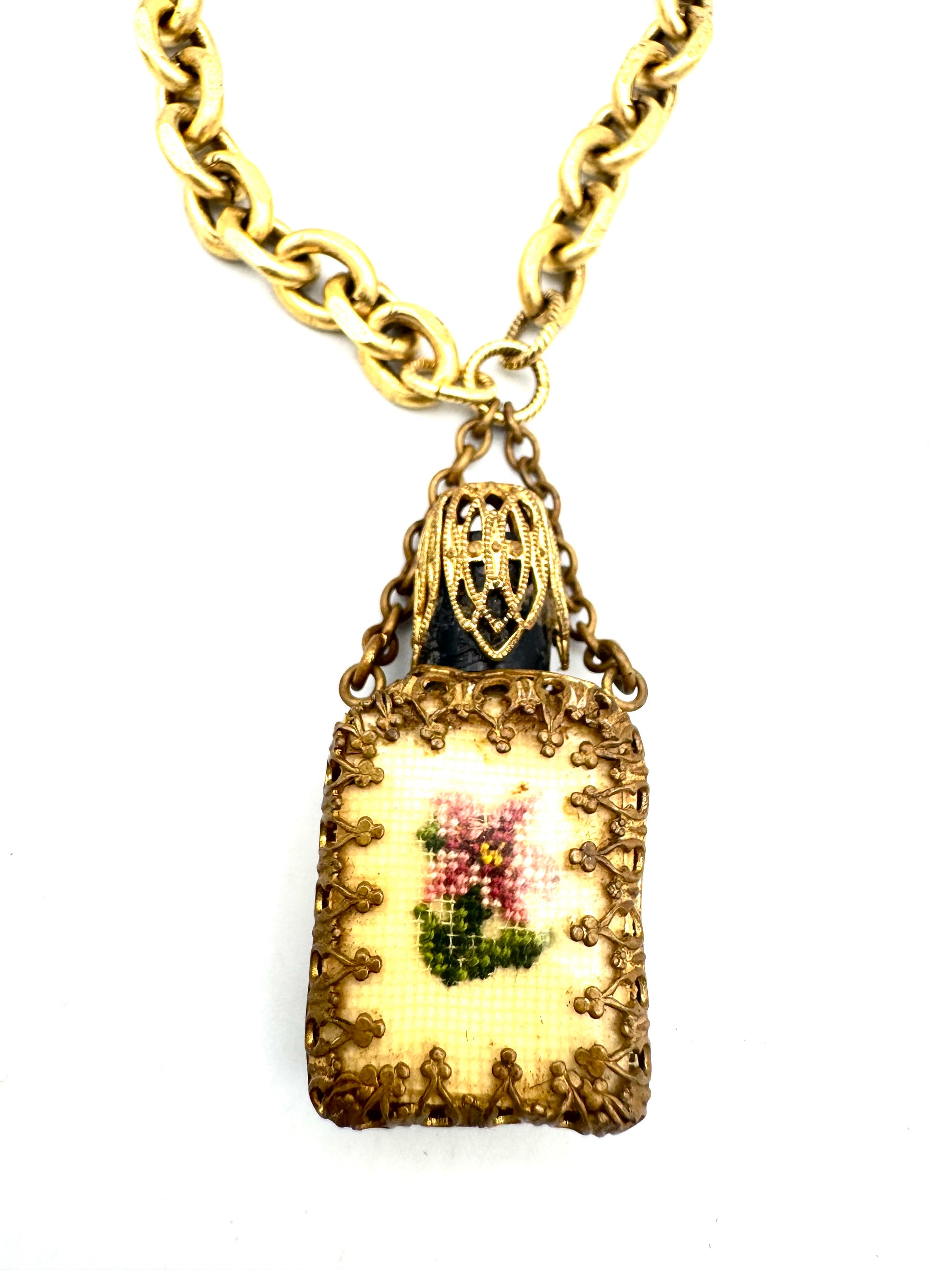 Sourced from the Roaring 1920s, this intricate perfume bottle charm with a filigree top features a floral needle-point design. Hung on a 17” gold-plated chain.