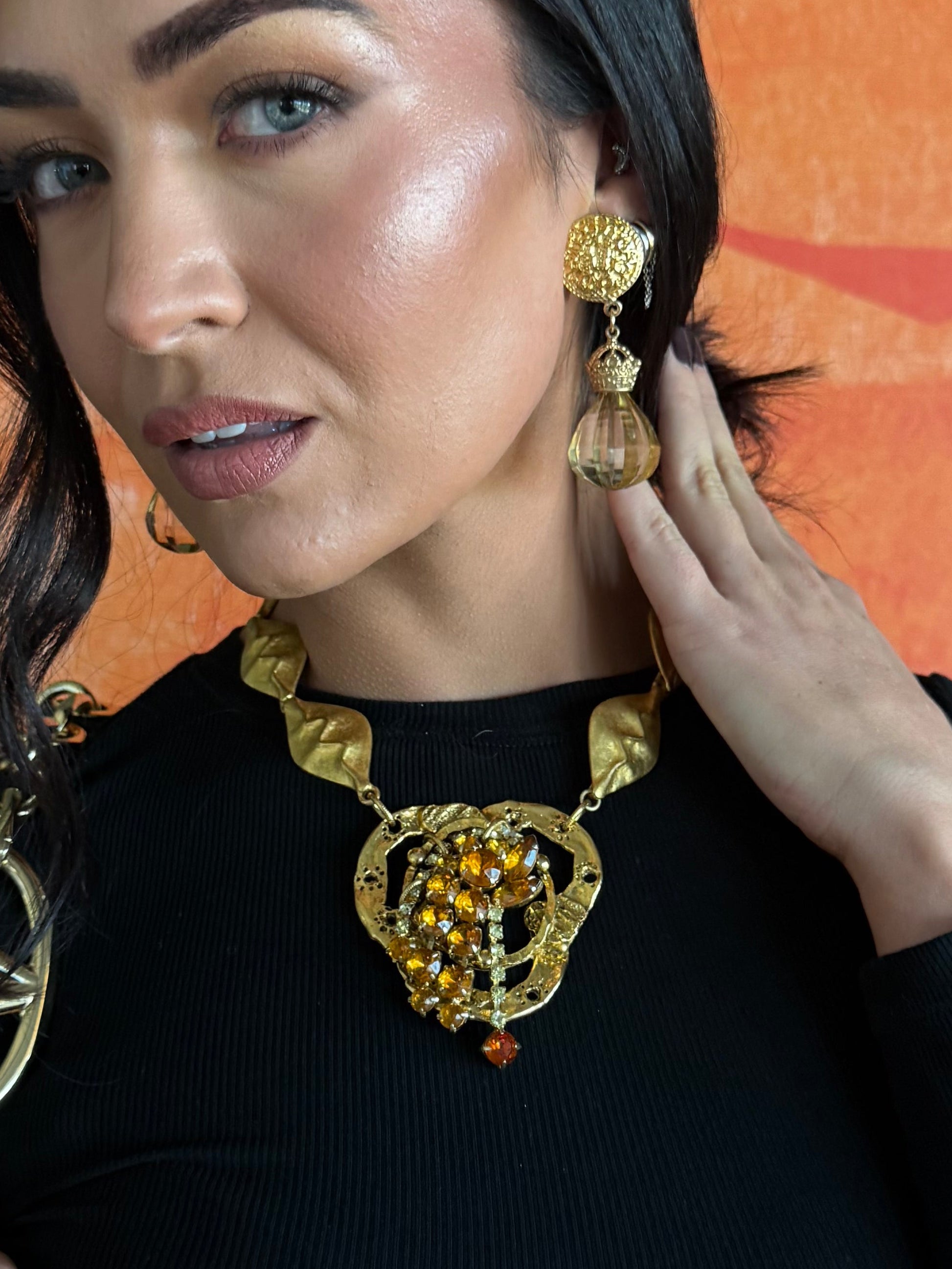 Sourced in Paris and reimagined from vintage components, this sculptural gold necklace glows with amber crystals and bold, modern elegance.