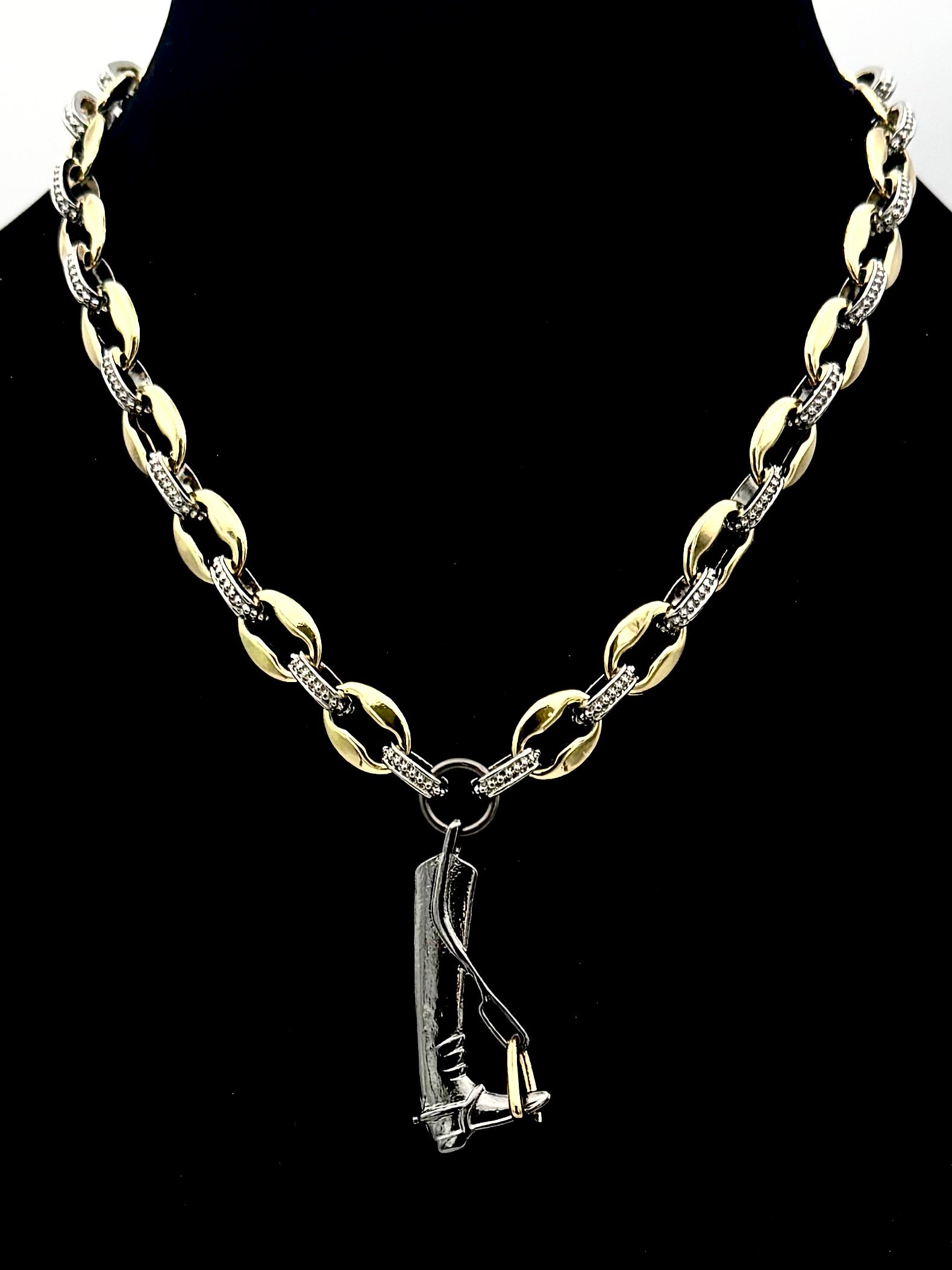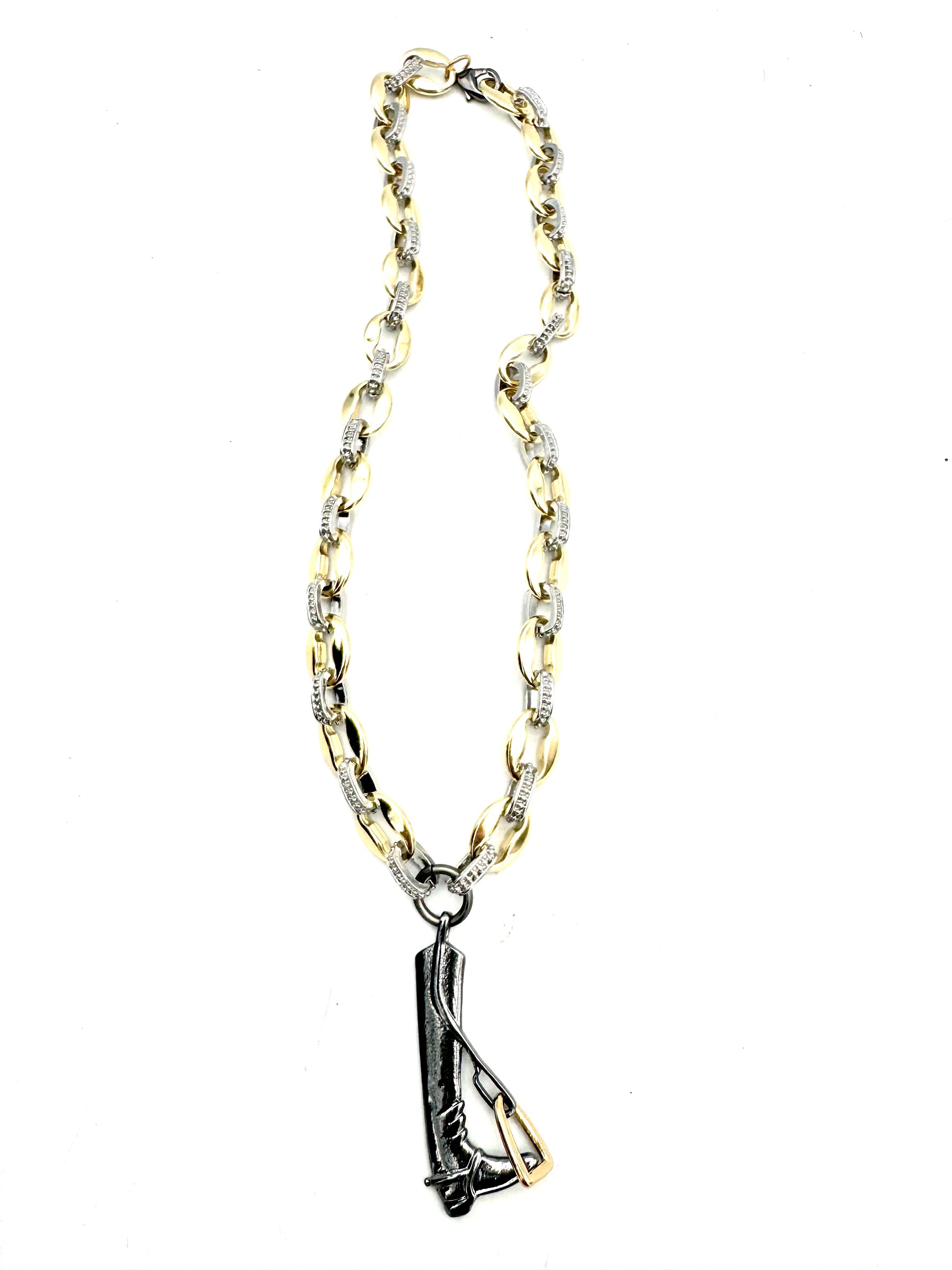 This piece is a one of a kind, custom design. Gold and silver plated stirrup charm hung on a mixed metal chain. Length is 17”.