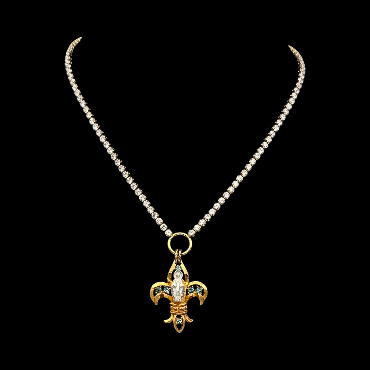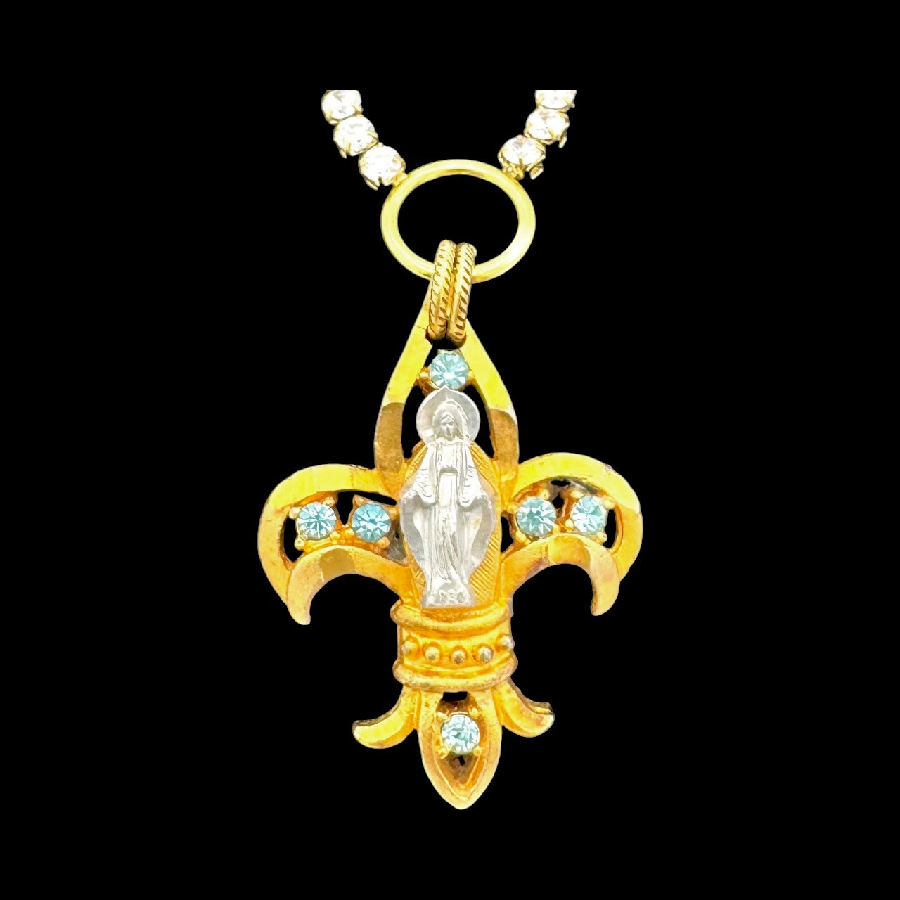 A vintage fleur-de-lis cradles a radiant Madonna, framed by soft aqua stones and suspended from a luminous rhinestone chain. A symbol of protection, guidance, and quiet grace—designed to be worn close to the heart.