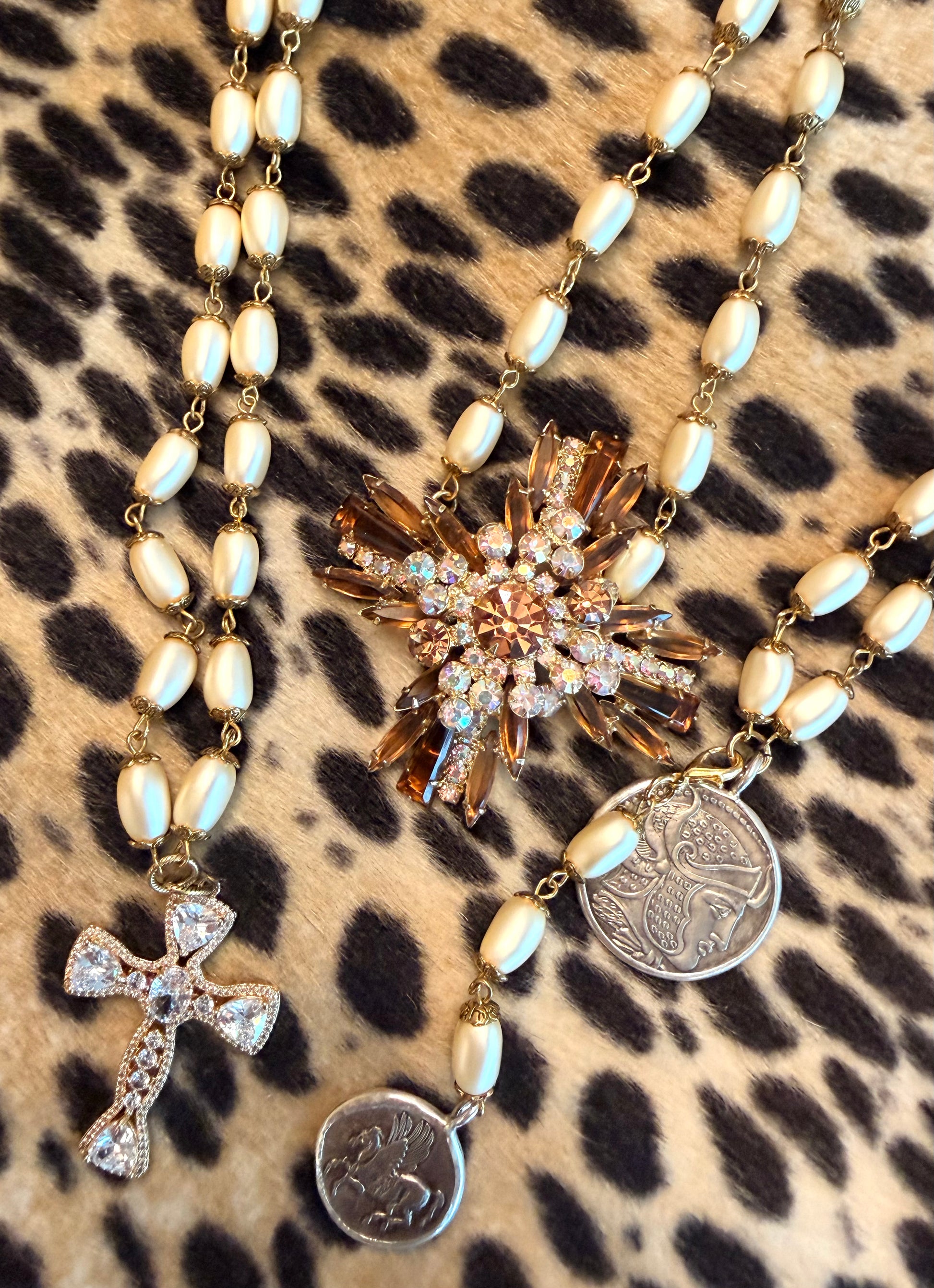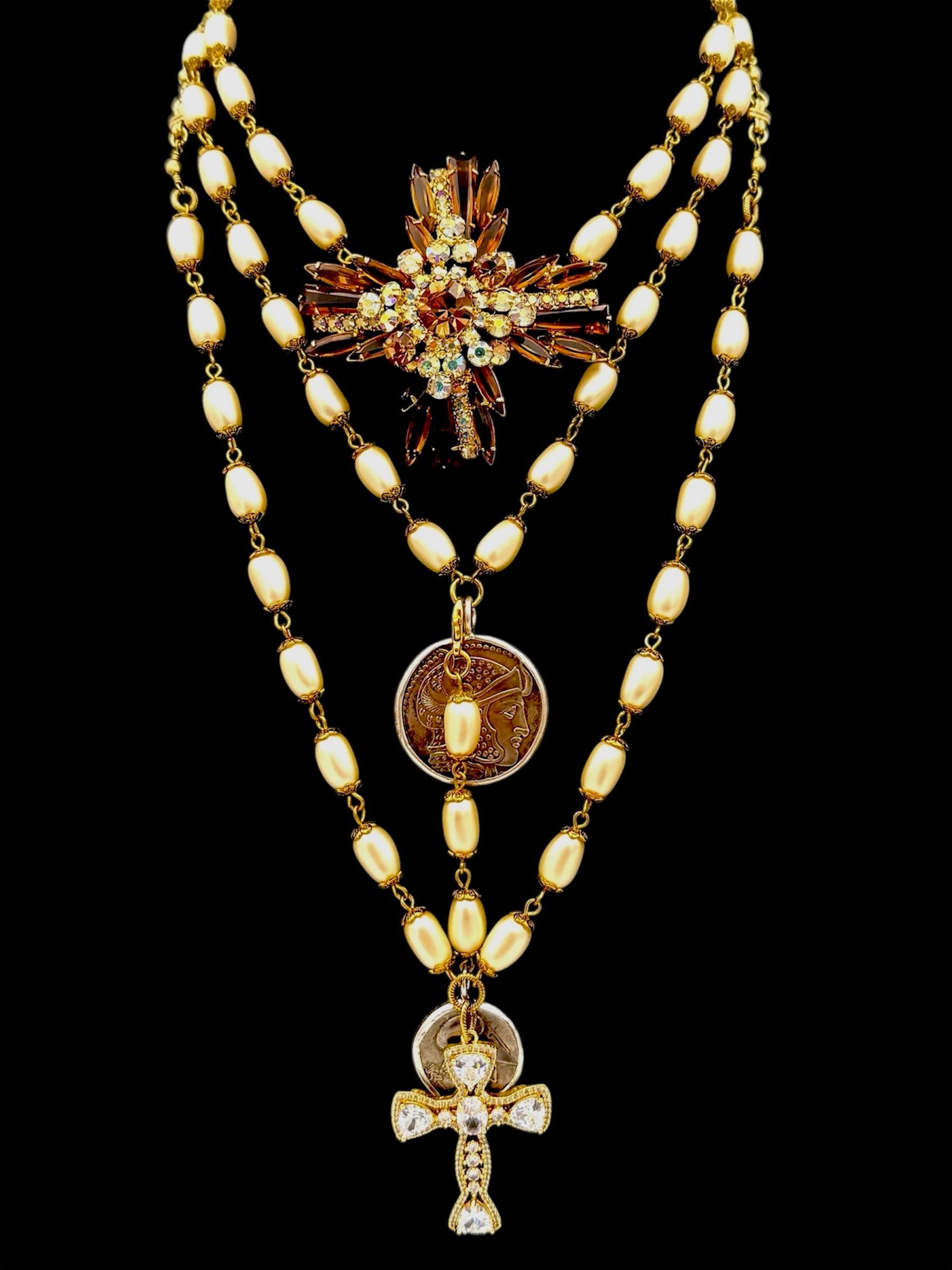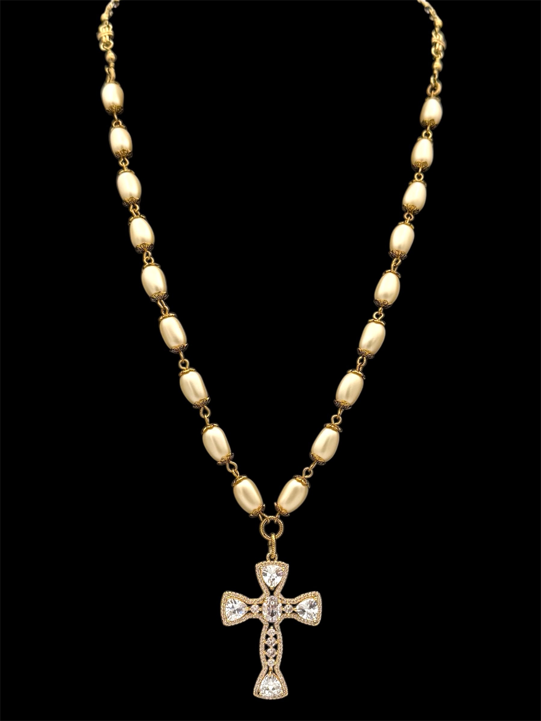 Czech glass pearls with a gold-filled crystal cross. 24”-26”