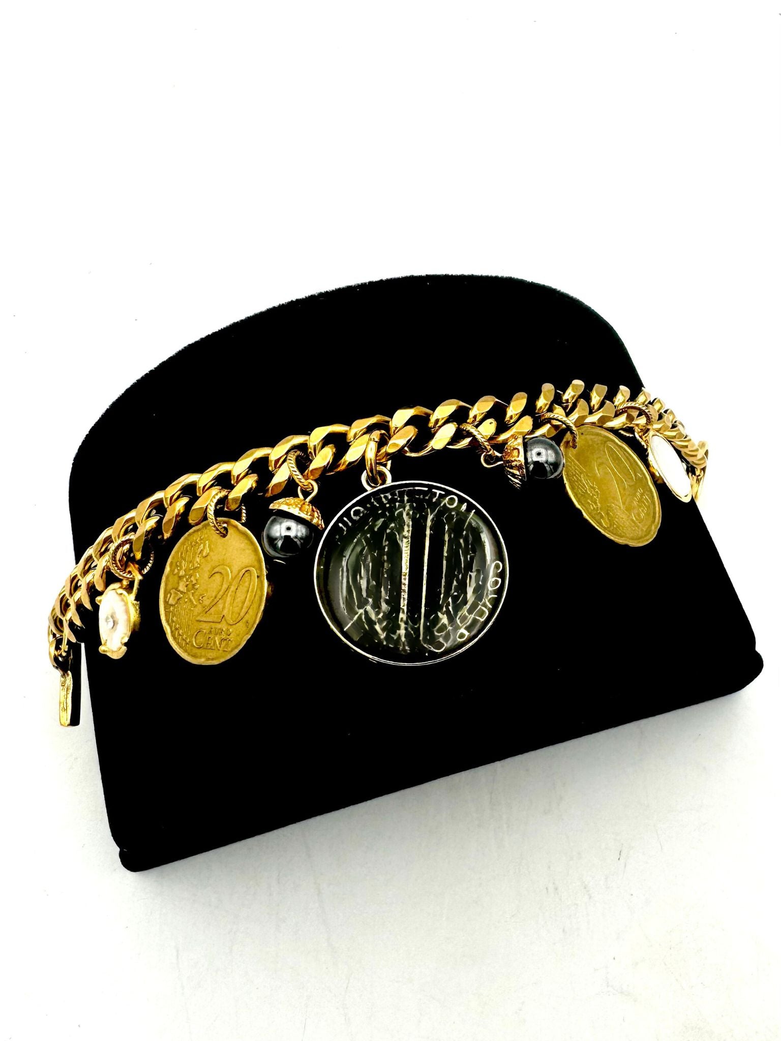Designer component and hand-selected vintage tidbits sourced in France on gold plated brass chain.