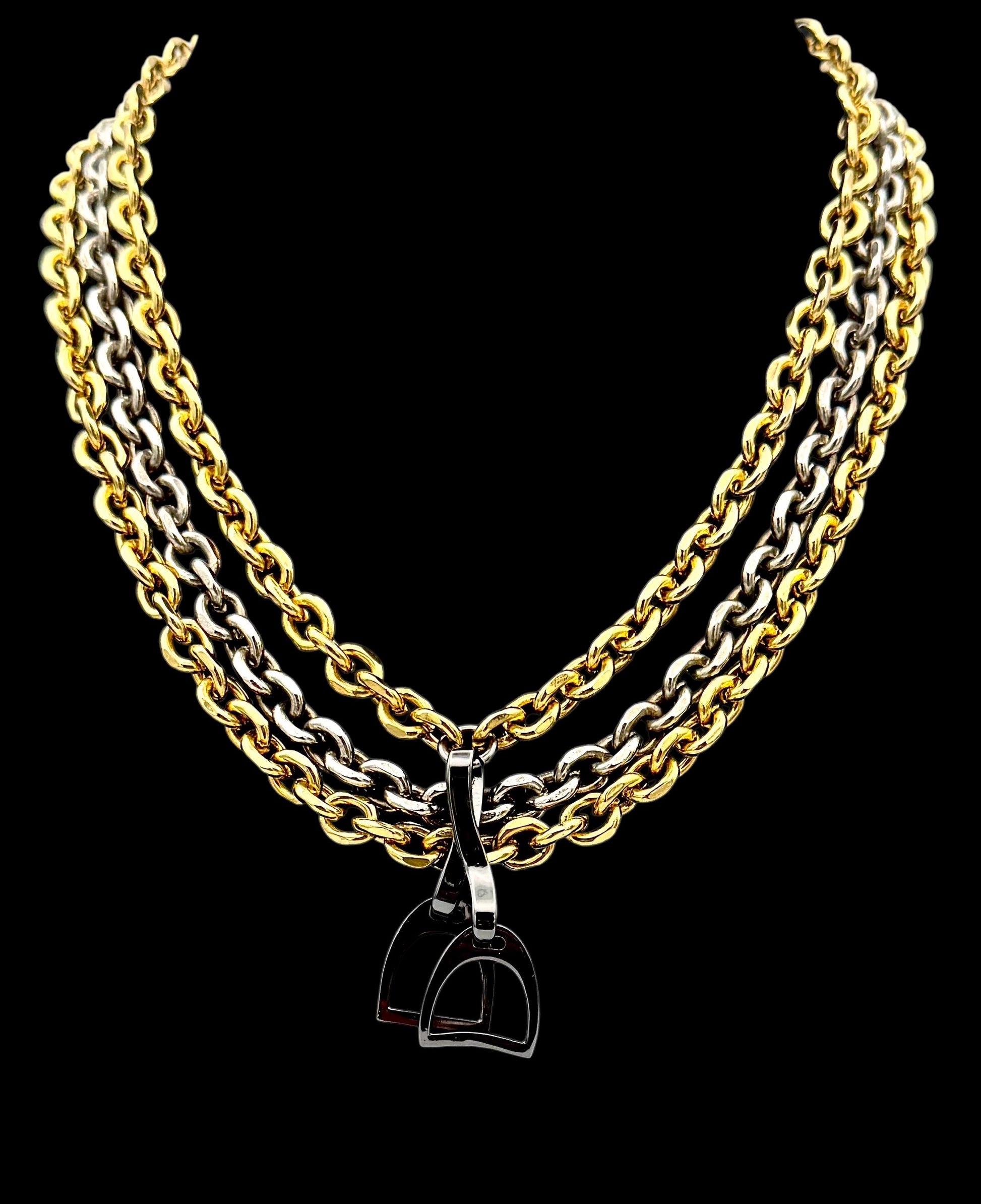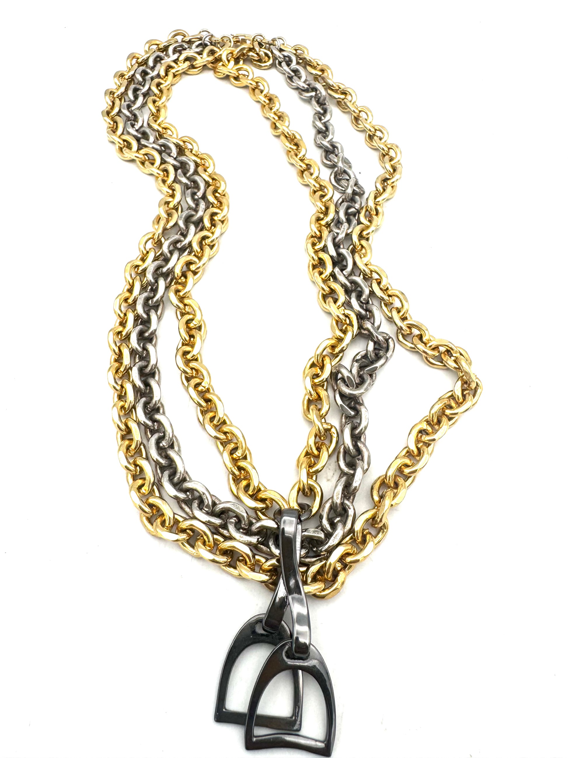 This gunmetal stirrup pendant is hung on a 1990s mixed metal layered necklace to create this fun piece. Length is 18”.