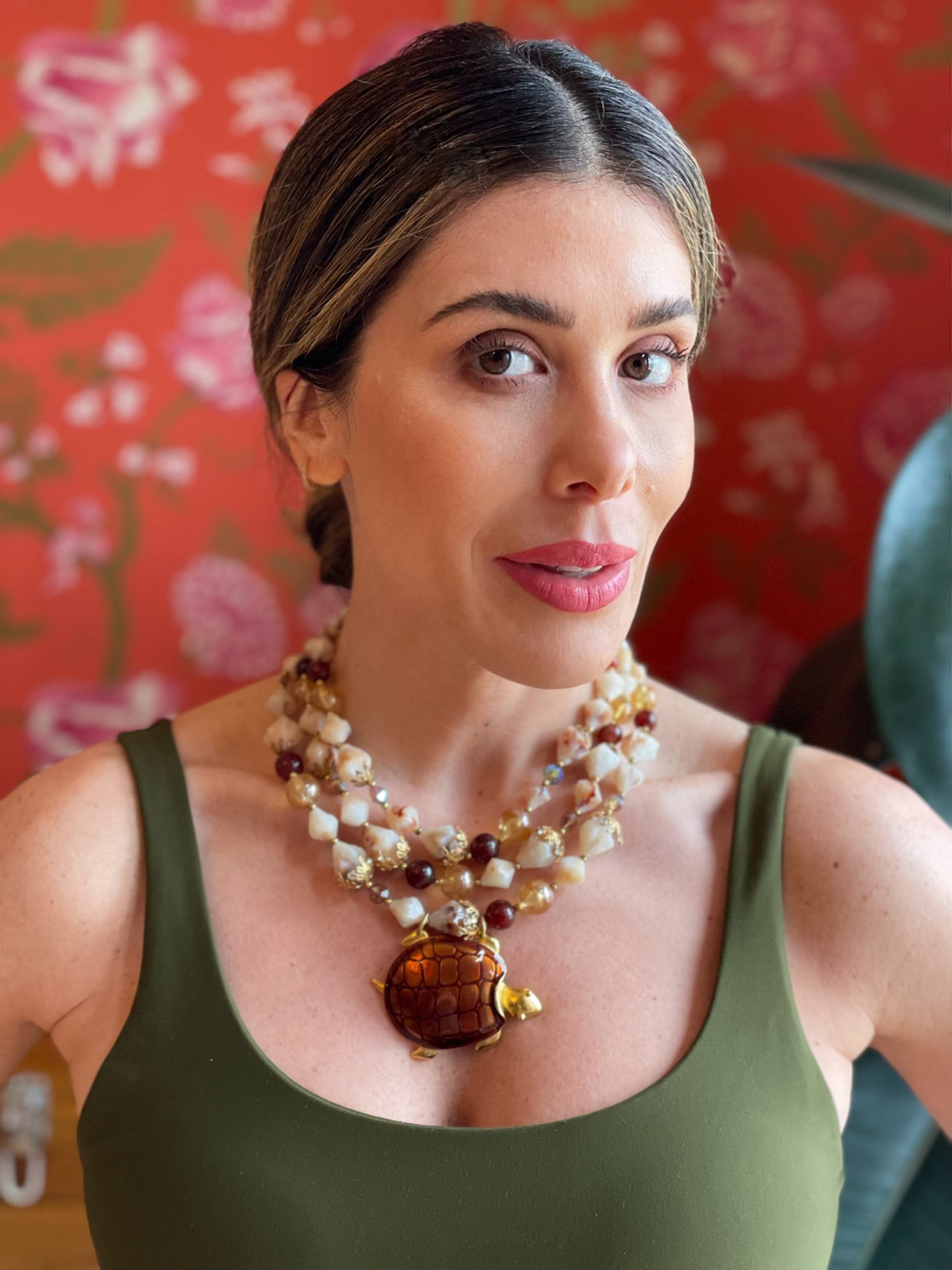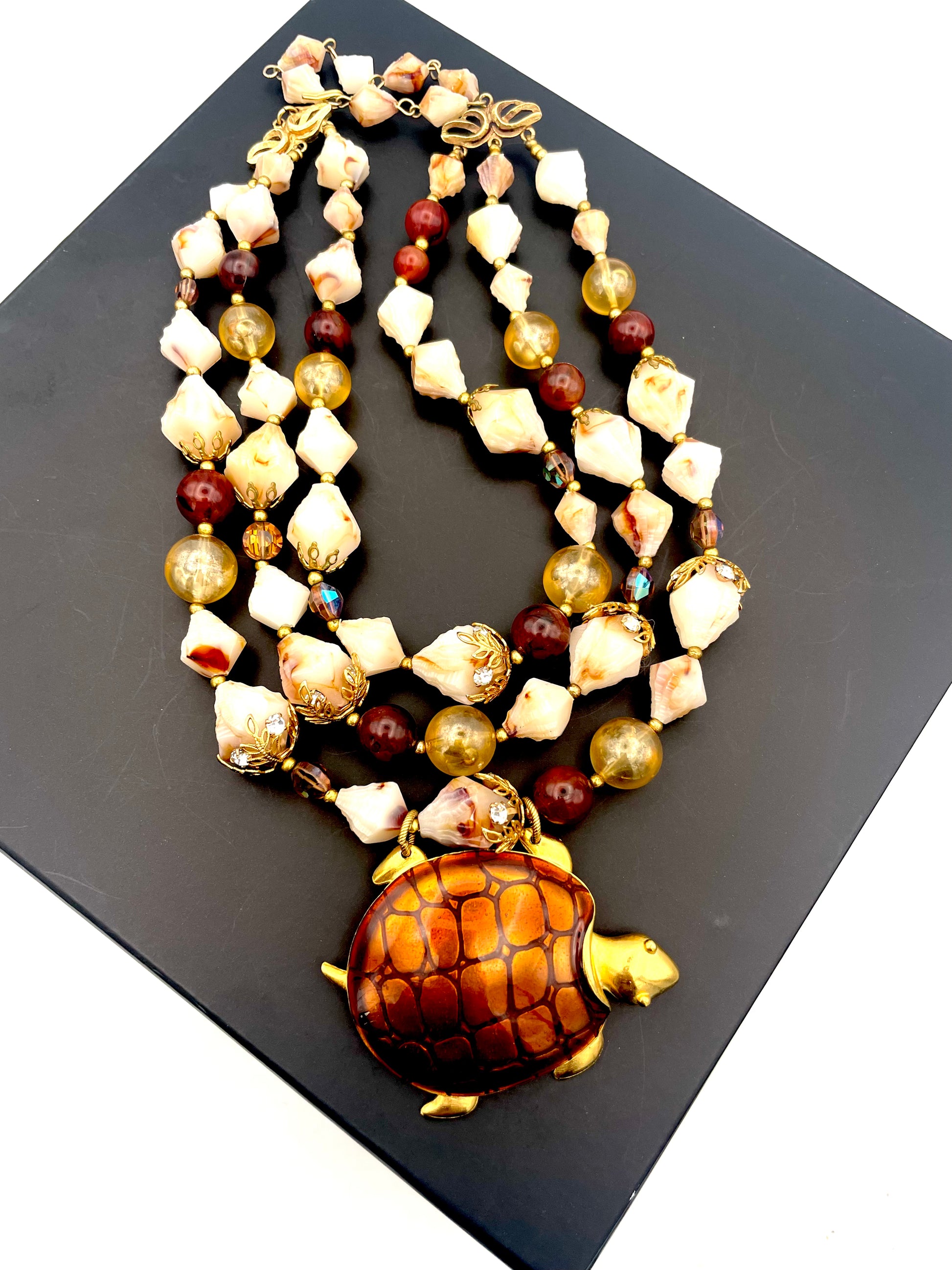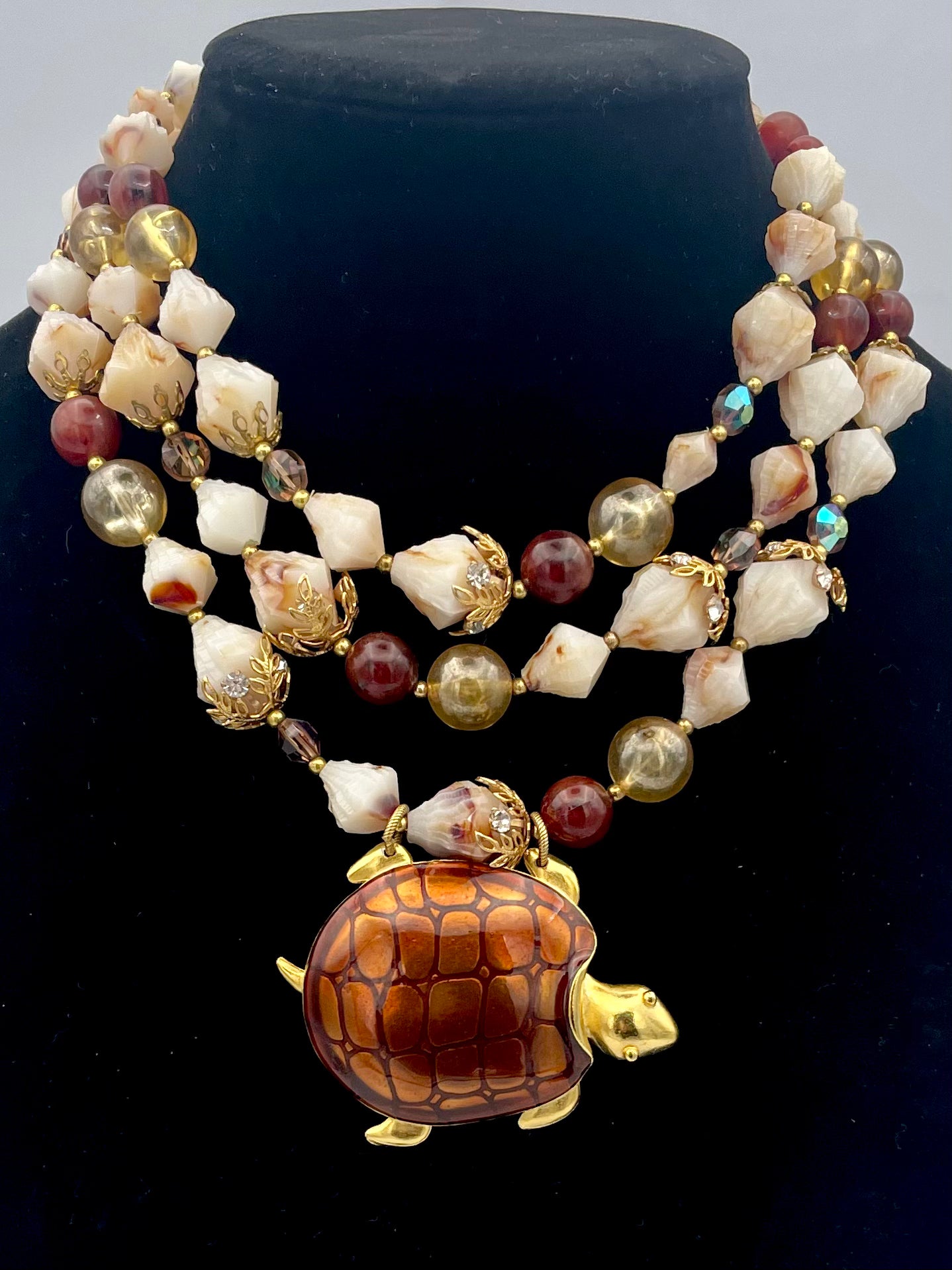 How stunning is this 1960's lucite and glass beads necklace? I sourced this from a West Virginia estate sale and added on a 1960's turtle brooch, sourced from a New Jersey estate sale, to craft this one-of-a-kind piece. Length is 15"-17.5" with an adjustable hook closure.
