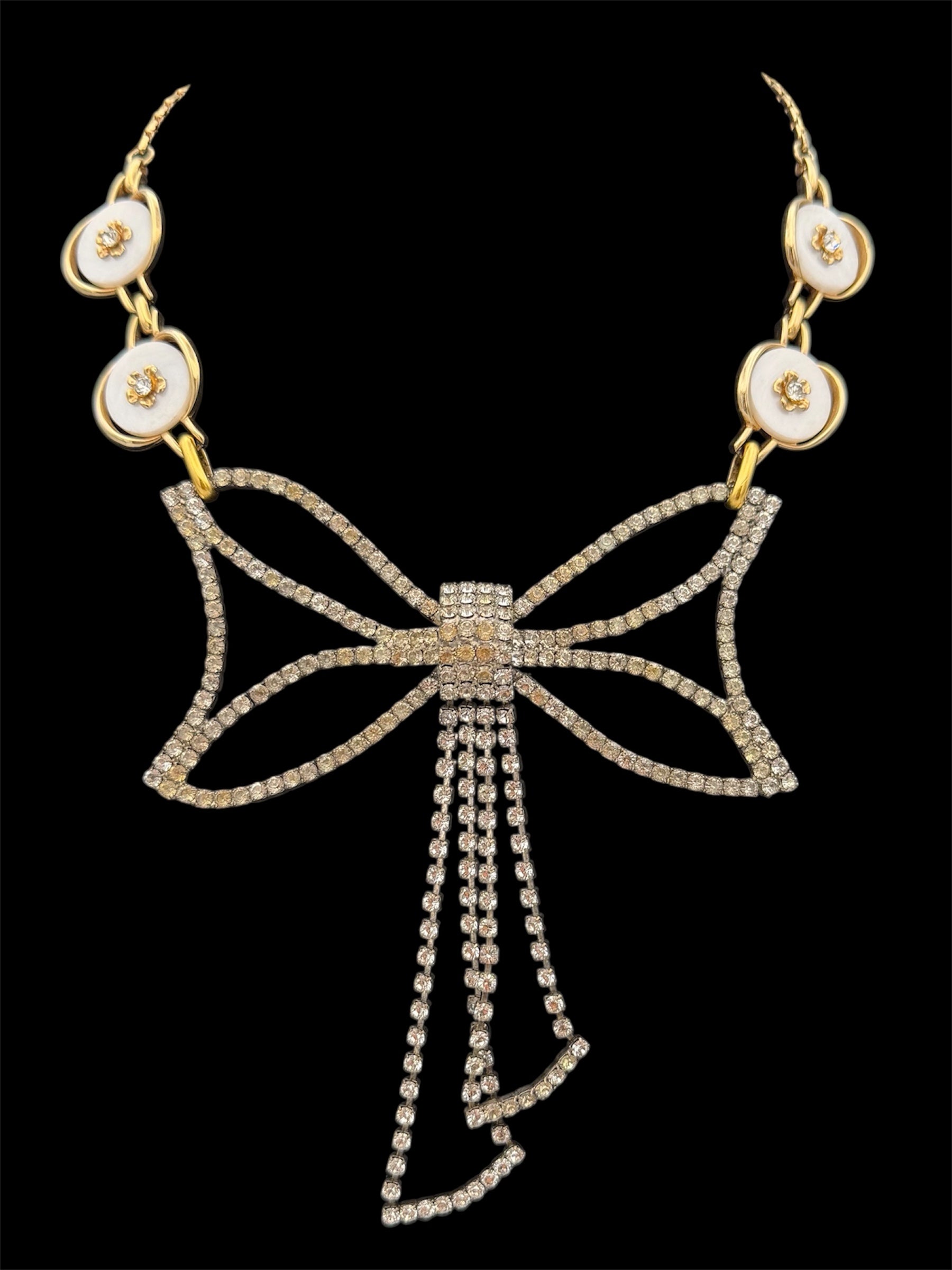 This piece is for the true vintage lover—not the collector seeking perfect sparkle or showroom shine. The bow is an authentic early-1900s rhinestone treasure, showing its age beautifully with softly mellowed stones and time-worn character that only decades can create. I paired it with a reworked 1950s necklace, allowing the history, patina, and imperfections to remain front and center. Romantic, rare, and unapologetically vintage—meant to be worn by someone who values soul over perfection.