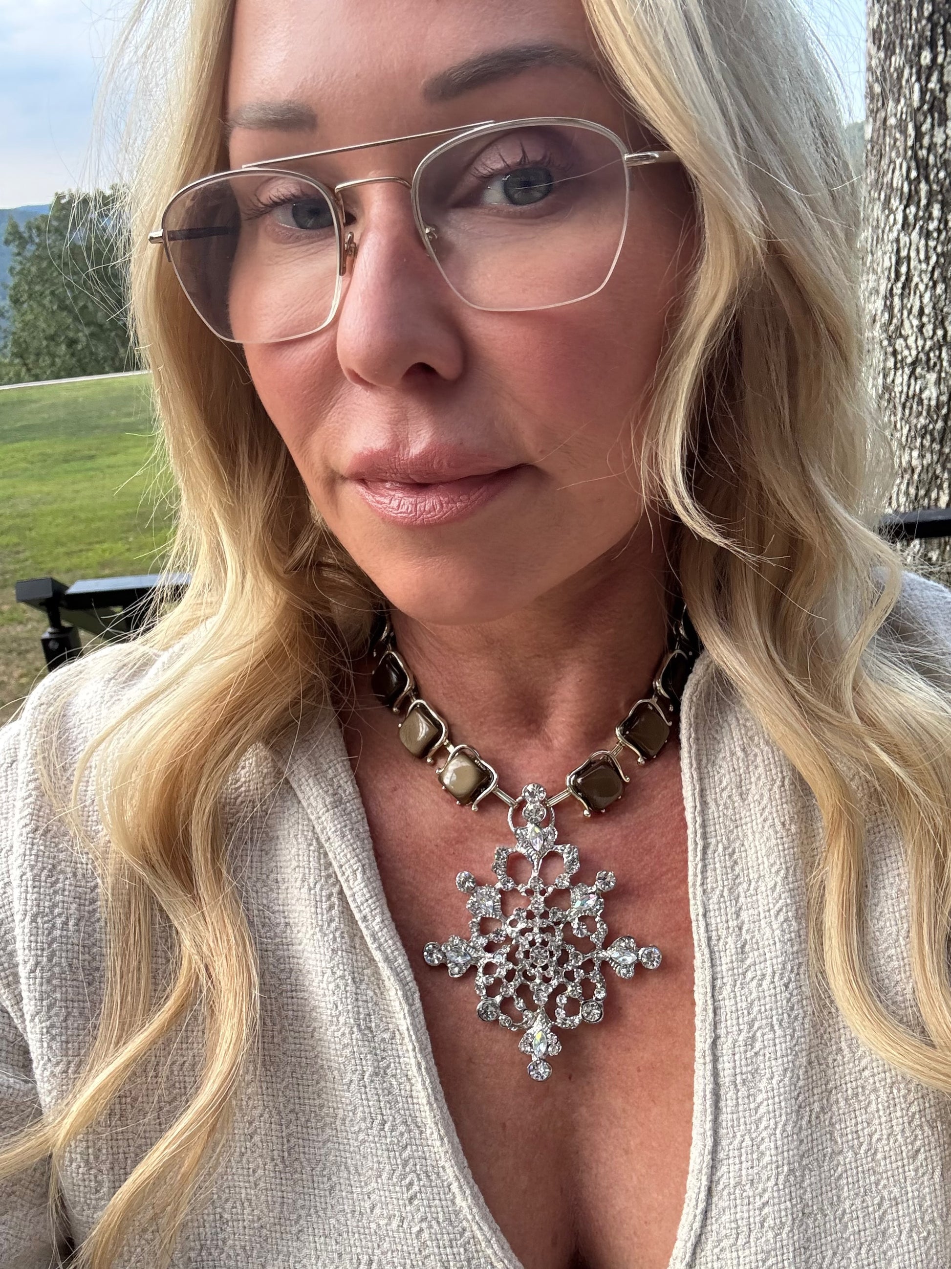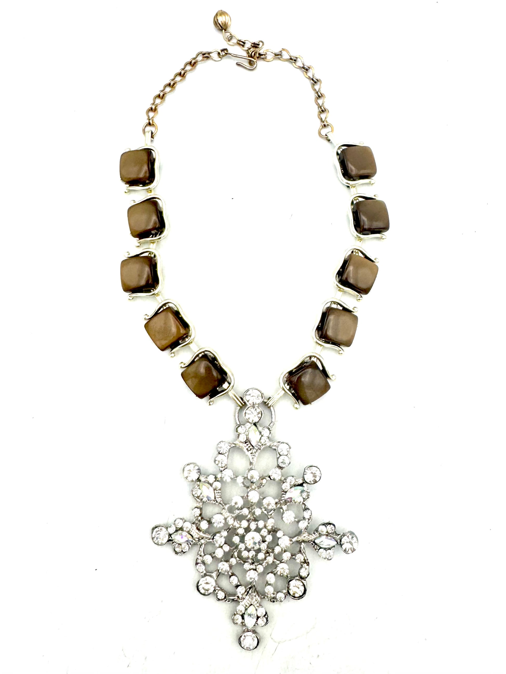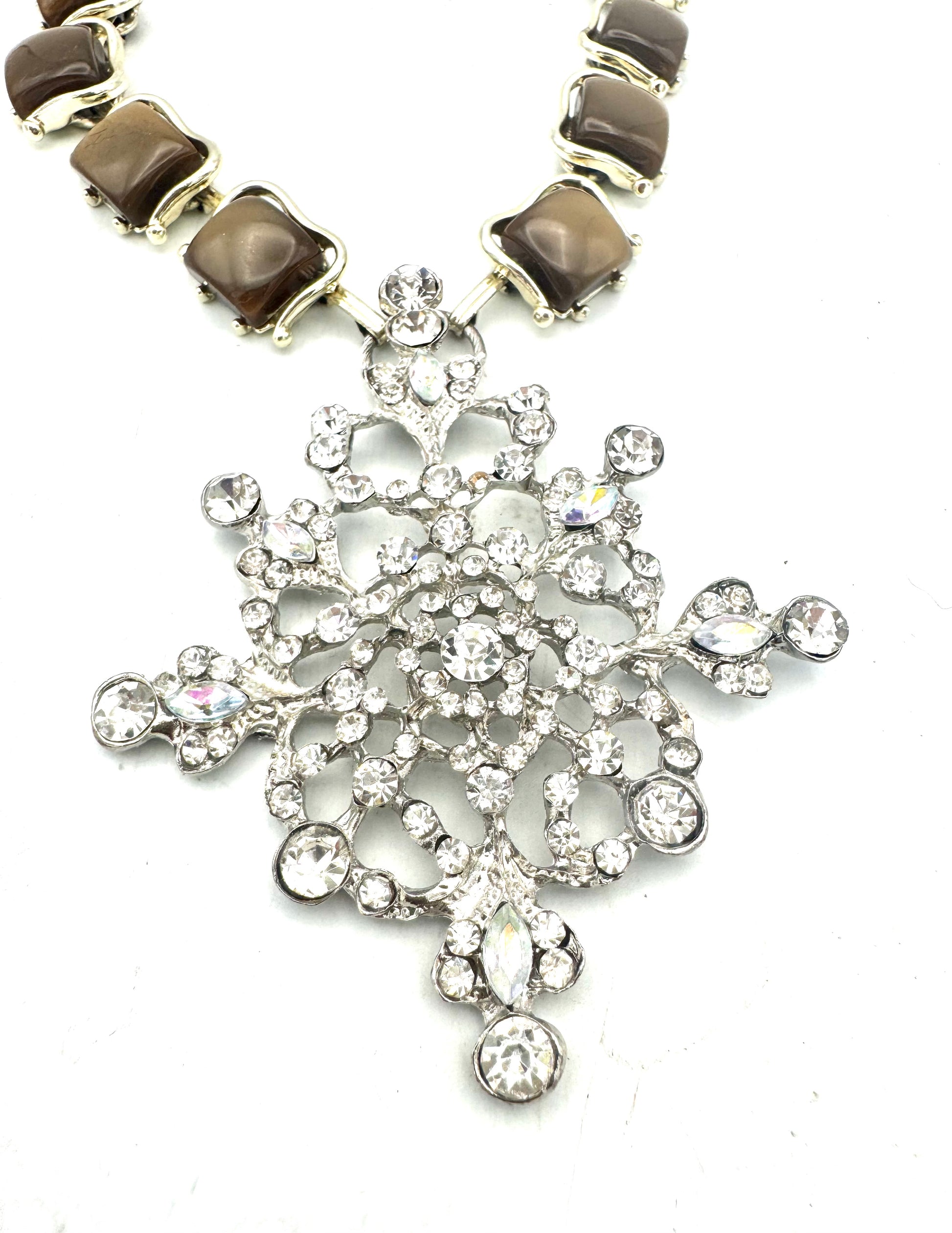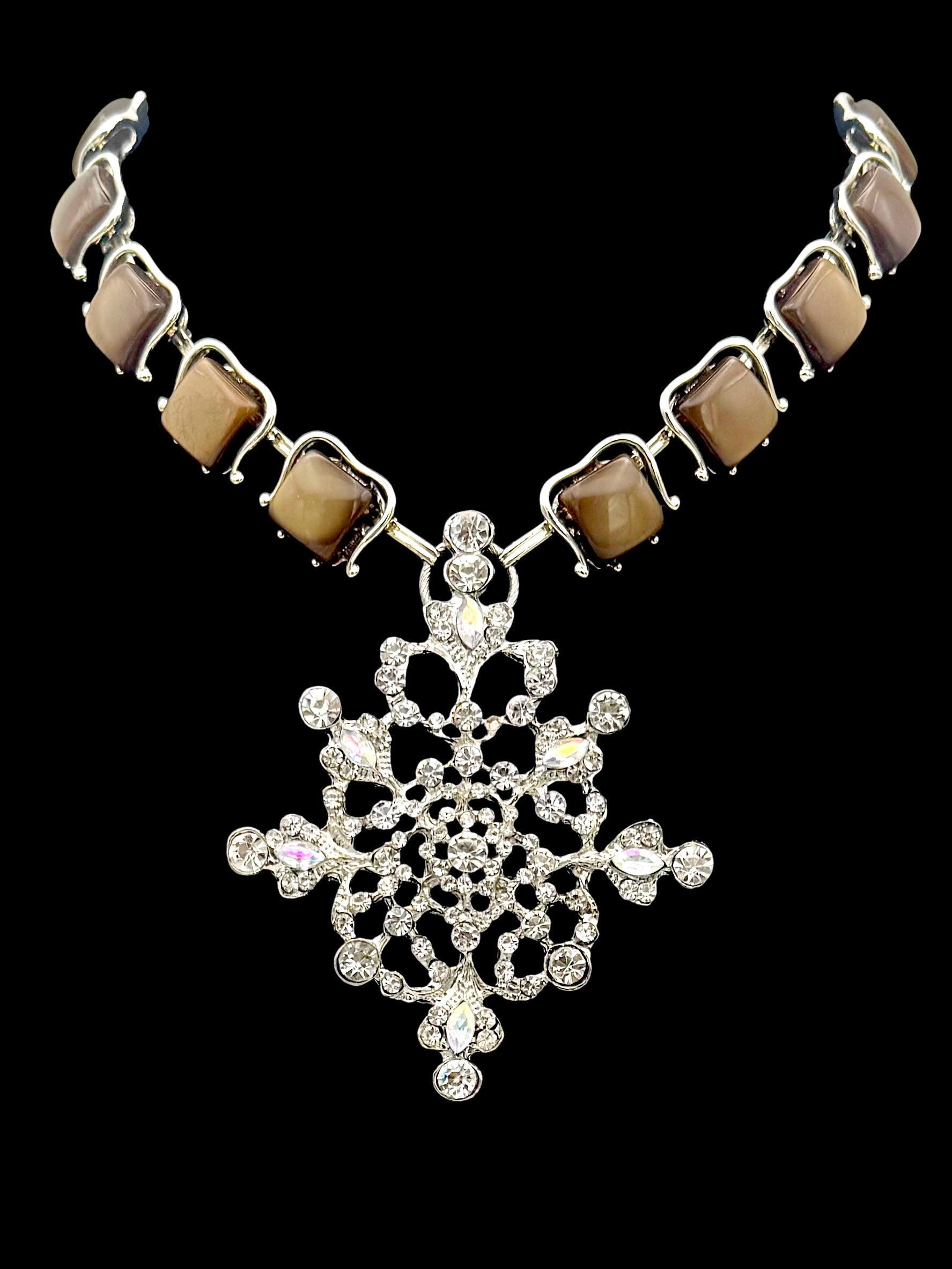 Vintage mocha brown thermoset collar turned into a statement with this 1960’s clear sparkling brooch.