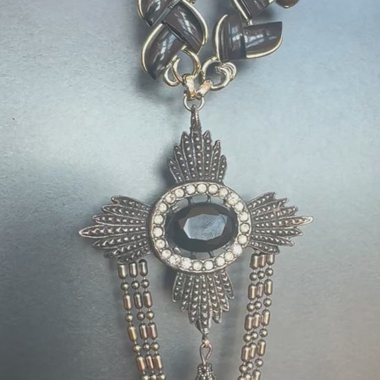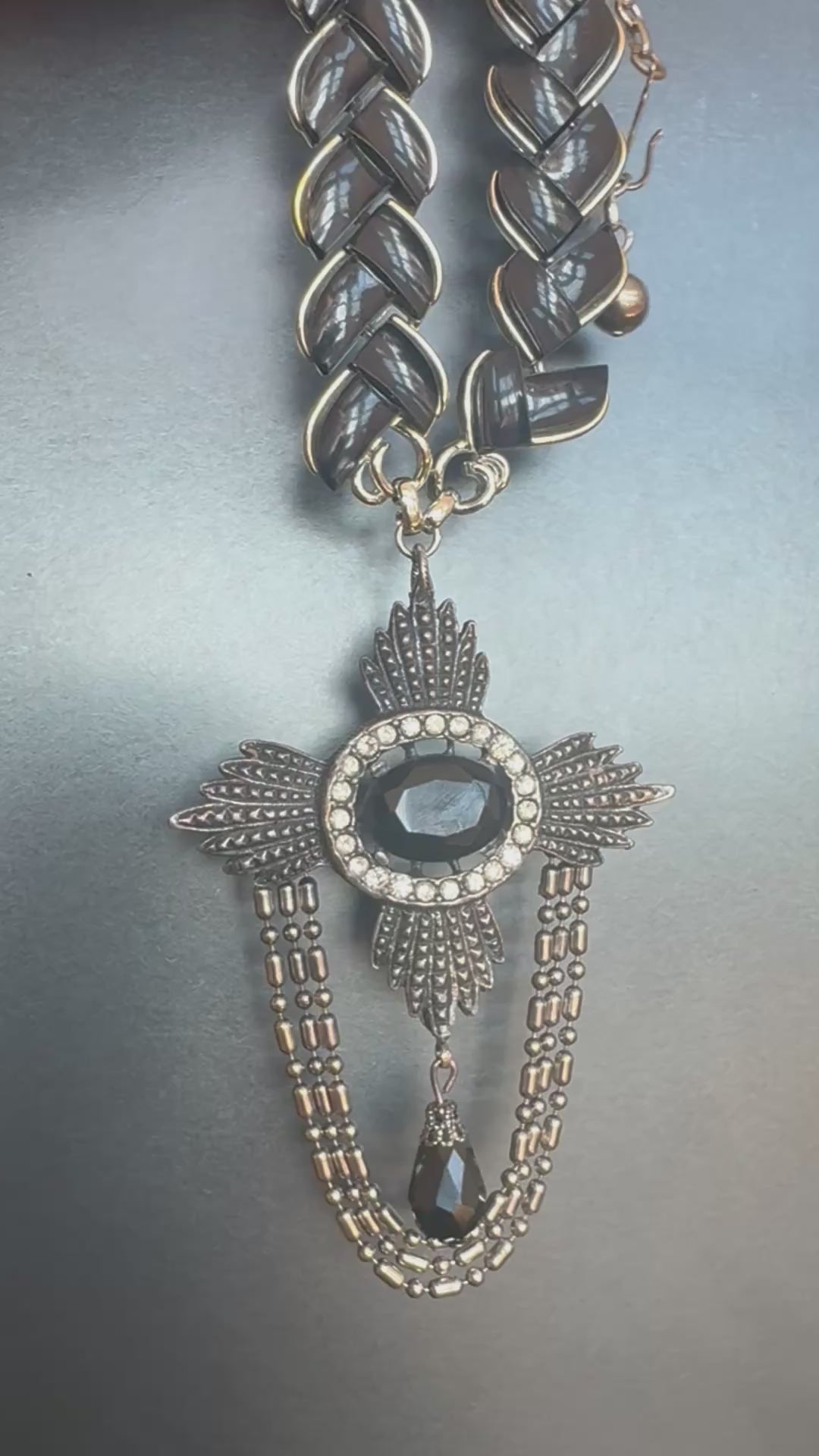 A vintage 1940s rhinestone brooch reimagined on a black thermoset collar. Bold, sculptural, and timeless in deep onyx tones.