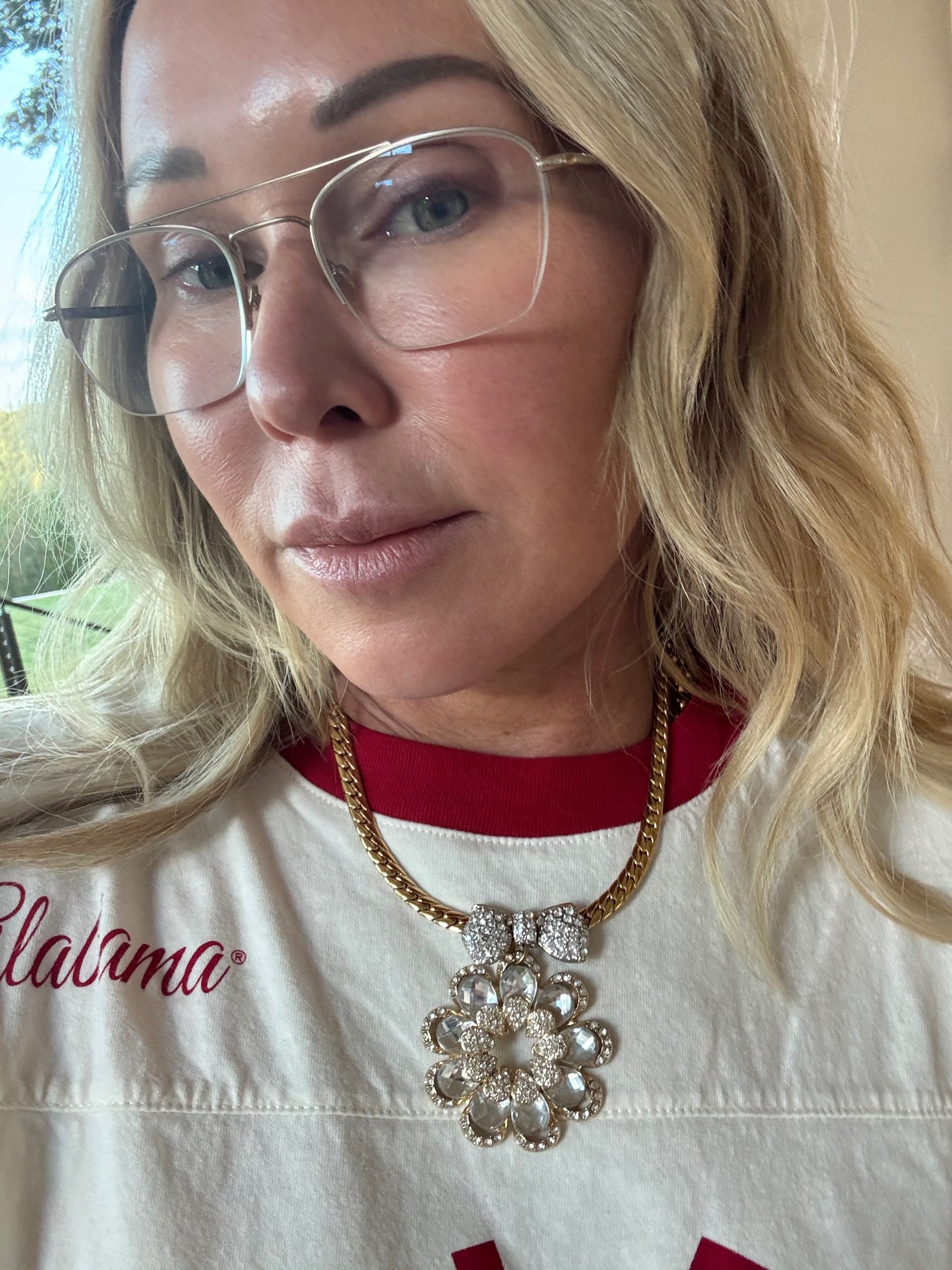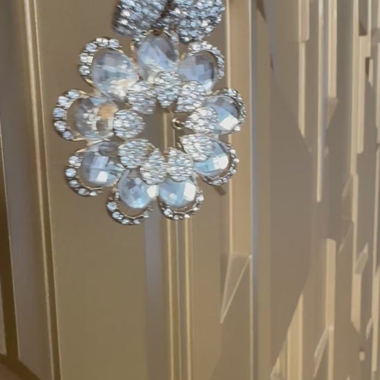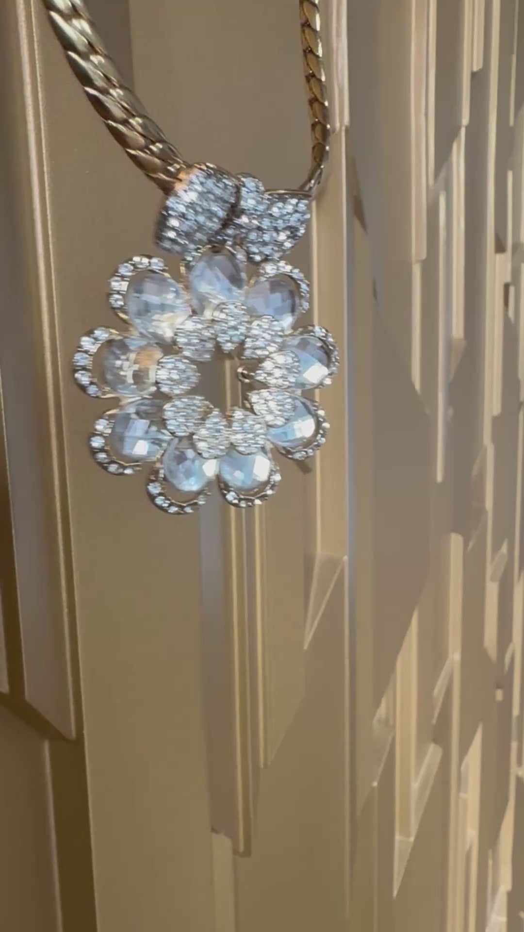 A radiant gold collar discovered in Paris, featuring a pavé crystal bow and a dazzling flower pendant with teardrop crystals. Bold yet feminine — a timeless statement with Parisian charm.