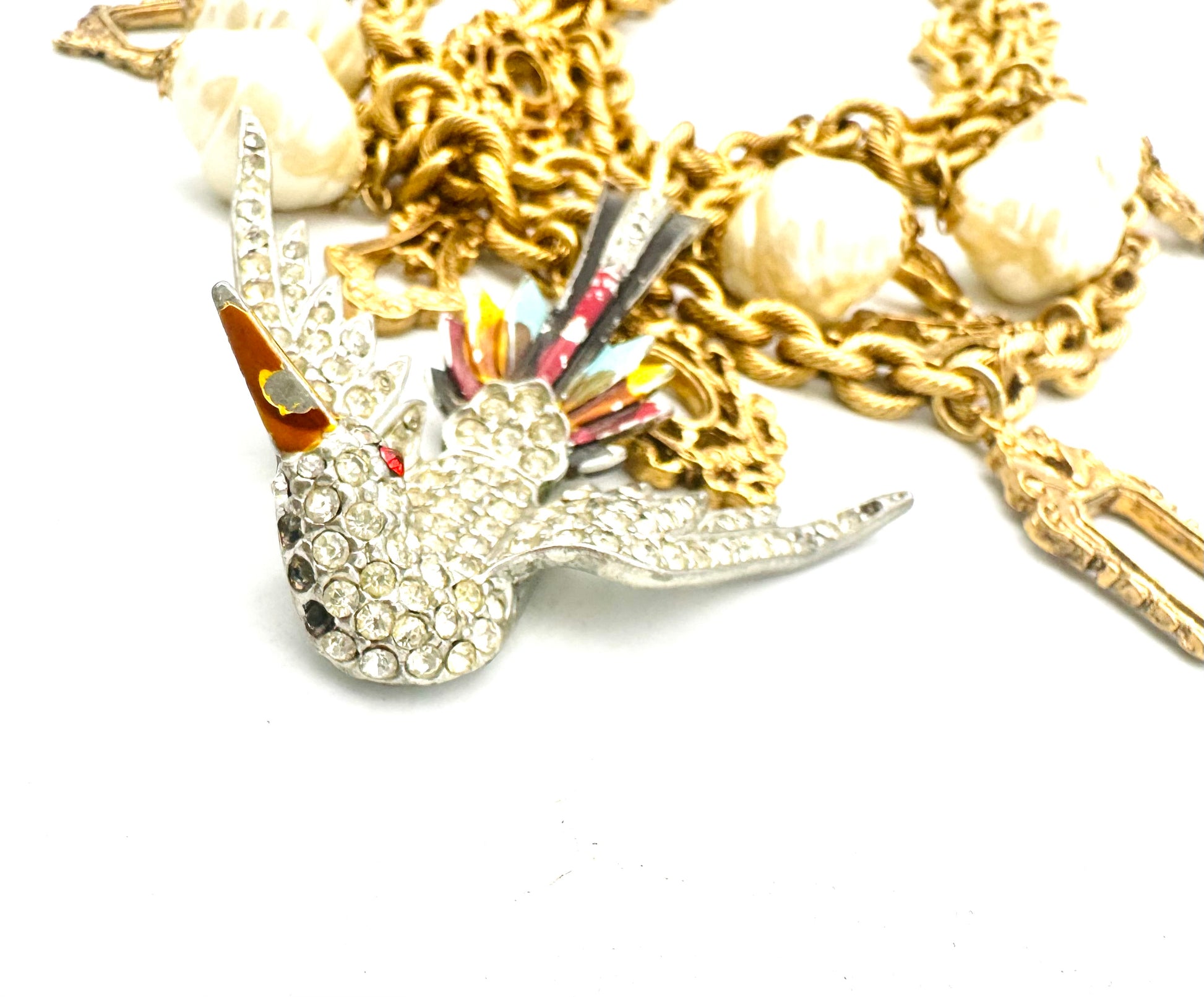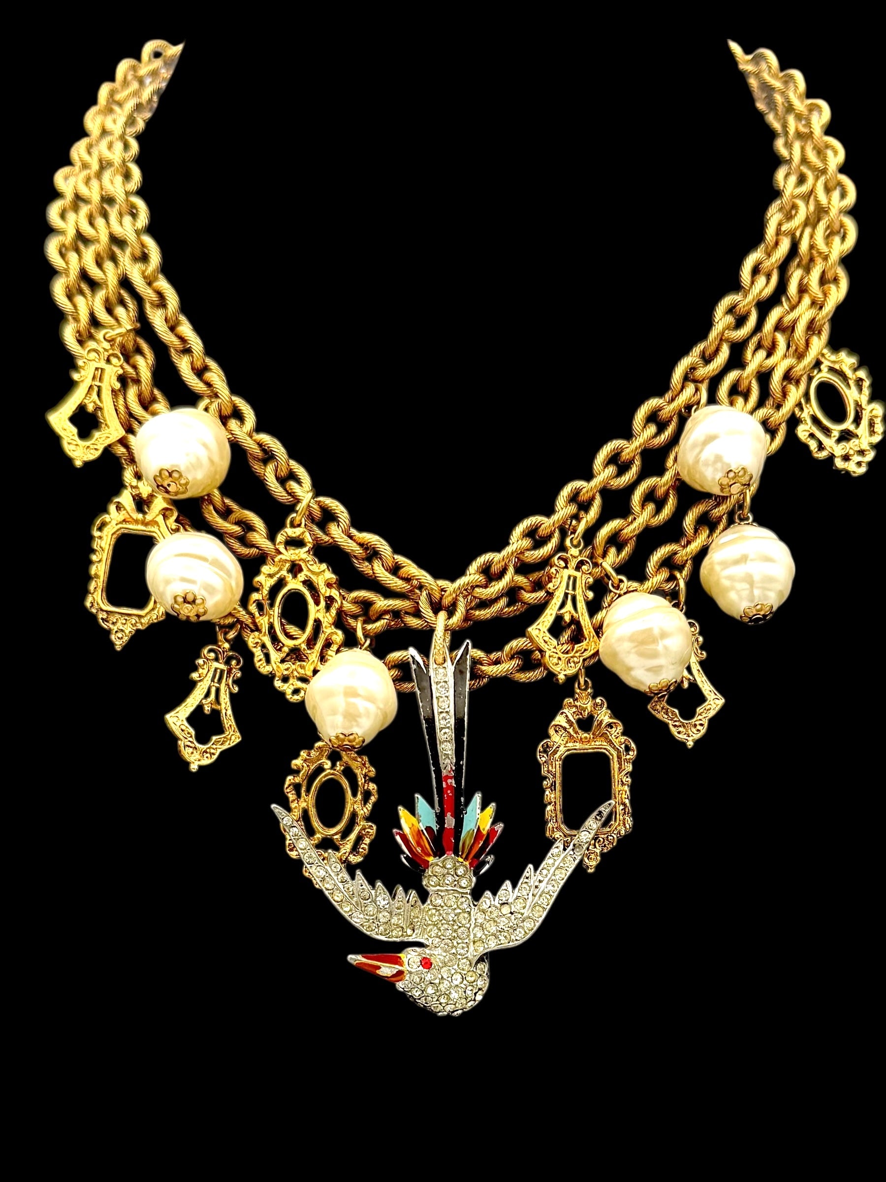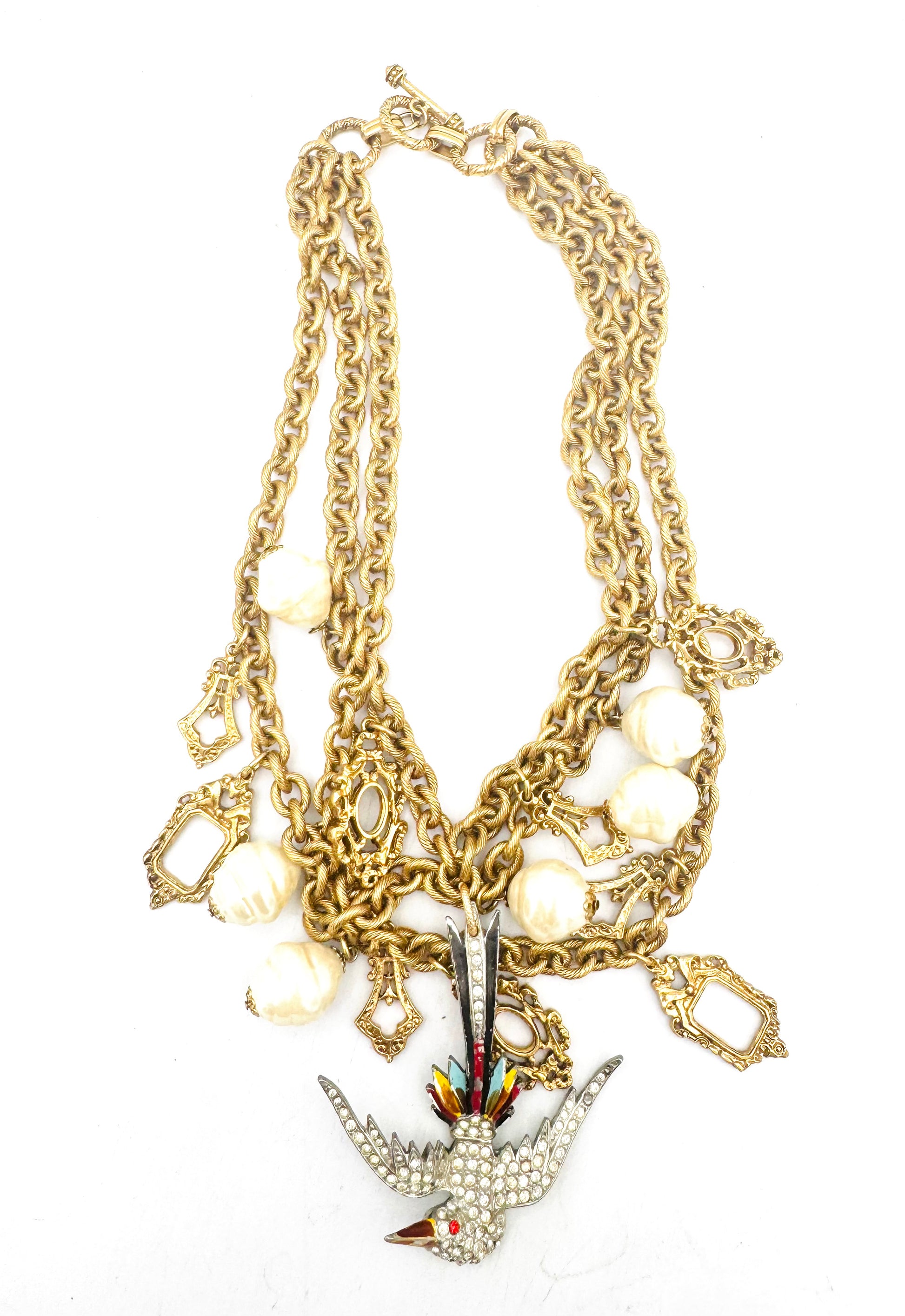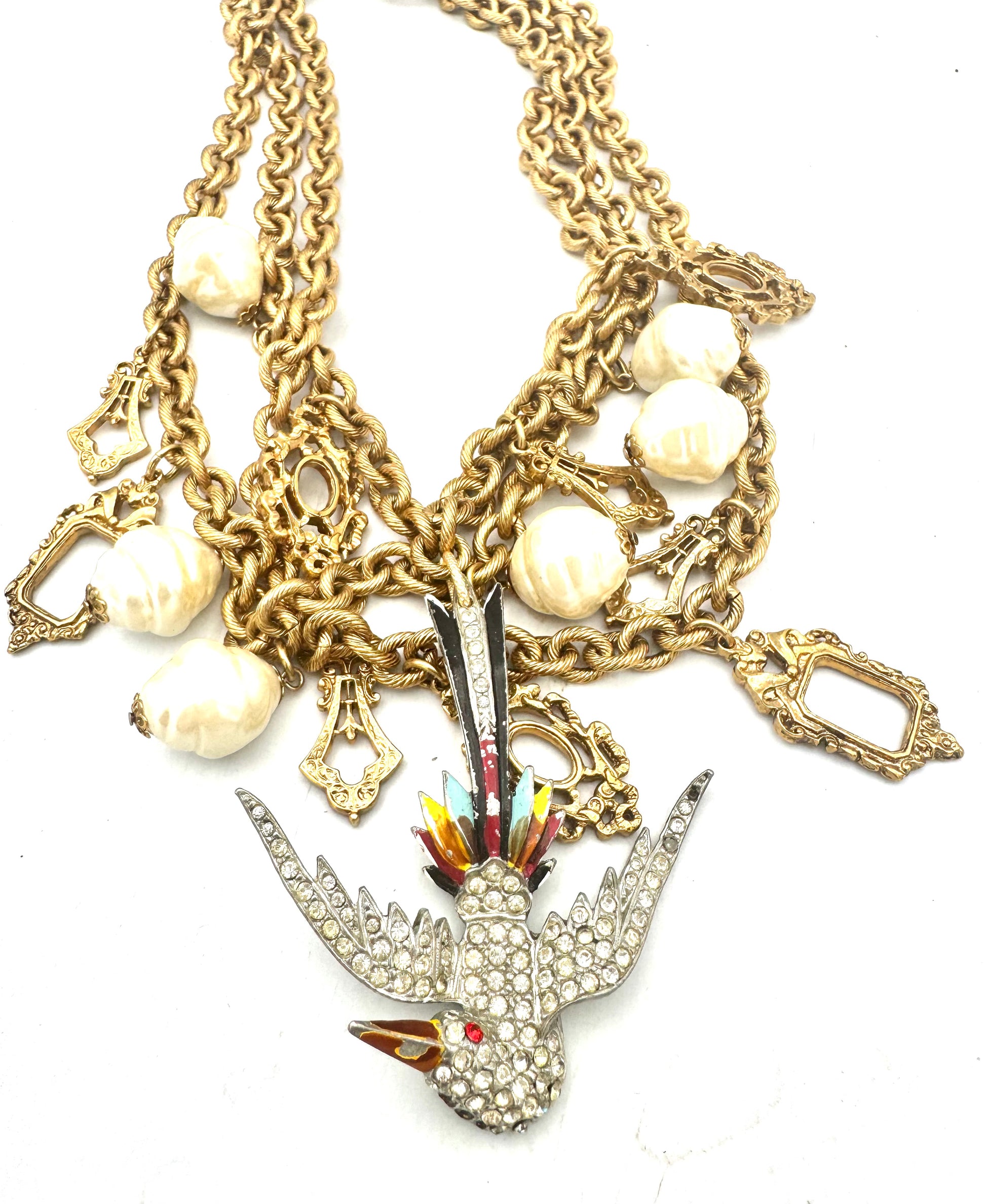 - “Vintage charm necklace with frame-like pendants, glass pearl, and a vibrant phoenix centerpiece.