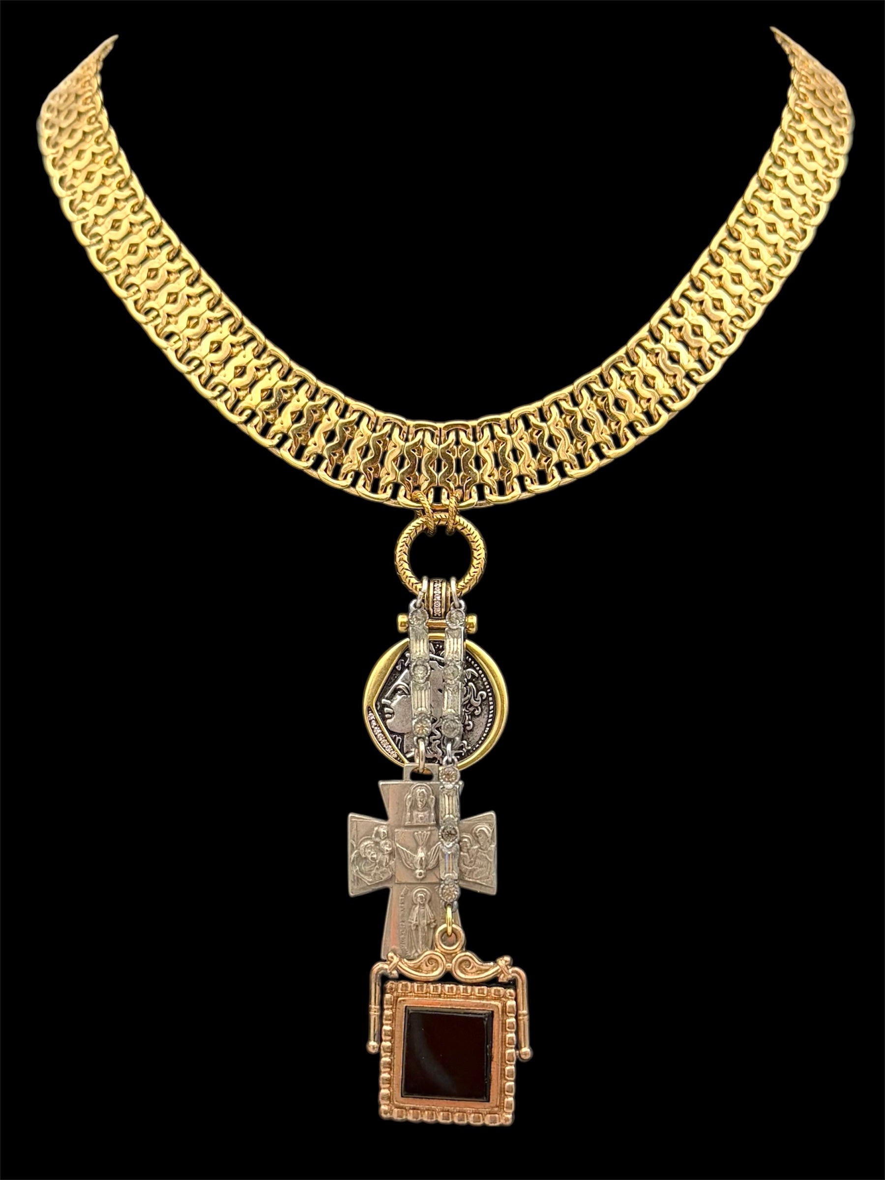 My favorite woven Monet collar suspends a spinning antique watch fob with intaglio inset, a vintage coin medallion, and an engraved cross lifted on Art Deco chain. Symbolic, layered, and rich with history.