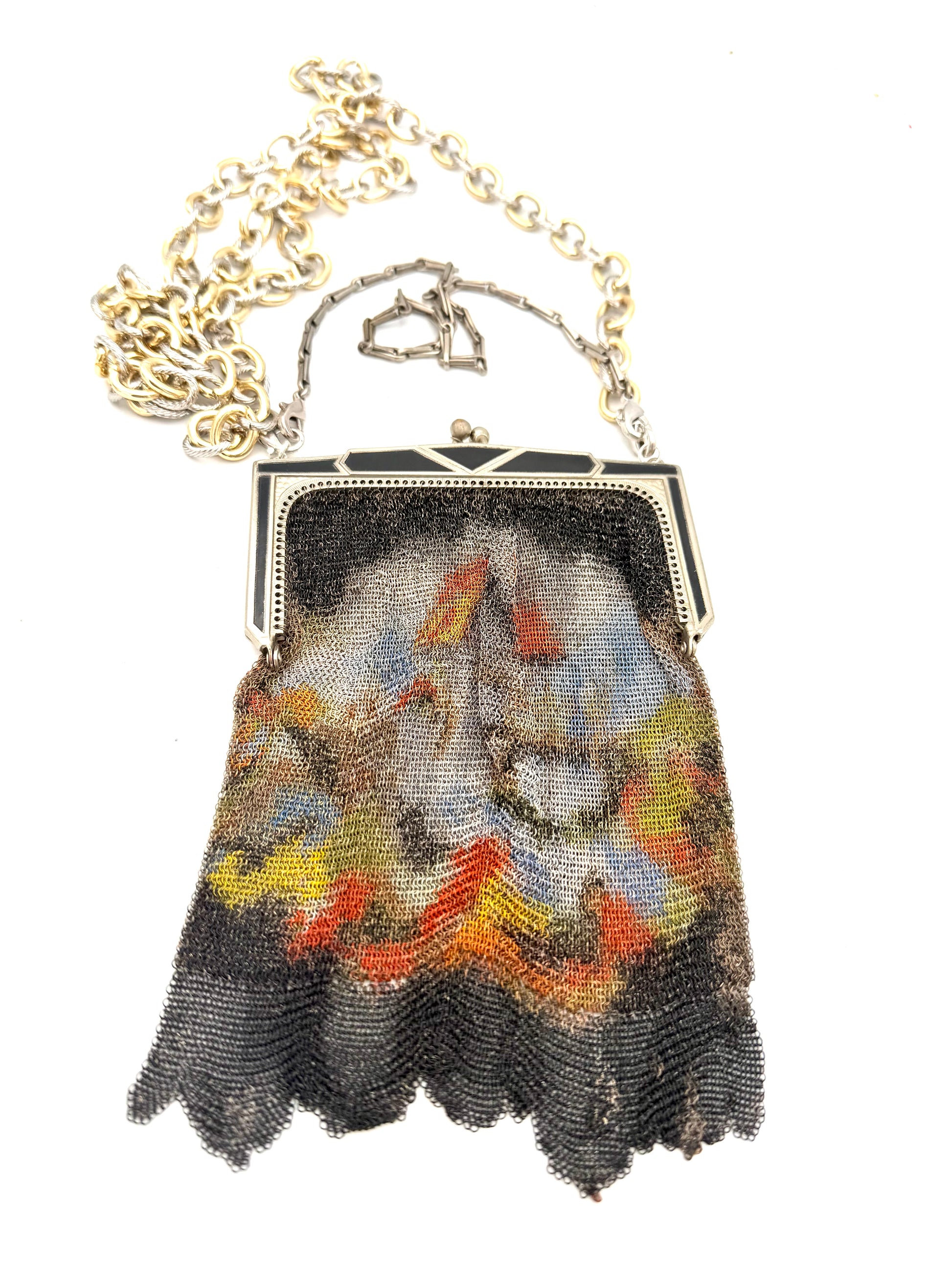 Vintage metal mesh purse designed in the 1920s by Whiting & Davis, featuring a fluid, painterly scenic pattern woven into the mesh that drapes and shimmers with movement.