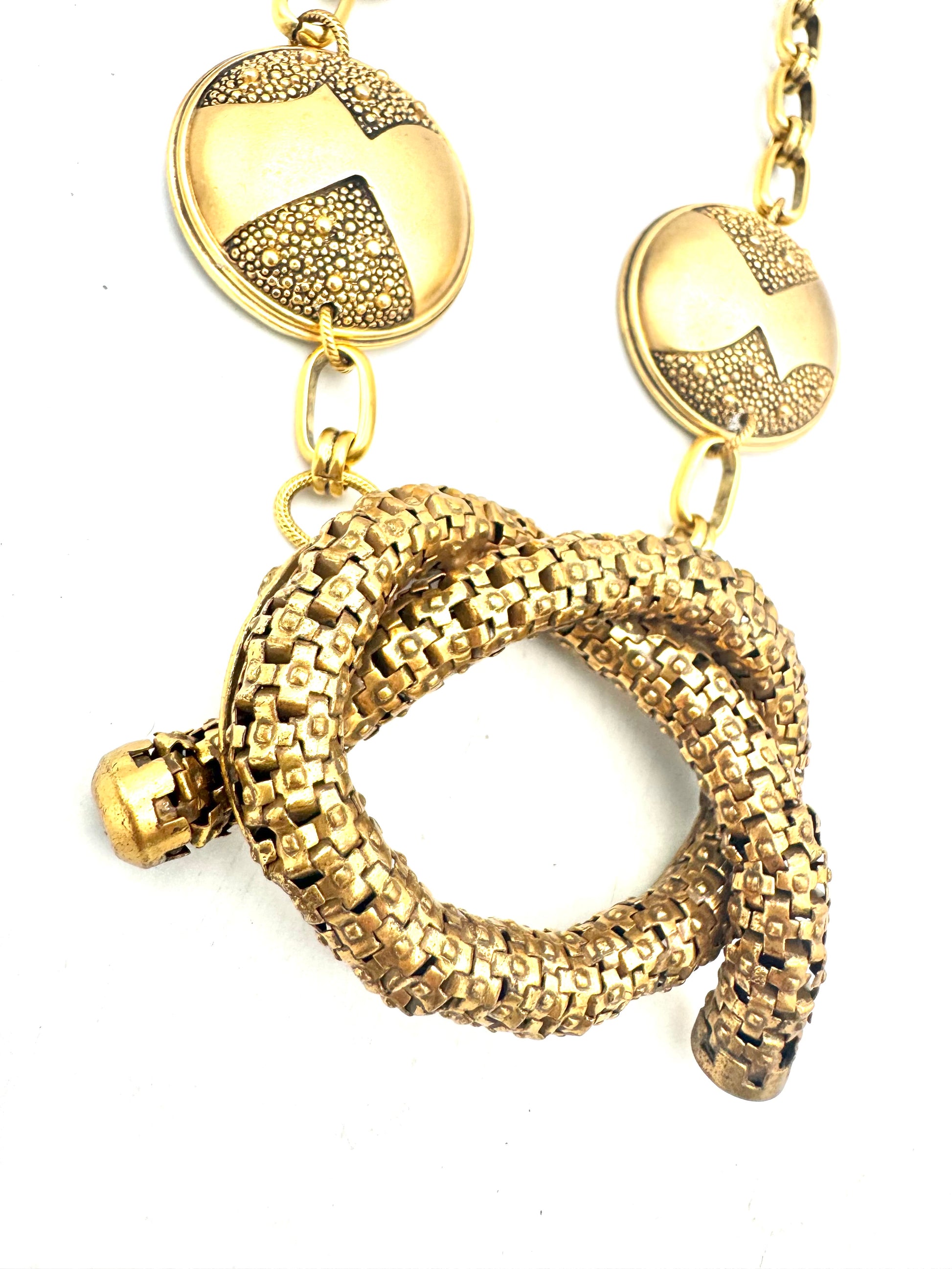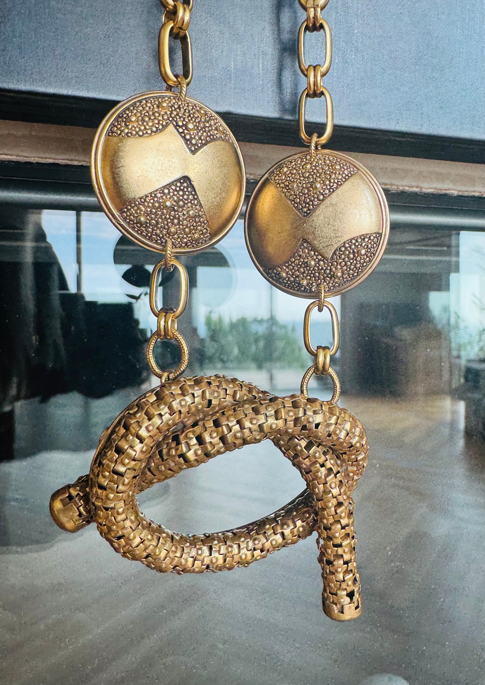 A bold brutalist-era brooch, with sculptural pretzel-like curves and subtle articulation, transformed into a statement necklace by pairing it with two 1960s earring clips — a striking fusion of texture, movement, and mid-century design.