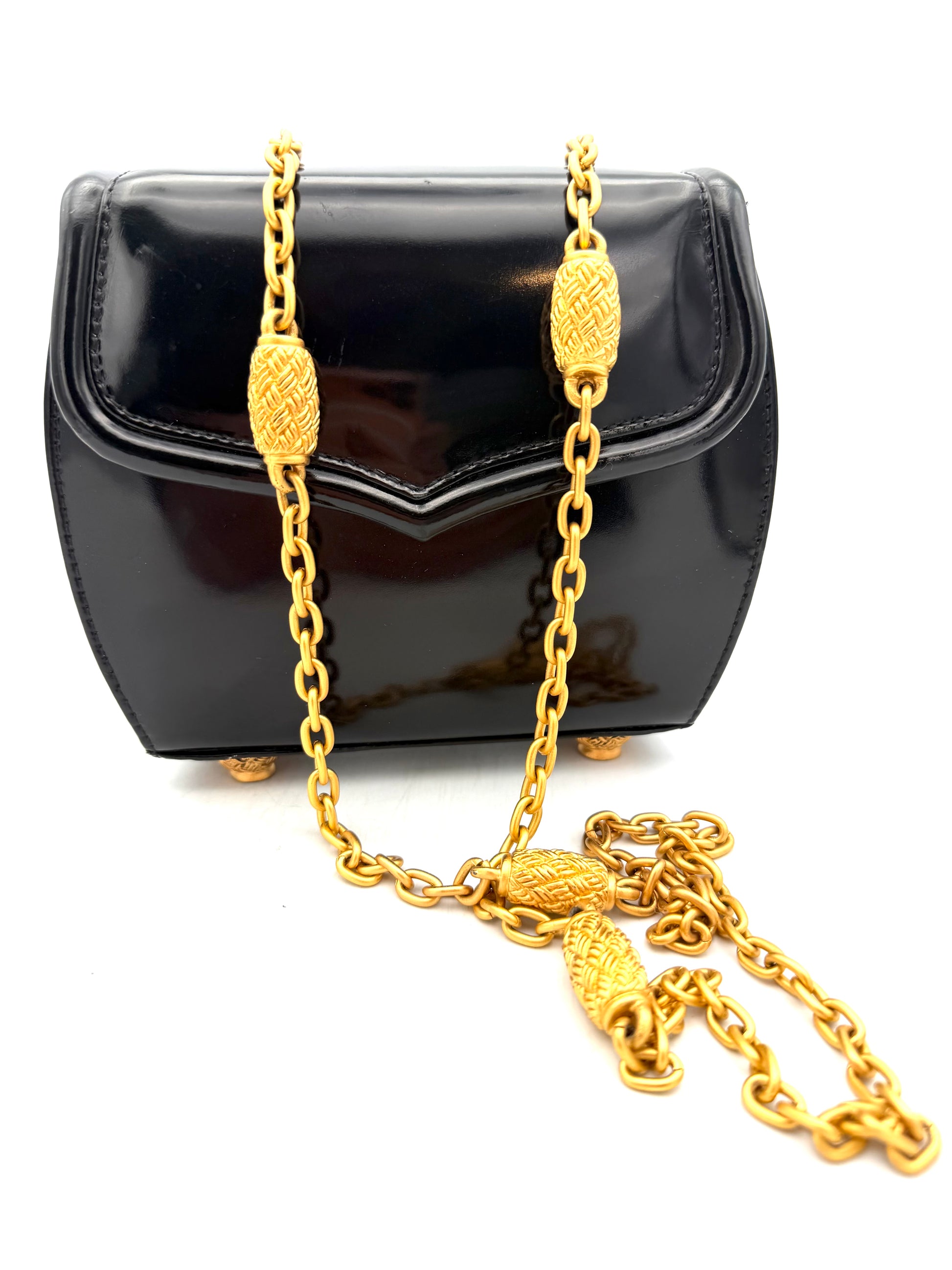 I fell in love the moment I opened it—the soft green interior against the glossy black patent felt unexpected and special. Finished with a beautifully detailed gold-tone chain strap and designer-marked feet at the base, this vintage bag was discovered in San Diego and carries that effortless California-meets-classic charm.