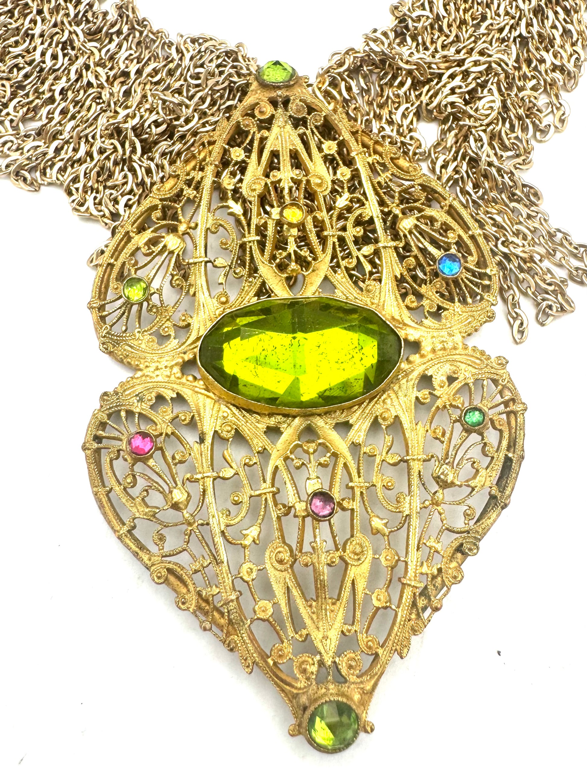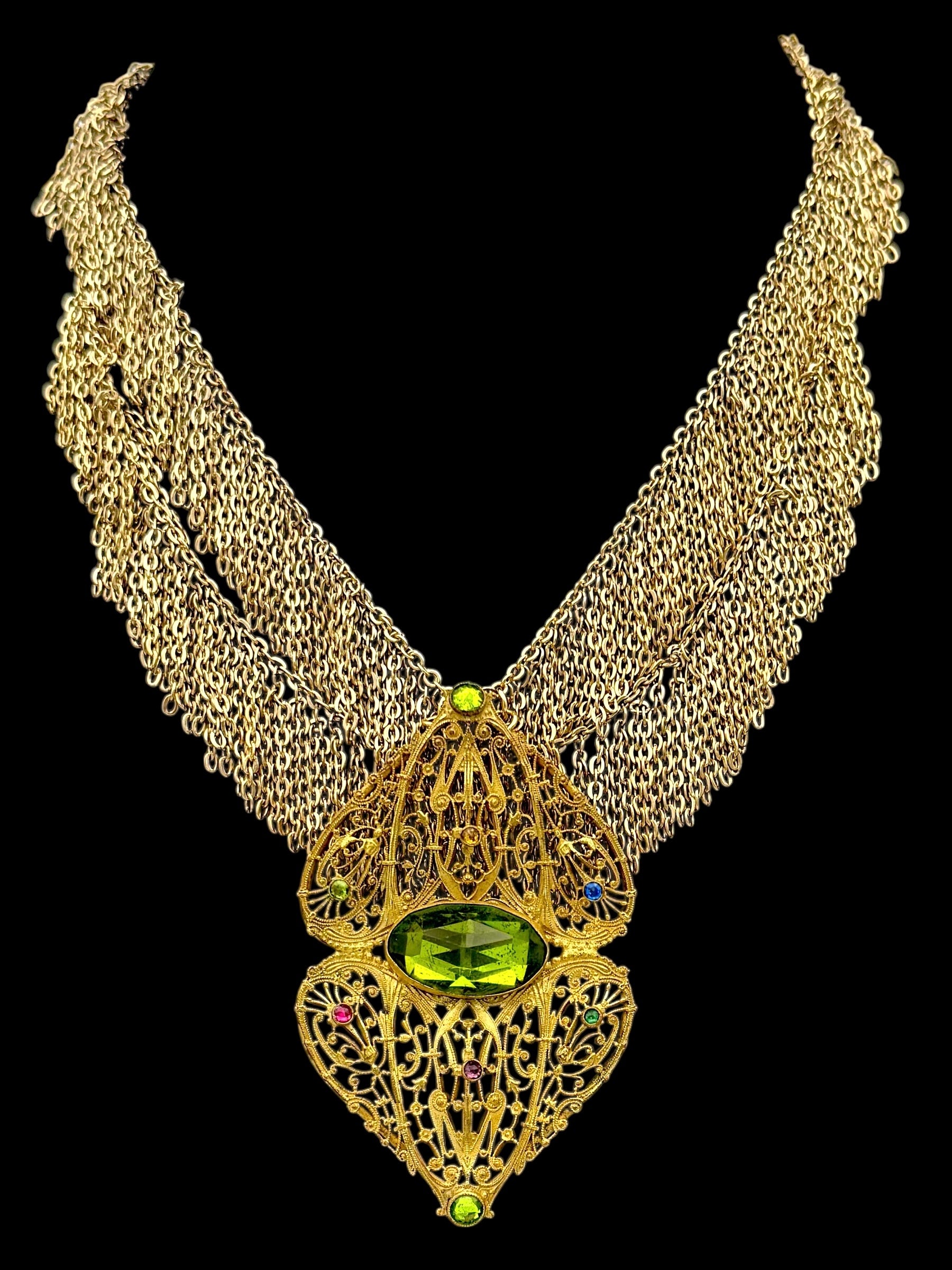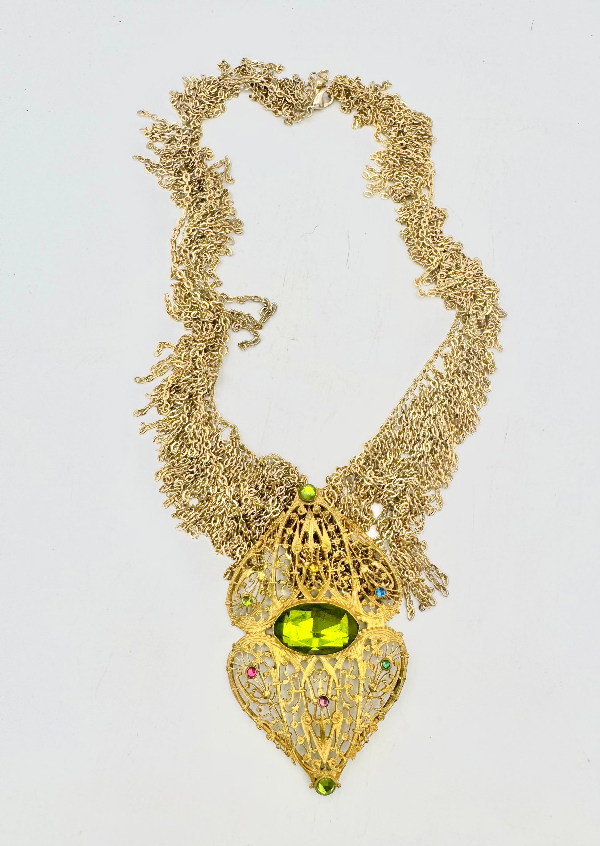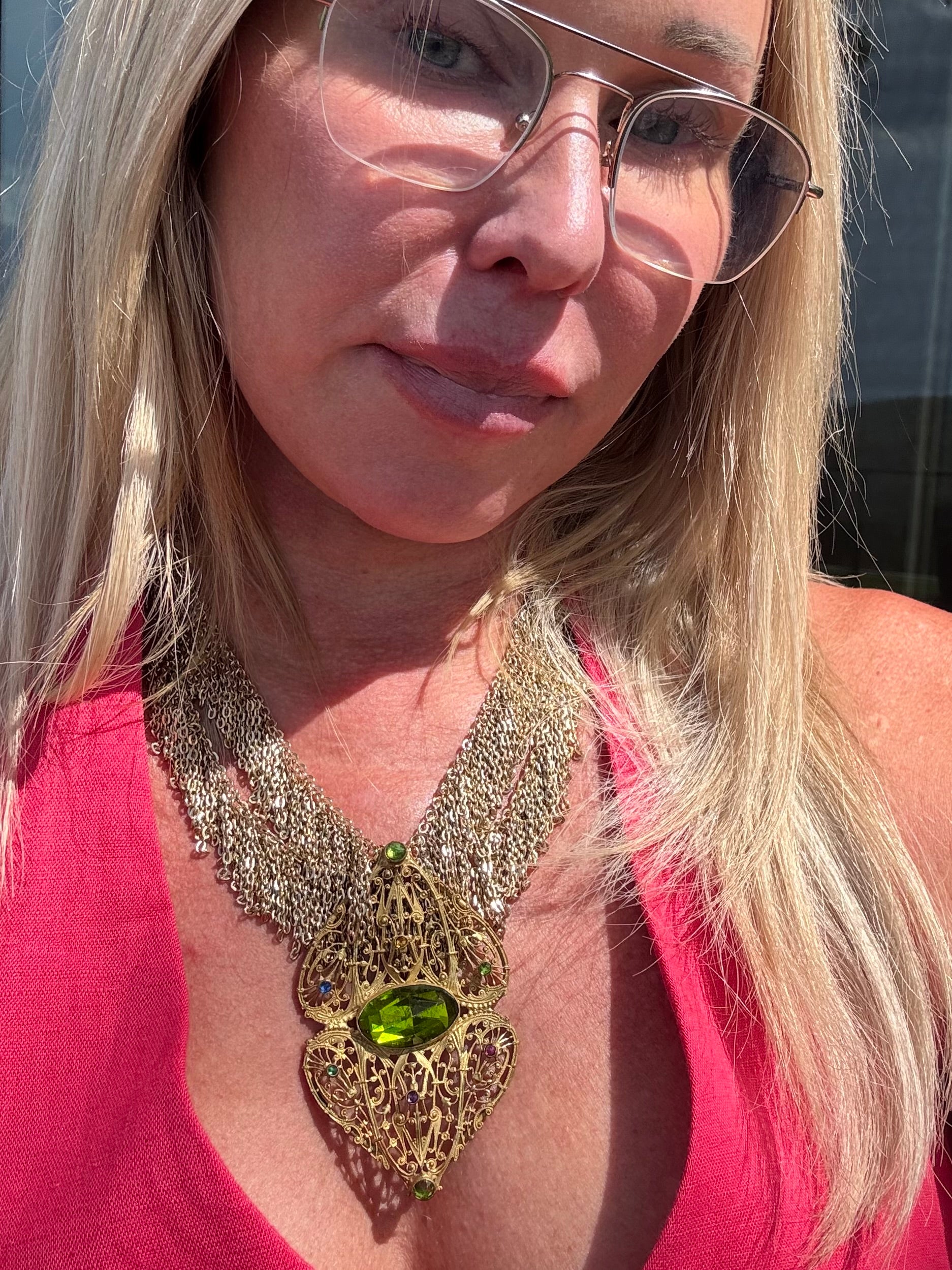 This amazing 1930s-40s brooch with intricate filigree detailing is TO DIE FOR. I added the brooch to a 1980’s fringe double layer necklace to bring the piece together. Length is 18”.