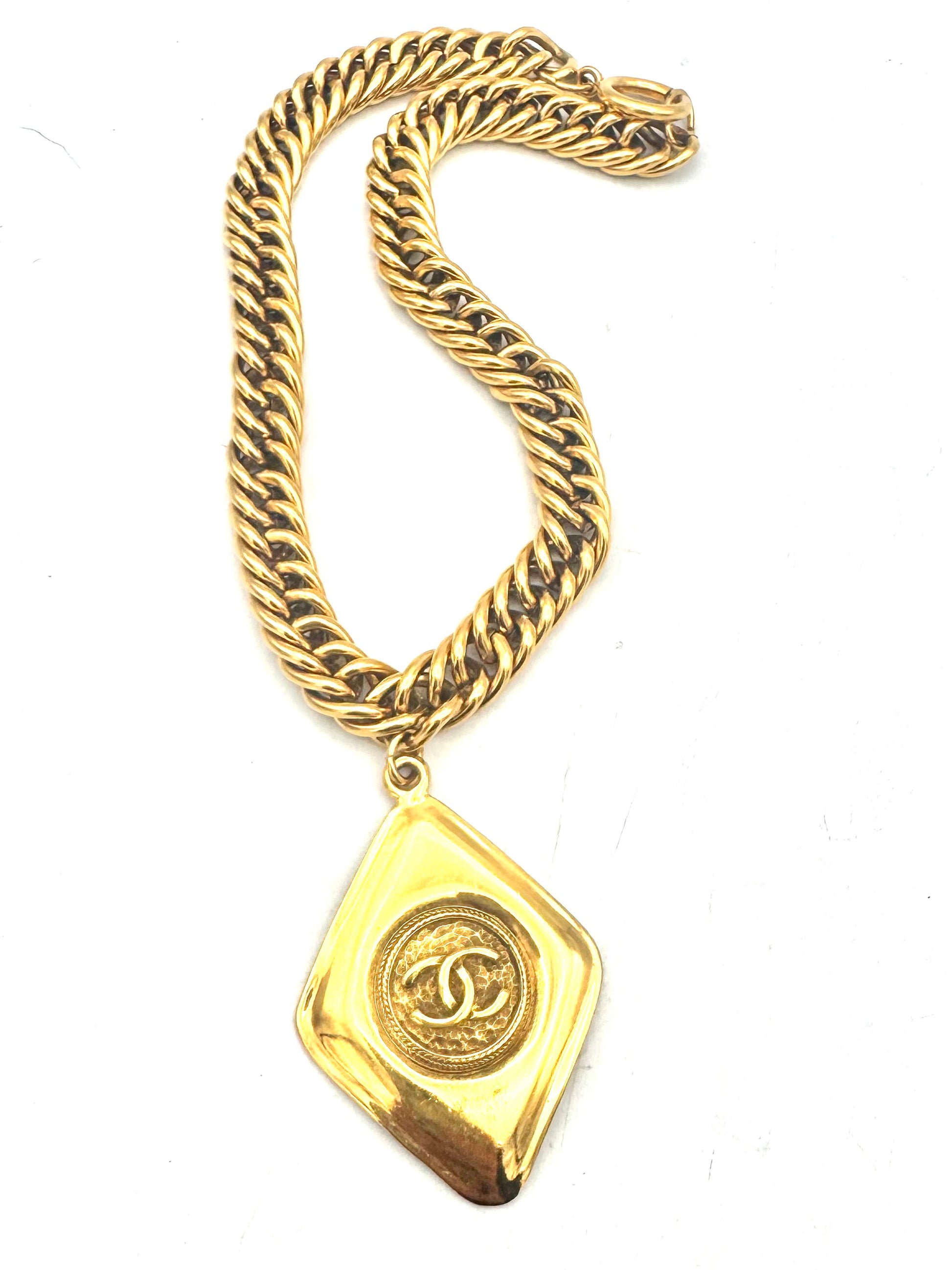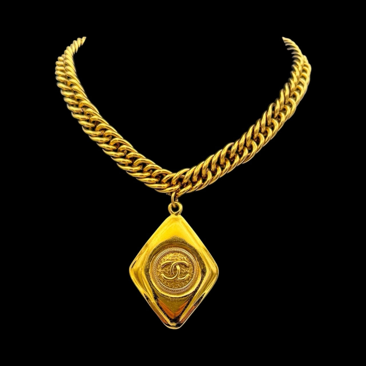 A fully authentic vintage designer chain paired with the original oversized medallion from the same piece, repurposed into a bold, modern statement. Heavy, golden, and unmistakably couture—an iconic component set transformed into a one-of-a-kind Soul Revival masterpiece.