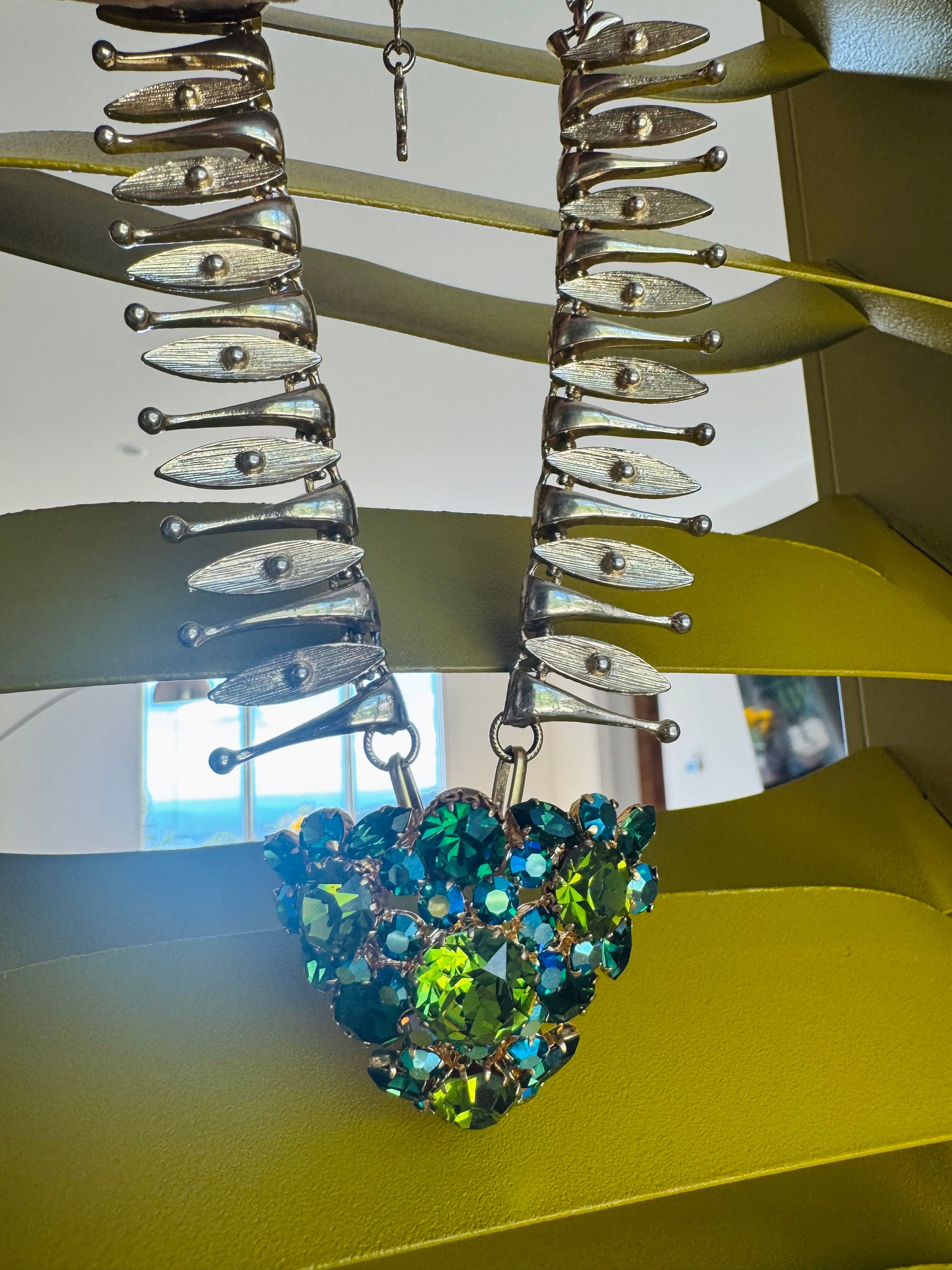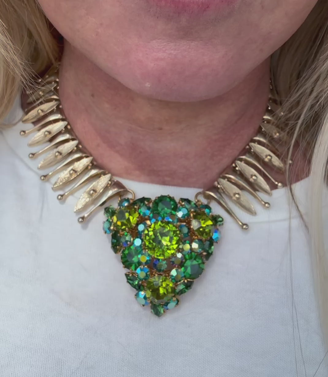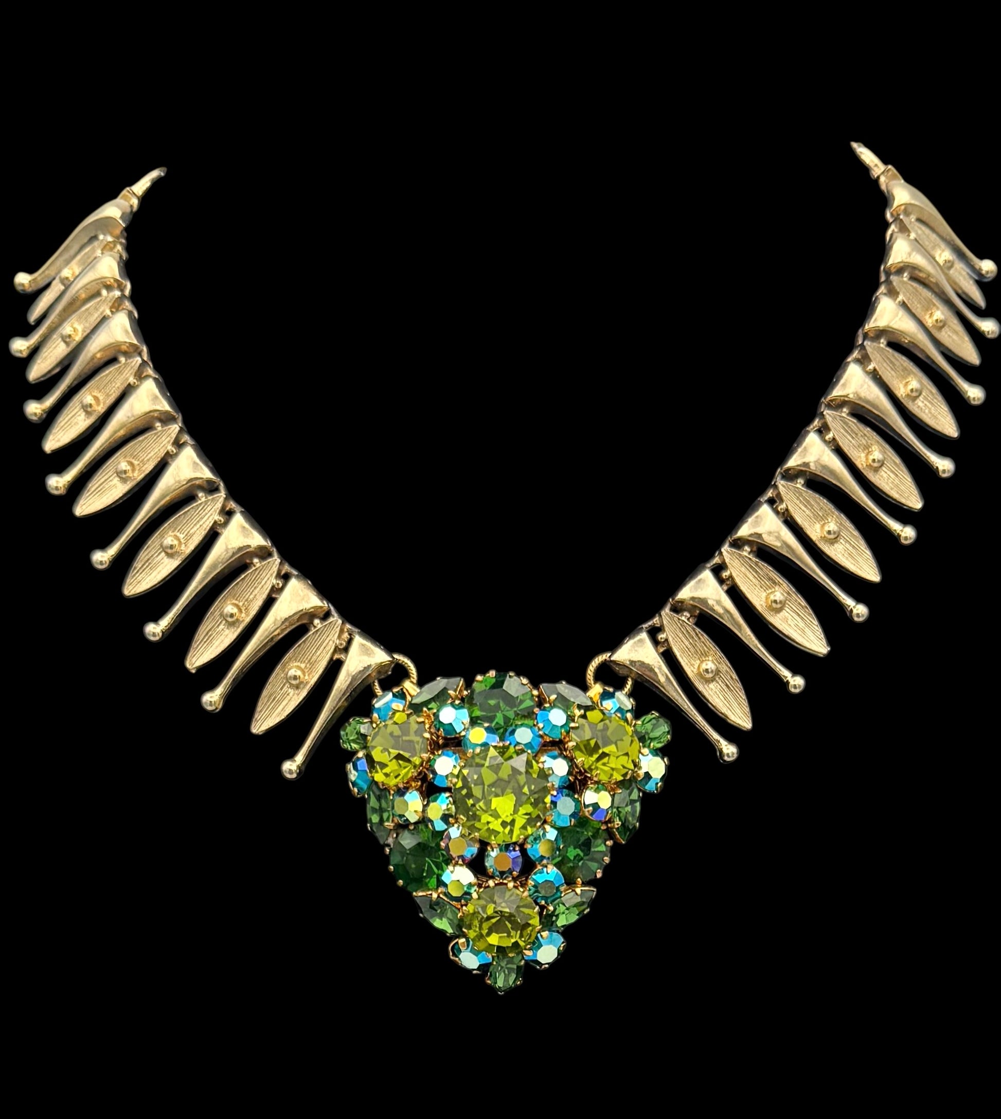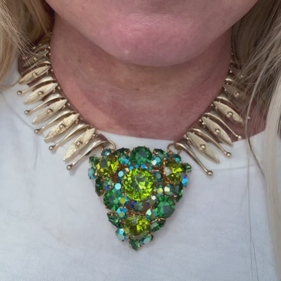A dazzling Austrian rhinestone brooch, bursting with shades of green and aurora borealis brilliance, has been reimagined as the striking centerpiece of a bold 1960’s gold-tone collar. The articulated collar’s sculptural links add movement and drama, perfectly framing the heart-shaped cluster of stones for a statement look that’s both vintage and modern.