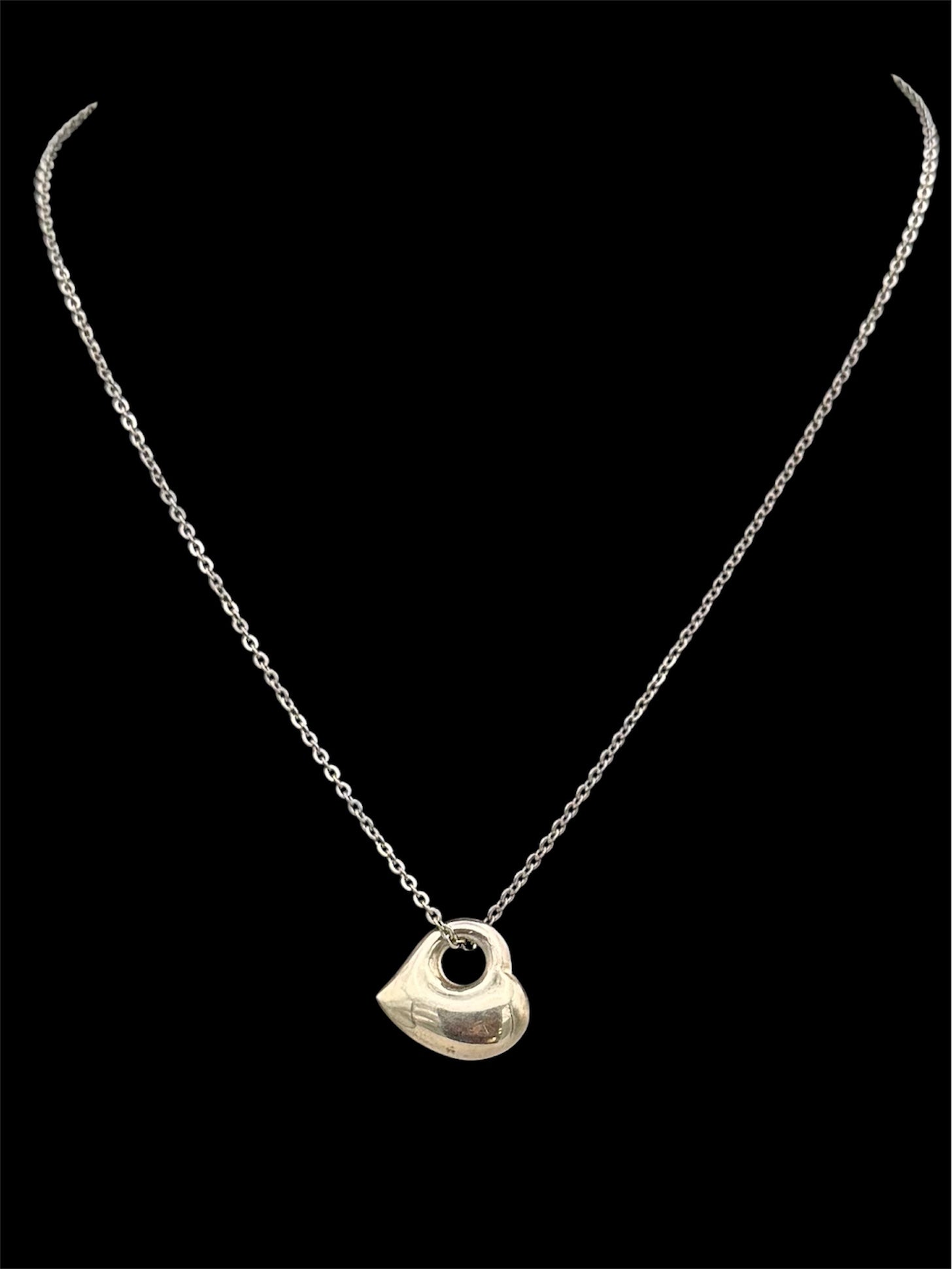 A sterling pillow heart pendant on a stainless steel, silver plated chain.
