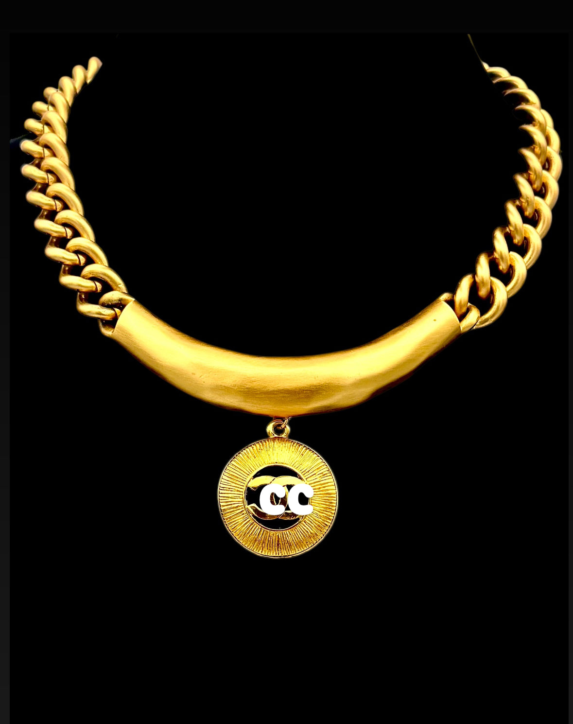 I sourced this classic designer component in Paris at the vintage markets and added it to a beautiful 1980s collar (17.5”) with a brushed gold finish (adjustable toggle closure)