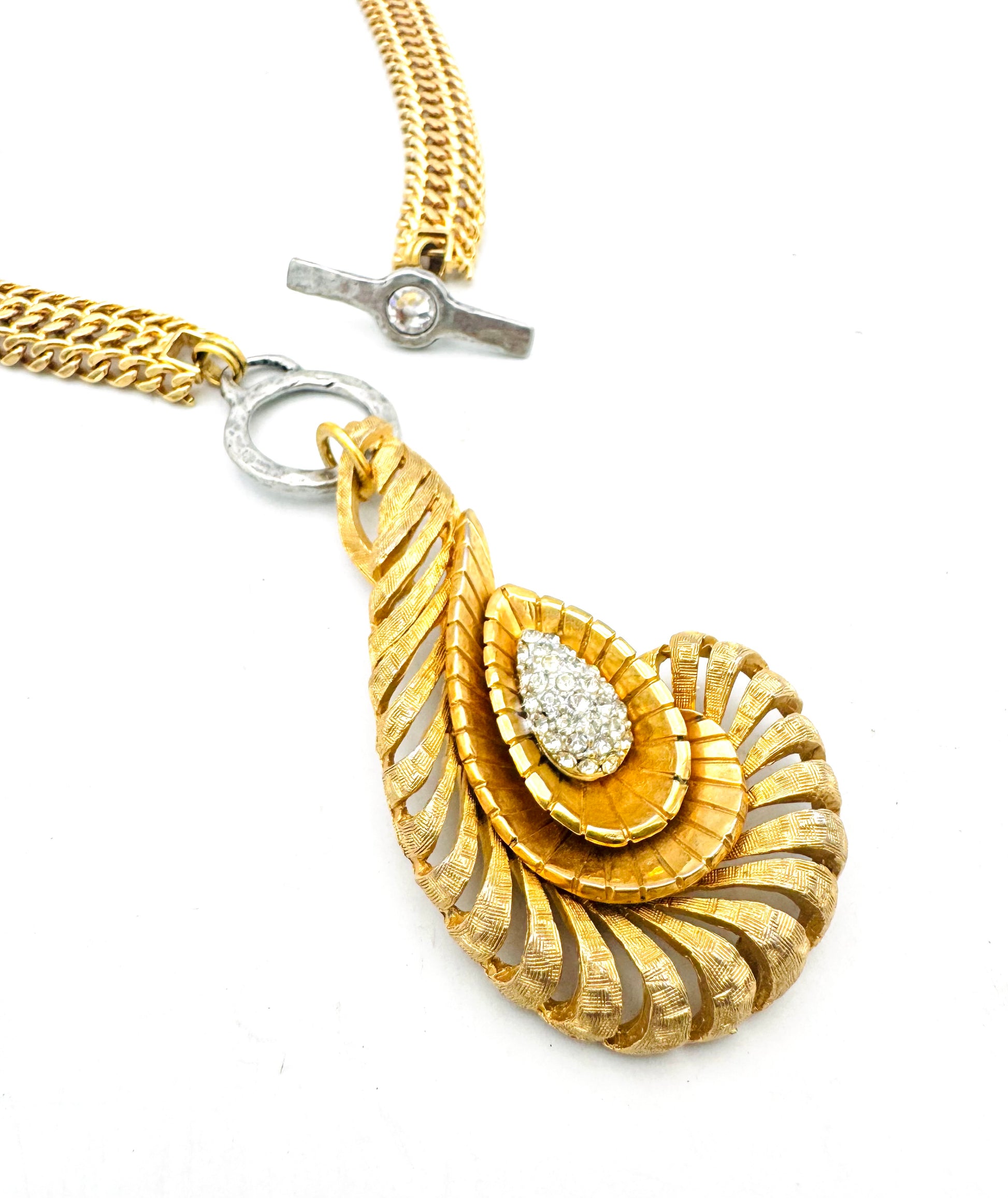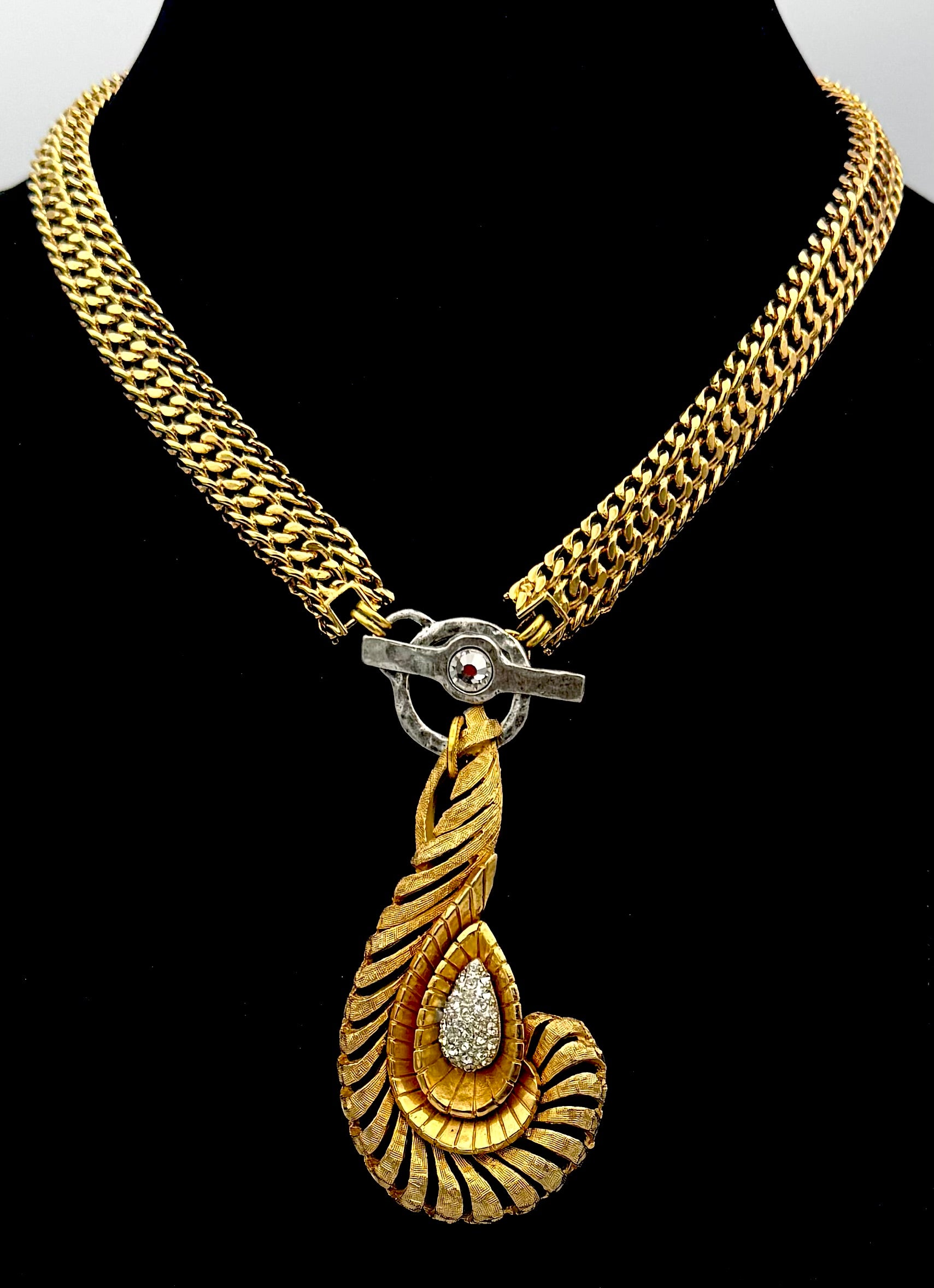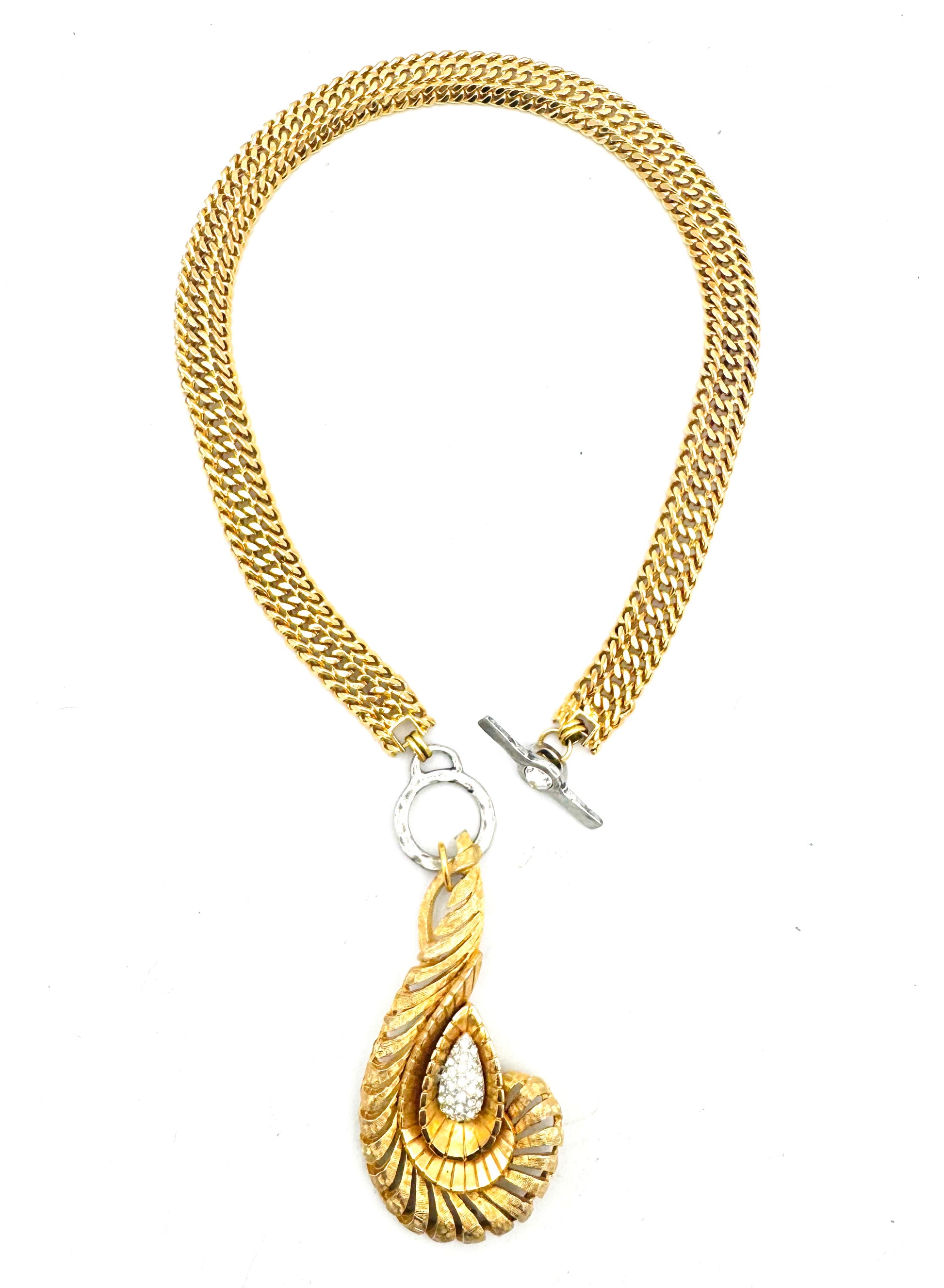 This striking necklace showcases a sculptural gold pendant with fluid, feather-like lines wrapped around a pavé teardrop center. Paired with a bold double-link chain and finished with an artful clasp, it’s a statement of refined luxury and modern elegance.