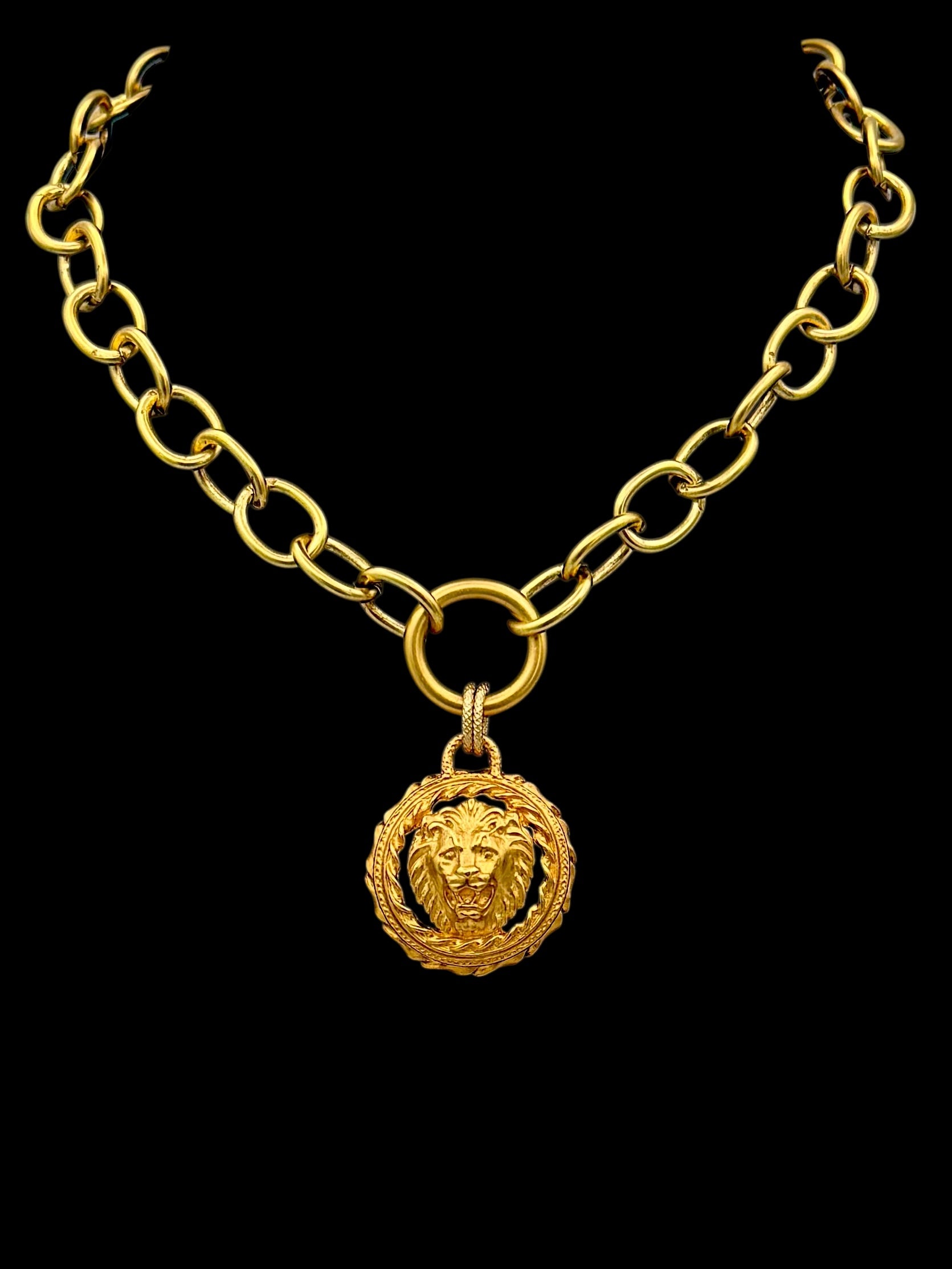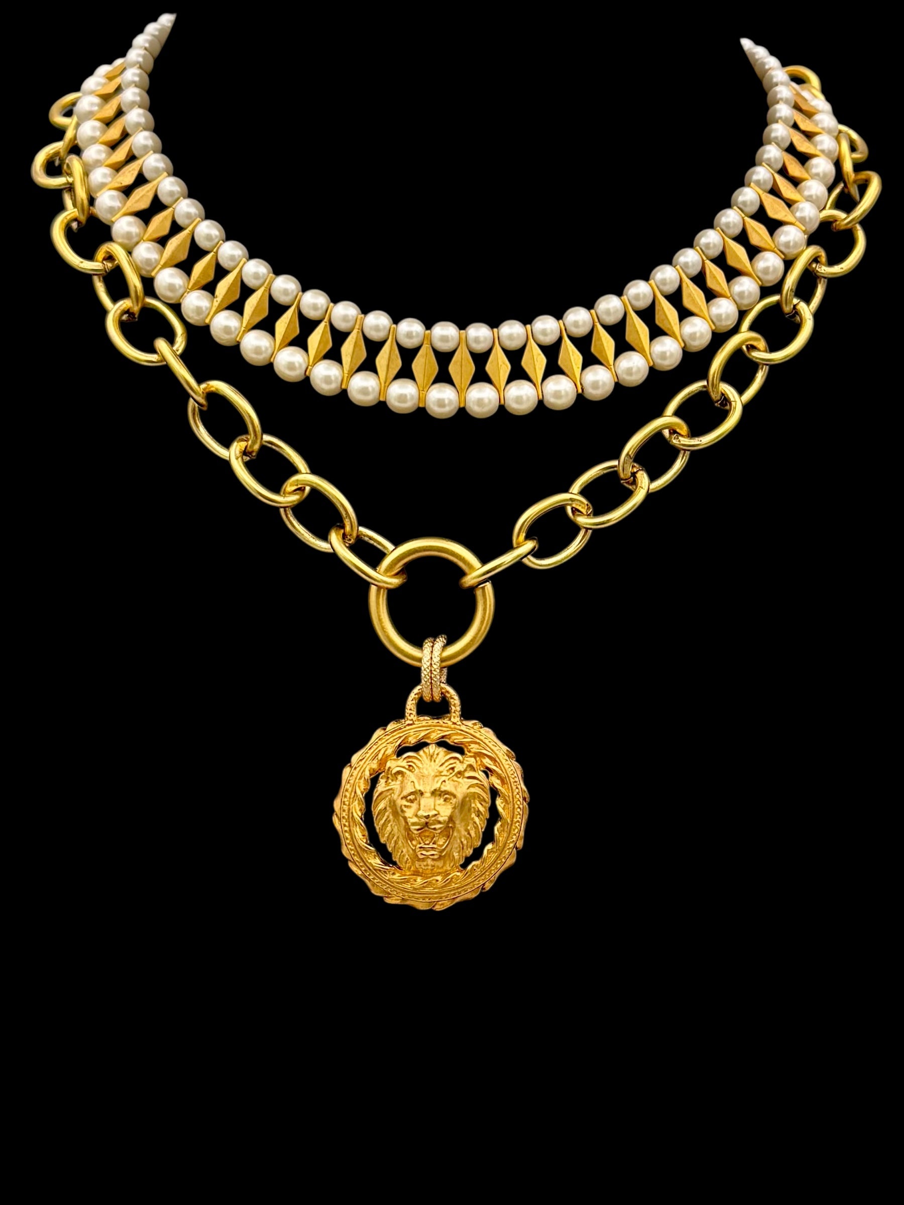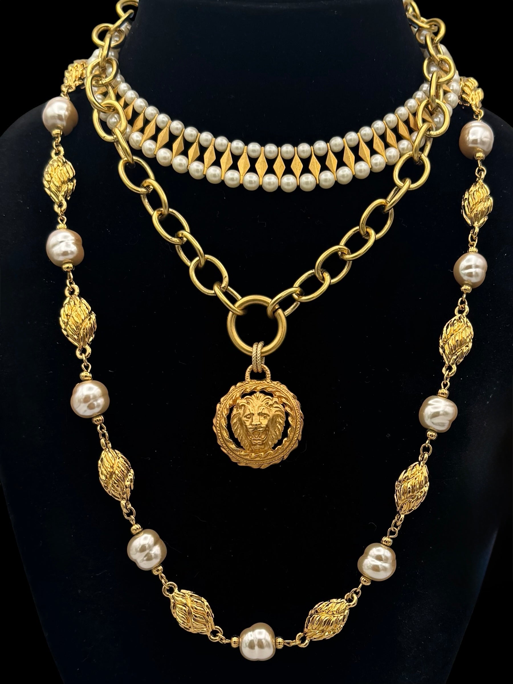 Layered St. John glass pearls and matte gold with a bold lion medallion — versatile, detachable, and statement-making.