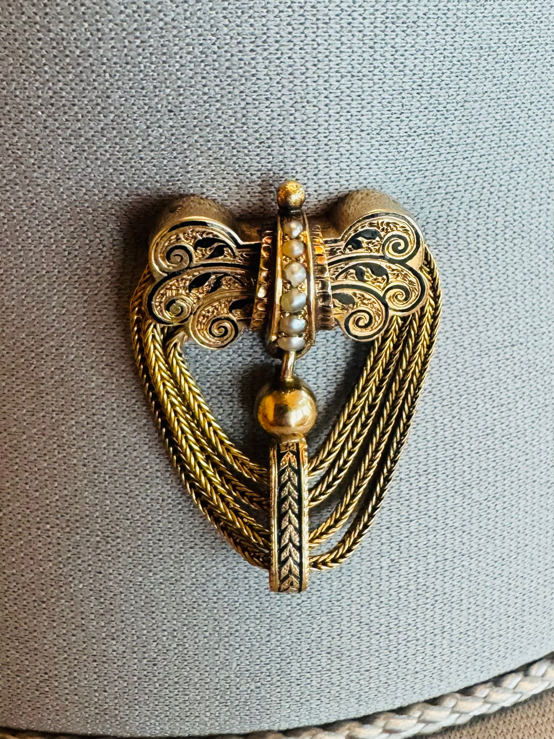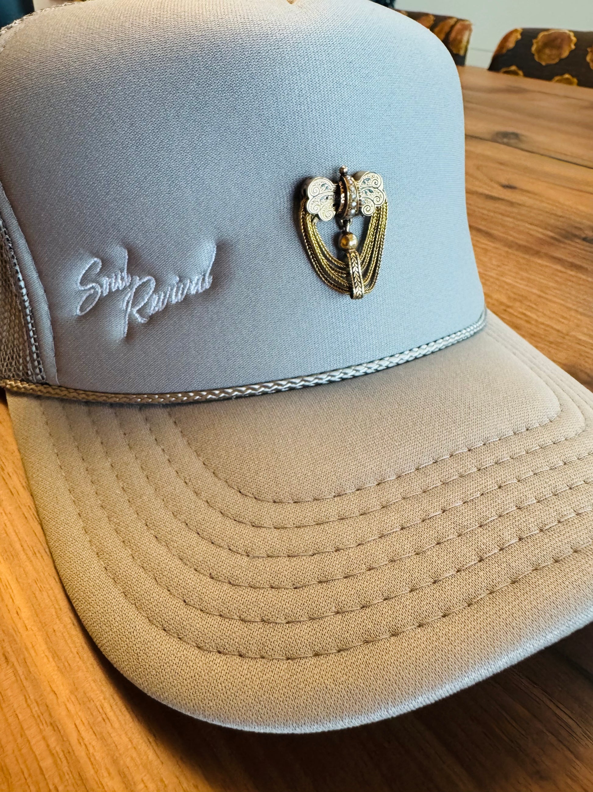 A vintage gold filigree brooch with cascading chains and seed-pearl detailing, reimagined as the focal point of this custom Soul Revival hat — a perfect blend of old-world charm and modern edge.